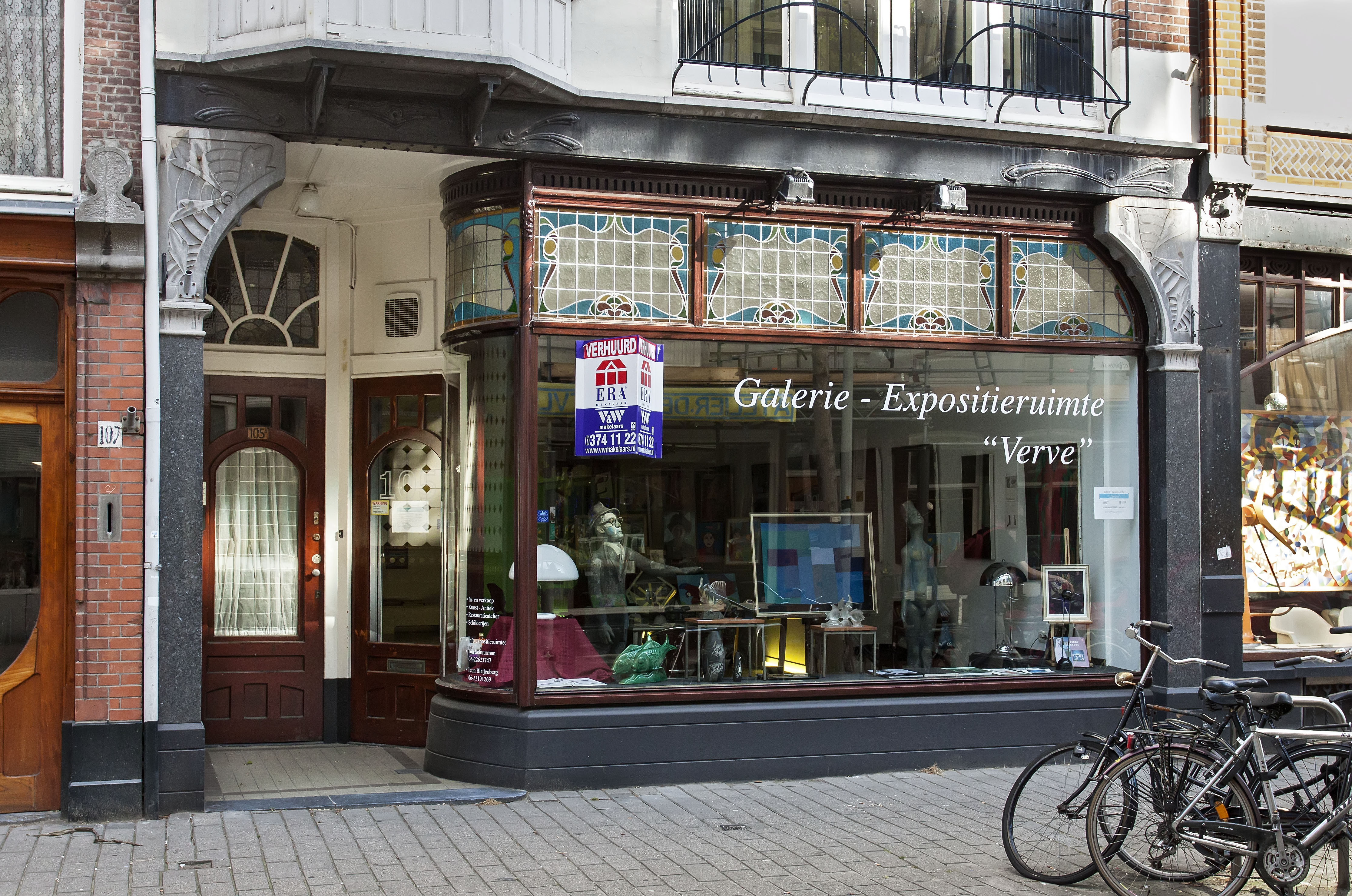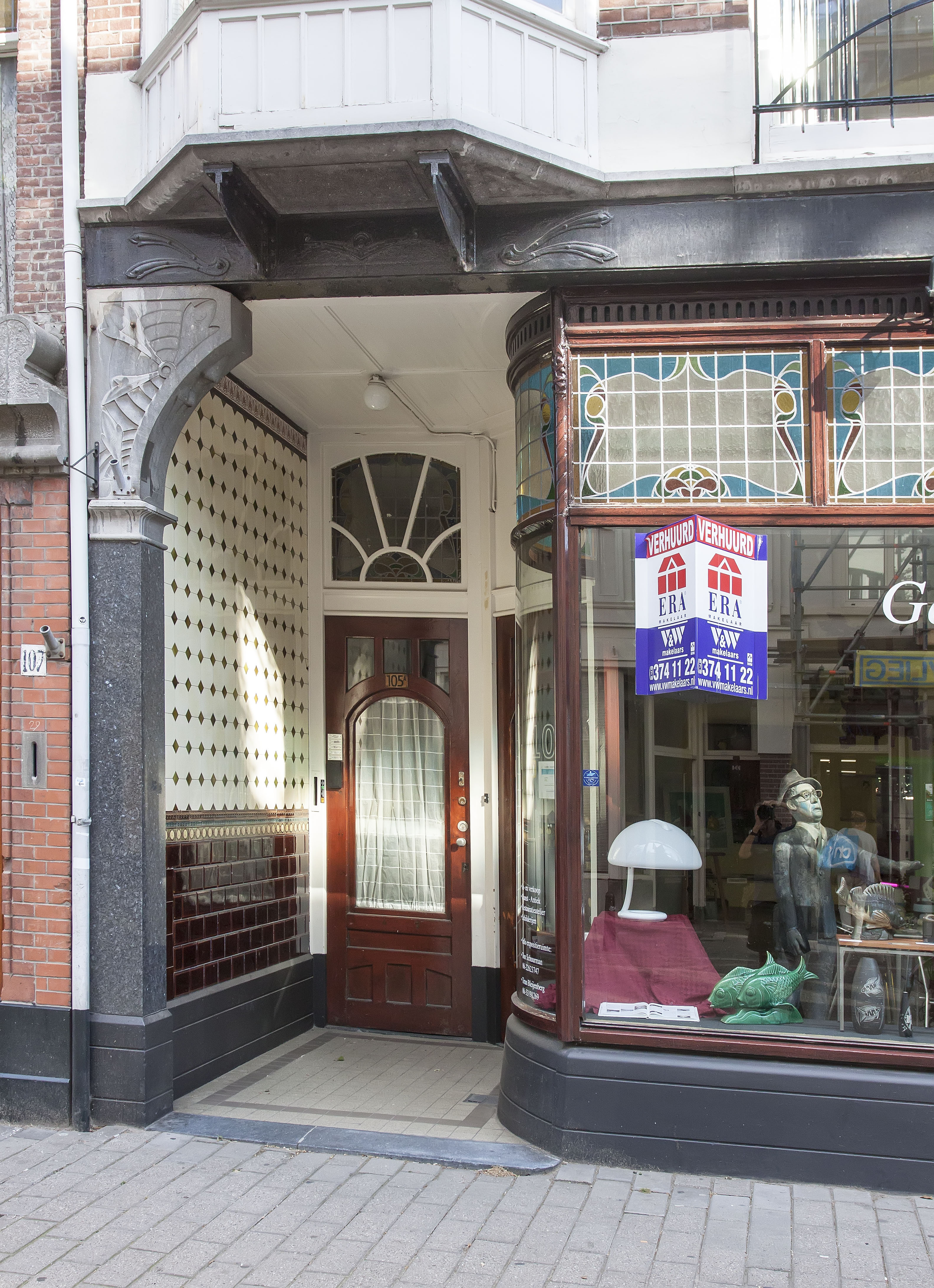 Bijzonder rijk en gaaf bewaard gebleven is de art-nouveauwinkelpui met portiek. De etalage heeft ter plaatse van het portiek een gebogen etageruit. In de bovenlichten is glas in lood aangebracht met ook hier de zwierige vormen van deze bij uitstek decoratieve stijl. Het portiek heeft een geheel met tegels beklede muur. In de natuurstenen penanten en ijzeren puibalk zijn ook versieringen aangebracht.