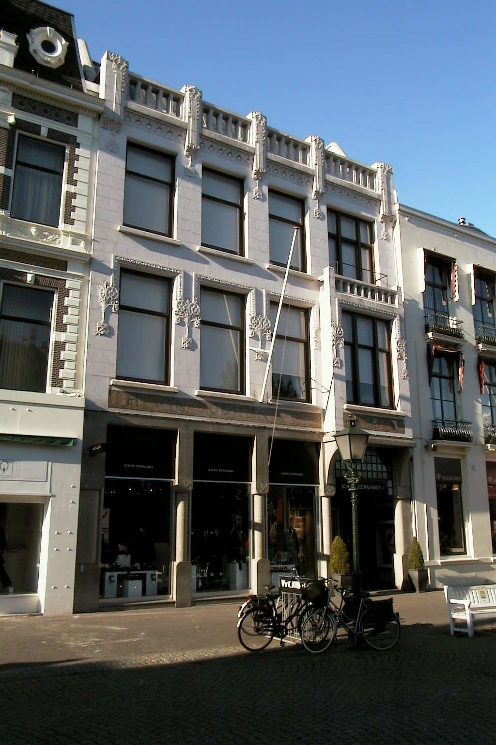 Pand op rechthoekige plattegrond bestaande uit parterre en twee verdiepingen onder een met leien gedekt zadeldak met de nok evenwijdig aan de rooilijn langs de voorzijde. De rijke met natuursteen beklede voorgevel is vier vensterassen breed en wordt bekroond door een forse, eveneens in natuursteen uitgevoerde open balustrade. De rechteras bevat de enigszins uitstekende ingangspartij met balustrade boven de eerste verdieping. Rondom de vensters en in het fries bevinden zich rijke Art Nouveau decoraties met naturalistische bladmotieven. Op de verdiepingen zijn houten schuifvensters. De brede houten pui in het portiek van de ingangstravee bezit bovenlichten met kleine roedeverdeling. De houten paneeldeur rechts in deze ingangspui heeft gietijzeren sierroosters. Winkelpui met gepolijste, granieten zuilen waartussen de etalagevensters met bovenlichten voorzien van een kleine roedenverdeling. Boven de pui is een later toegevoegd tegeltableau met het opschrift "H. van Dooren & Cie" en drie wapenschilden van Amsterdam, Den Haag en Utrecht. In het interieur zijn onderdelen uit de bouwtijd bewaard gebleven; ondermeer plafondbalken met bewerkte sleutelstukken op de begane grond. Waardering.