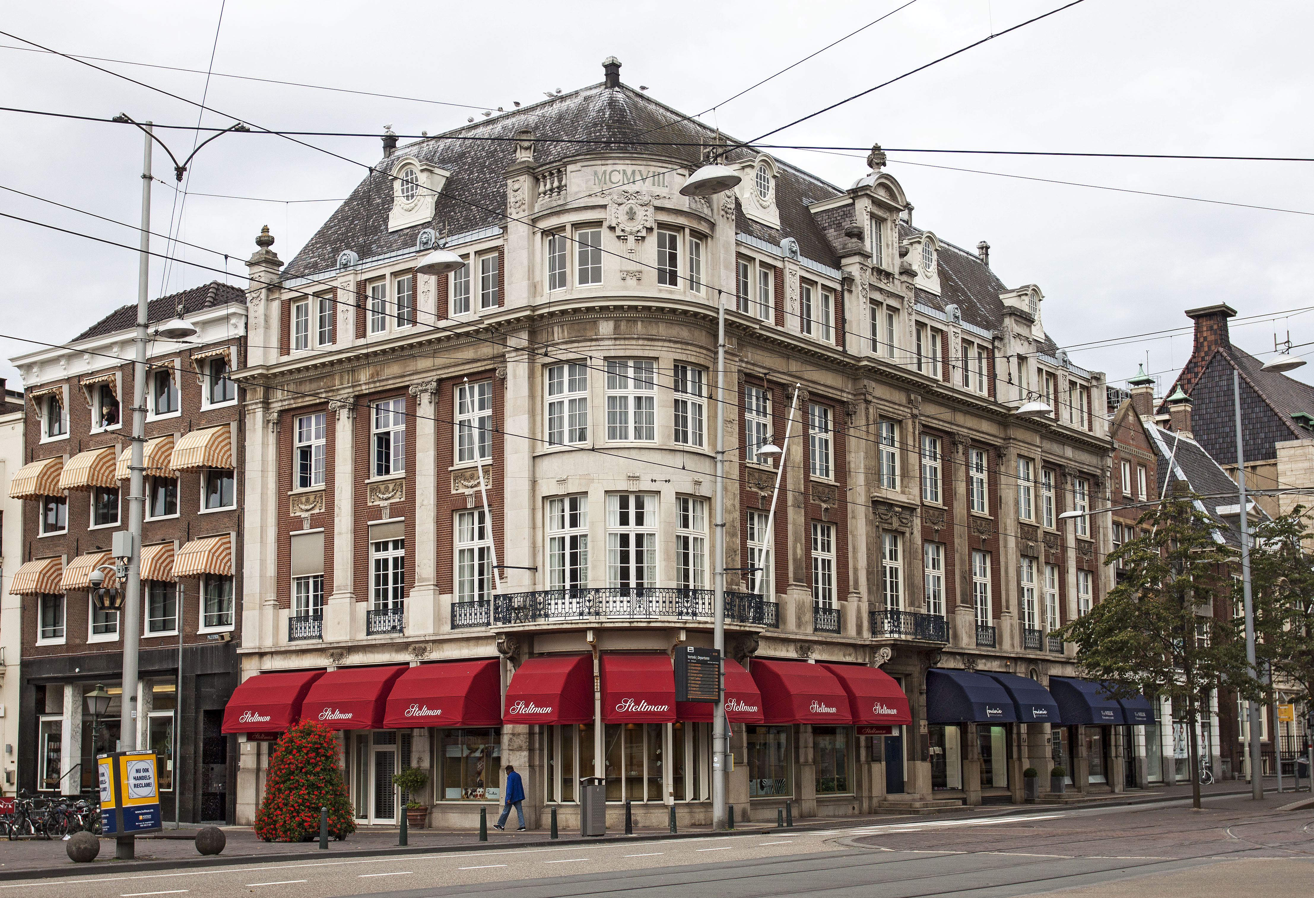 Omschrijving: Het grotendeels in baksteen opgetrokken pand beslaat een rechthoekige plattegrond en telt aan de Kneuterdijk acht en aan de Plaats drie traveeën, terwijl de hoektravee met hoofdingang op de begane grond is afgerond. Het pand bezit vier bouwlagen, waarvan de bovenste als attiekverdieping is opgevat onder een met leien gedekt schilddak, waarin dakkapellen en oeil-de-boeufs. Natuursteen is overvloedig toegepast. De parterre met etalageramen is in dit materiaal gebosseerd. Voorts zijn de hoekpartij en de beide smalle risalieten in de Kneuterdijkgevel met natuursteen bekleed. De vensterassen worden gemarkeerd door vanaf de parterre opgaande natuurstenen pilasters met Jonische kapitelen. De met beeldhouwwerk en maskerkoppen versierde pilasters tussen de vensters van de attiekverdieping en de pilasters die de hoeken van de gevels markeren dragen siervazen. Onder de vensters van de tweede verdieping en in de attiek boven de afgeronde hoek bevindt zich festoenwerk in neo-Lodewijk XVI-stijl. De linker risaliet in de gevel aan de Kneuterdijk zet zich in de attiekverdieping voort als een natuurstenen dakkapel met gebogen fronton en siervazen. De vensters bezitten een kruisvormige indeling met stolpramen en kleine roedenverdeling. Voor de vensters van de eerste verdieping zijn smeedijzeren raamhekken in neo-Lodewijk XVI-stijl aangebracht. Voor de vensters in deze verdieping op de hoek loopt een balkon met balkonhek, gedragen door gebeeldhouwde voluutconsoles.