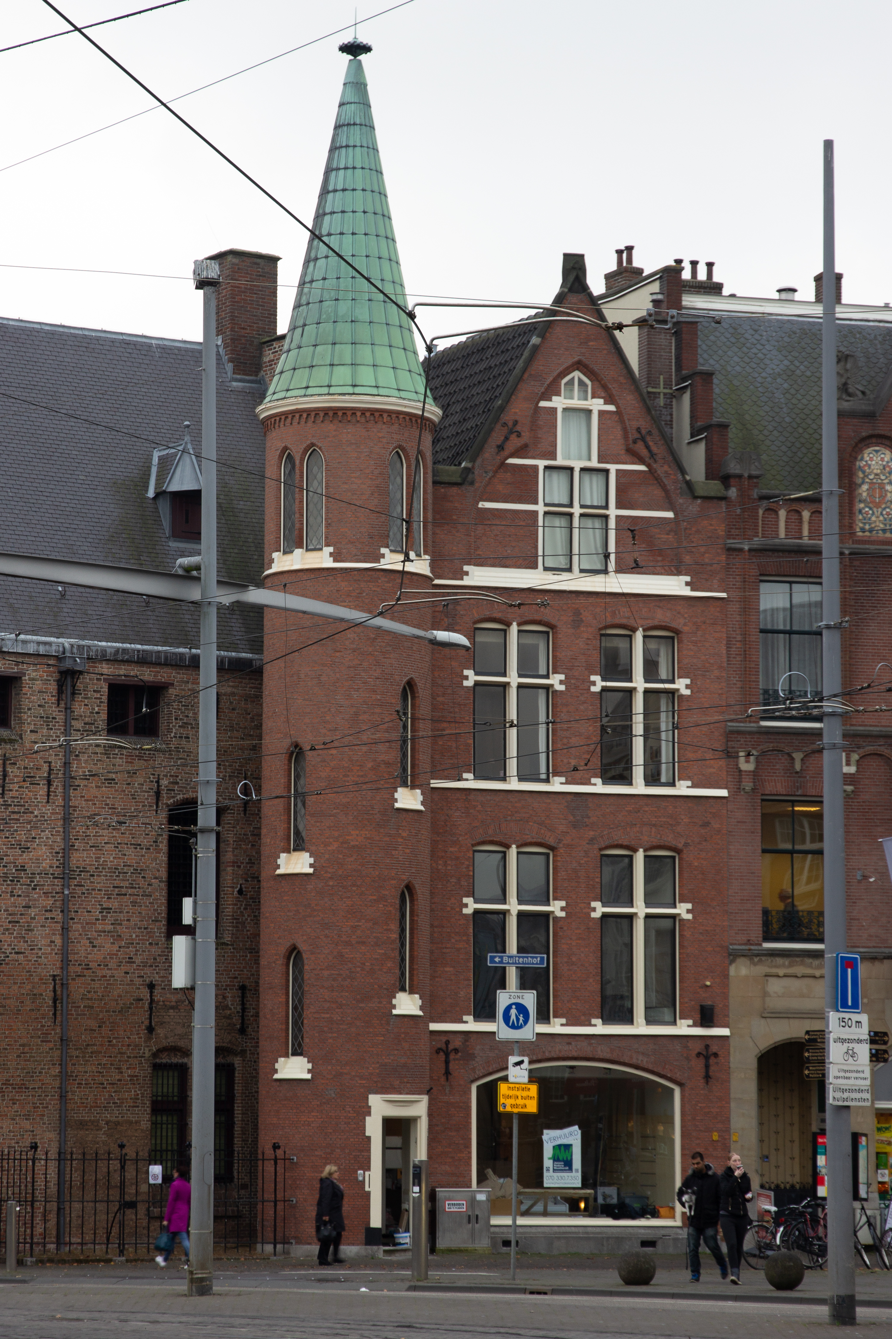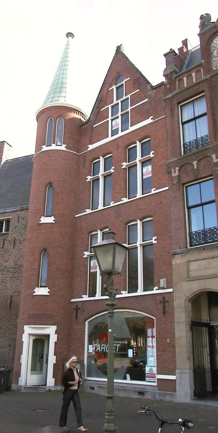 Pand op onregelmatige plattegrond bestaande uit parterre en twee verdiepingen onder een met pannen gedekt zadeldak met de nok loodrecht op de rooilijn, twee vensterassen breed en een links tegen de voorgevel aangebouwde ronde traptoren. De bakstenen puntgevel heeft in de verdiepingen vensters met natuurstenen kruiskozijnen en hoekblokken. Op de begane grond is de oorspronkelijke woonhuispui vervangen door een winkelpui met segmentvormige beëindiging. De verdiepingen worden door natuurstenen waterlijsten gescheiden. De met gemetseld vlechtwerk en banden versierde geveltop vertoont een driepasboog waarbinnen een zoldervenster met kruiskozijn en zolderluik. De ronde bakstenen traptoren heeft smalle spitsboogvensters met glas-in-lood. De ingang op de begane grond is gevat in een hardstenen omlijsting. De toren wordt gedekt door een conische spits met koperen dekking. Waardering.