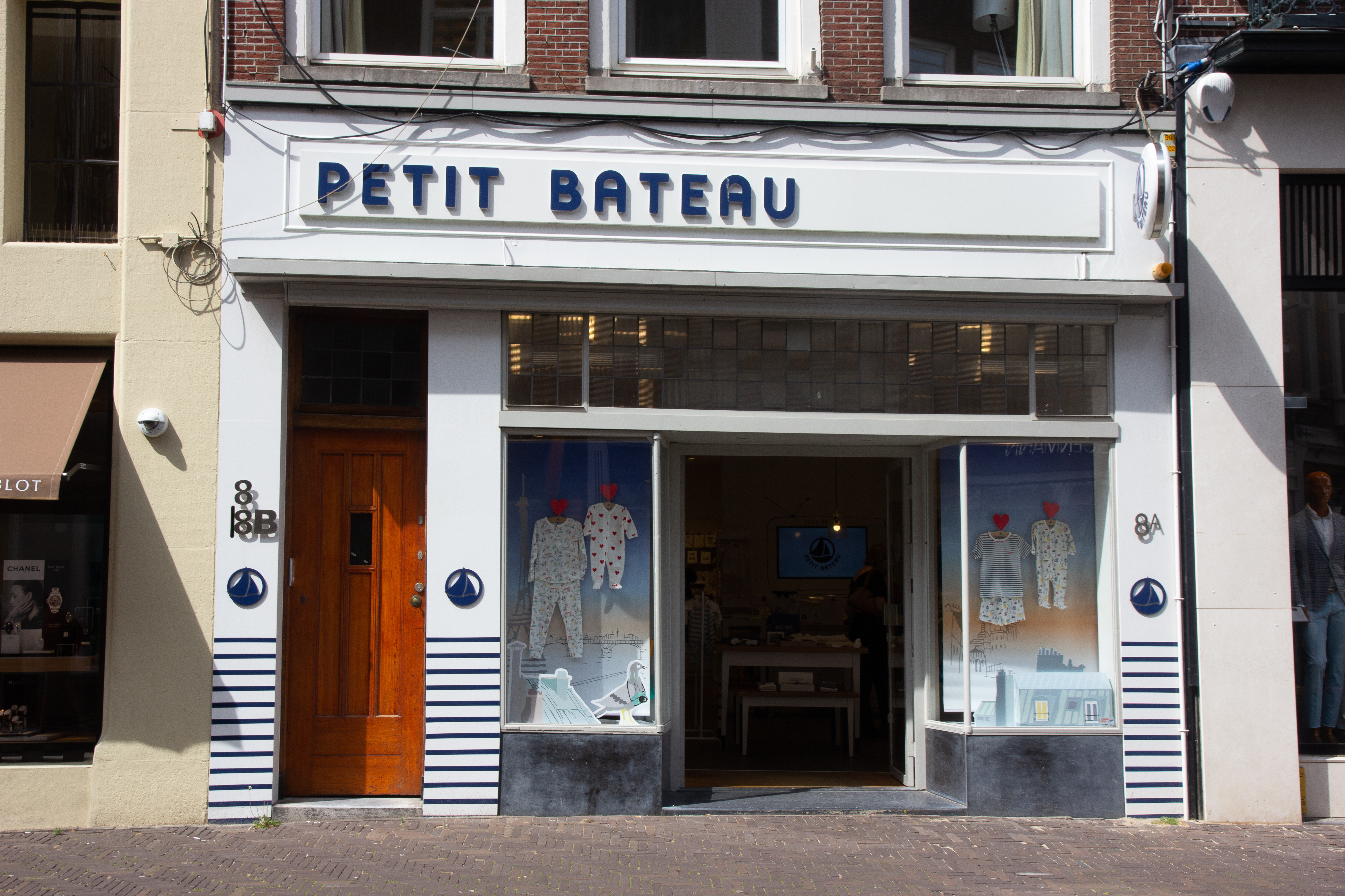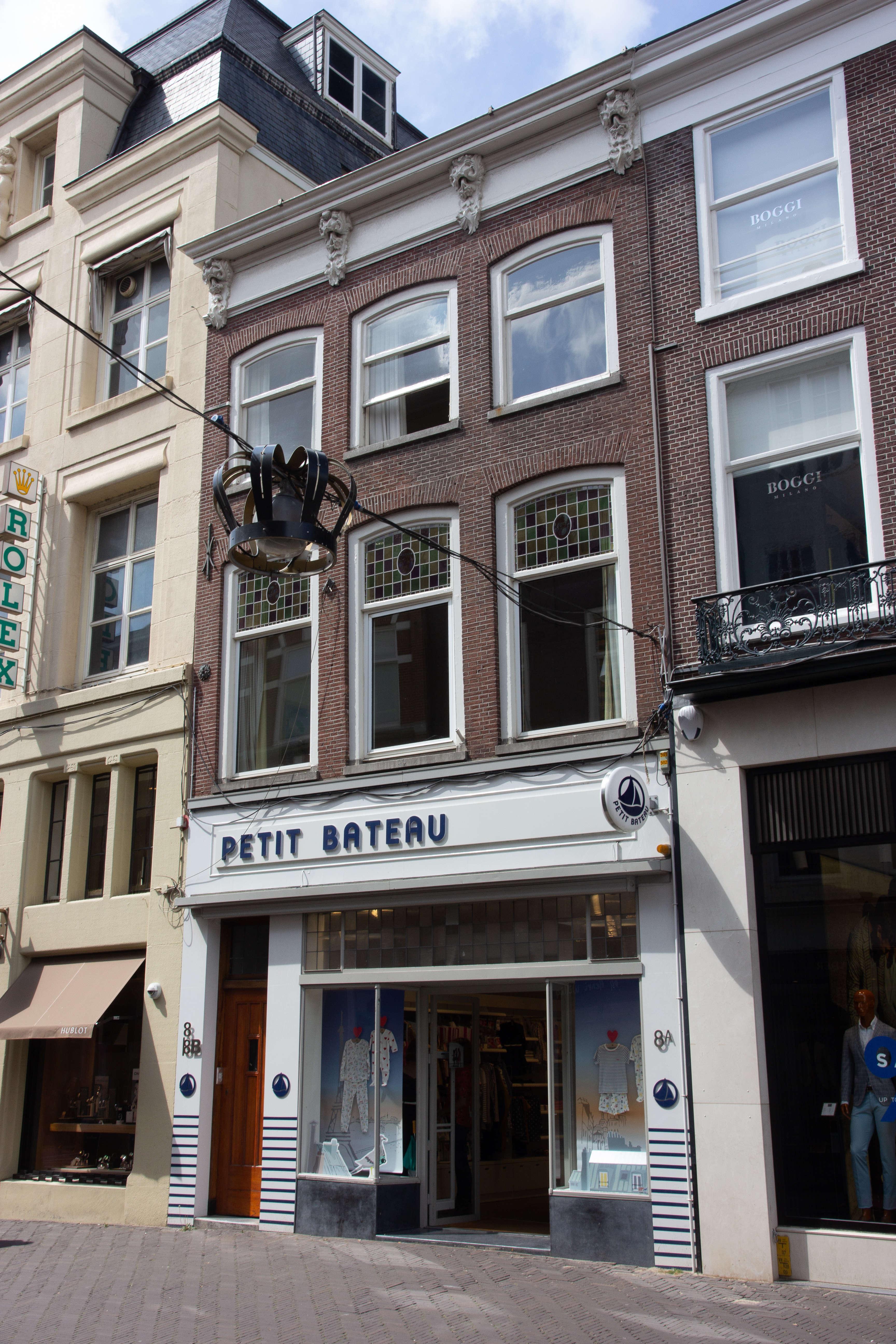 De Plaats, vroeger de ‘voorplaetse’ van het Buitenhof, is een van de oudste pleinen in Den Haag. De Plaats was al in de late middeleeuwen aan beide zijden vrijwel volledig bebouwd. Na de verwoesting van Den Haag in 1572 door de Spanjaarden is de bebouwing hersteld met hergebruik van oude kelders en bouwmuren. Het pand Plaats 8 is een goede representant van de oudere bebouwing aan het plein met een middeleeuwse oorsprong en een voor de binnenstad kenmerkend transformatieproces. Het pand telt drie bouwlagen, waarvan de bovenste voorheen de zolder betrof. De achttiende-eeuwse voorgevel is boven de winkelpui uitgevoerd in schoonmetselwerk. De getoogde kozijnen zijn voorzien van schuiframen. De kroonlijst wordt gedragen door een viertal consoles in rococostijl. Het pand bezit nog een oudere gewelfde kelder die zowel onder de Plaats als onder een van de achtergelegen aanbouwen doorloopt. De winkelpui is in 1936 aangebracht naar ontwerp van J.L.M. de Wolf. Deze is uitgevoerd met voor de tijd kenmerkende slanke stalen kozijnen boven een met natuursteen beklede plint. De stalen puien werden geleverd door de firma P.G. Duchateau en zonen uit Schiedam.