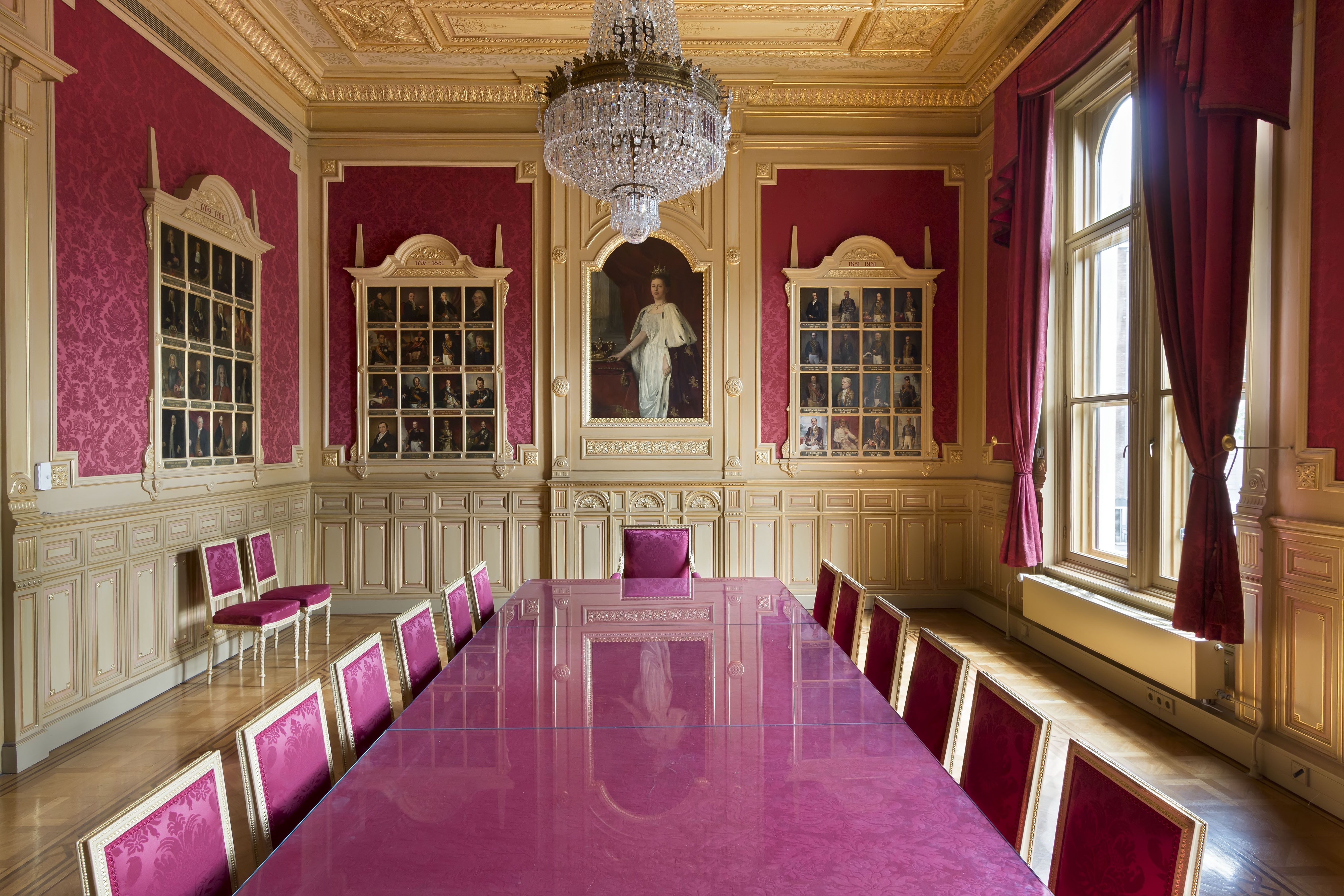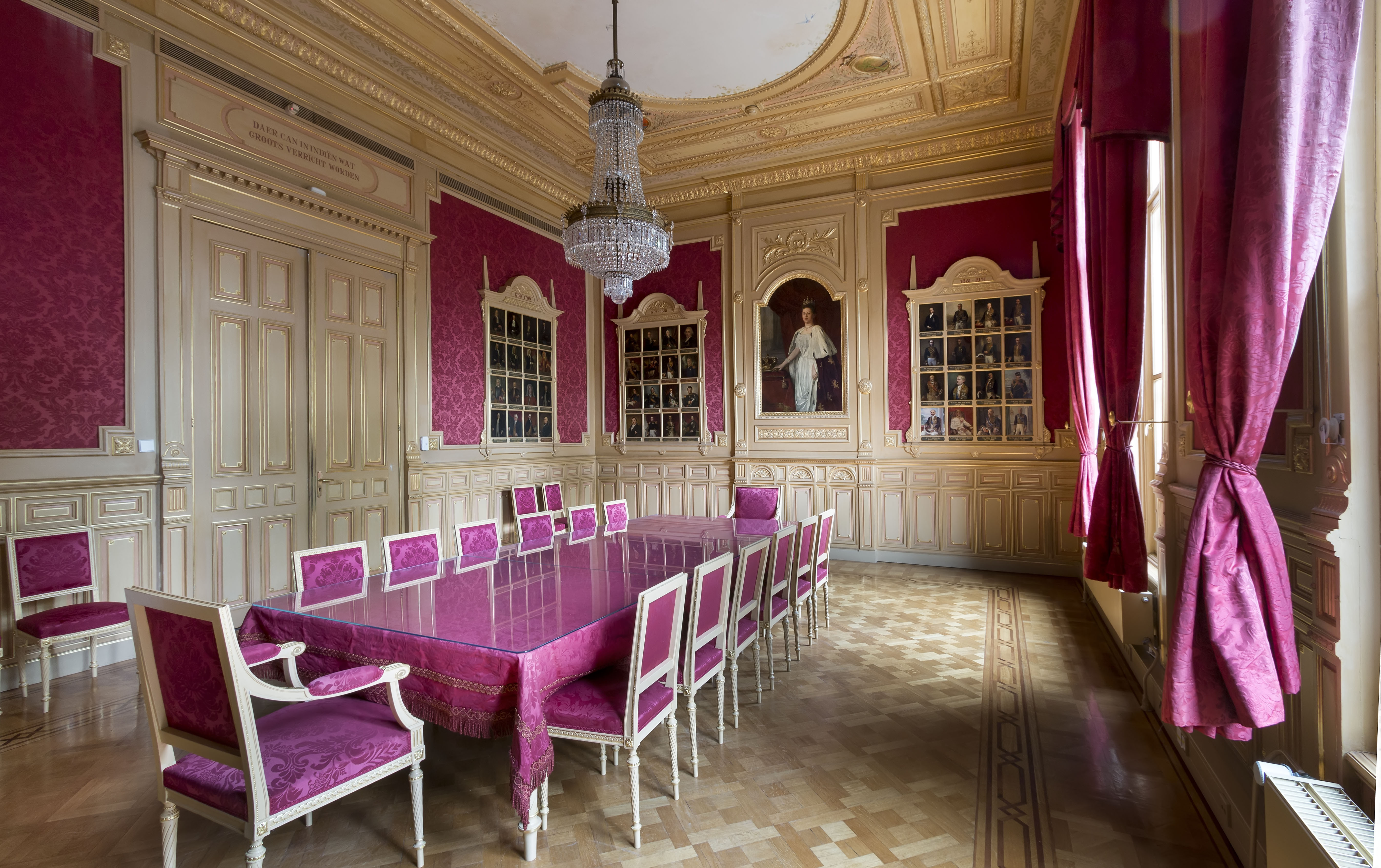 De dubbele toegangsdeuren hebben een versiering met panelen. In deze zaal voorts een langwerpige tafel met 19 stoelen in Lodewijk XVI-STIJL en portretten van alle gouverneurs-generaal van het v.m. Nederlands Indie tussen 1610 en 1945, in neo-barokke omlijstingen. Kristallen kroonluchter.