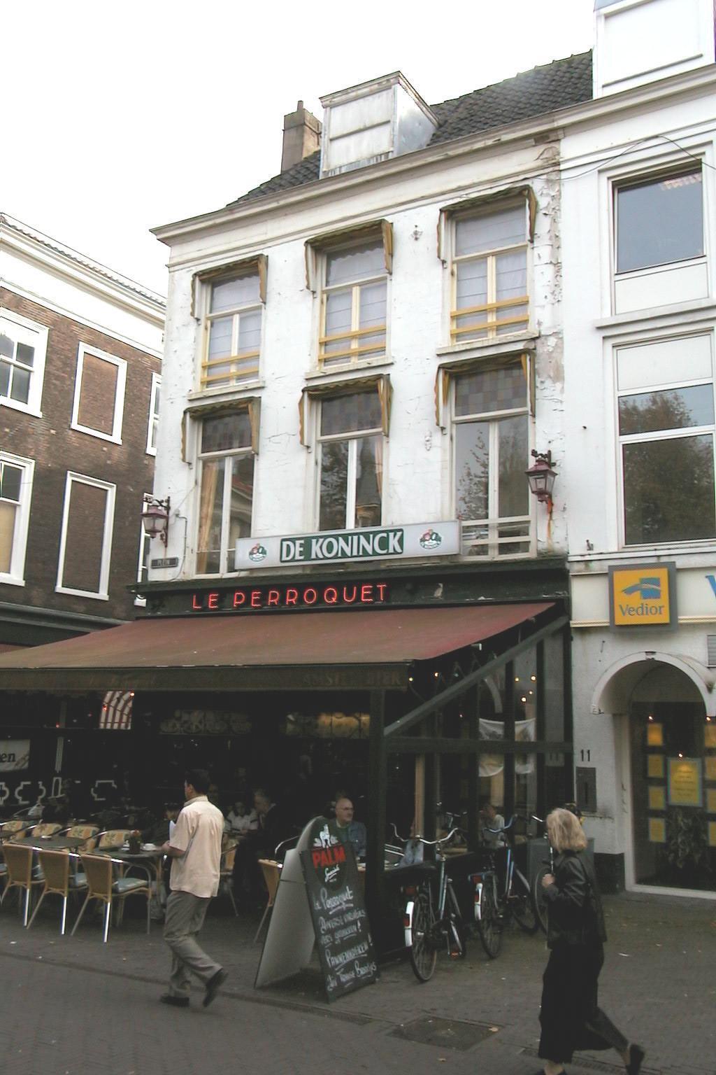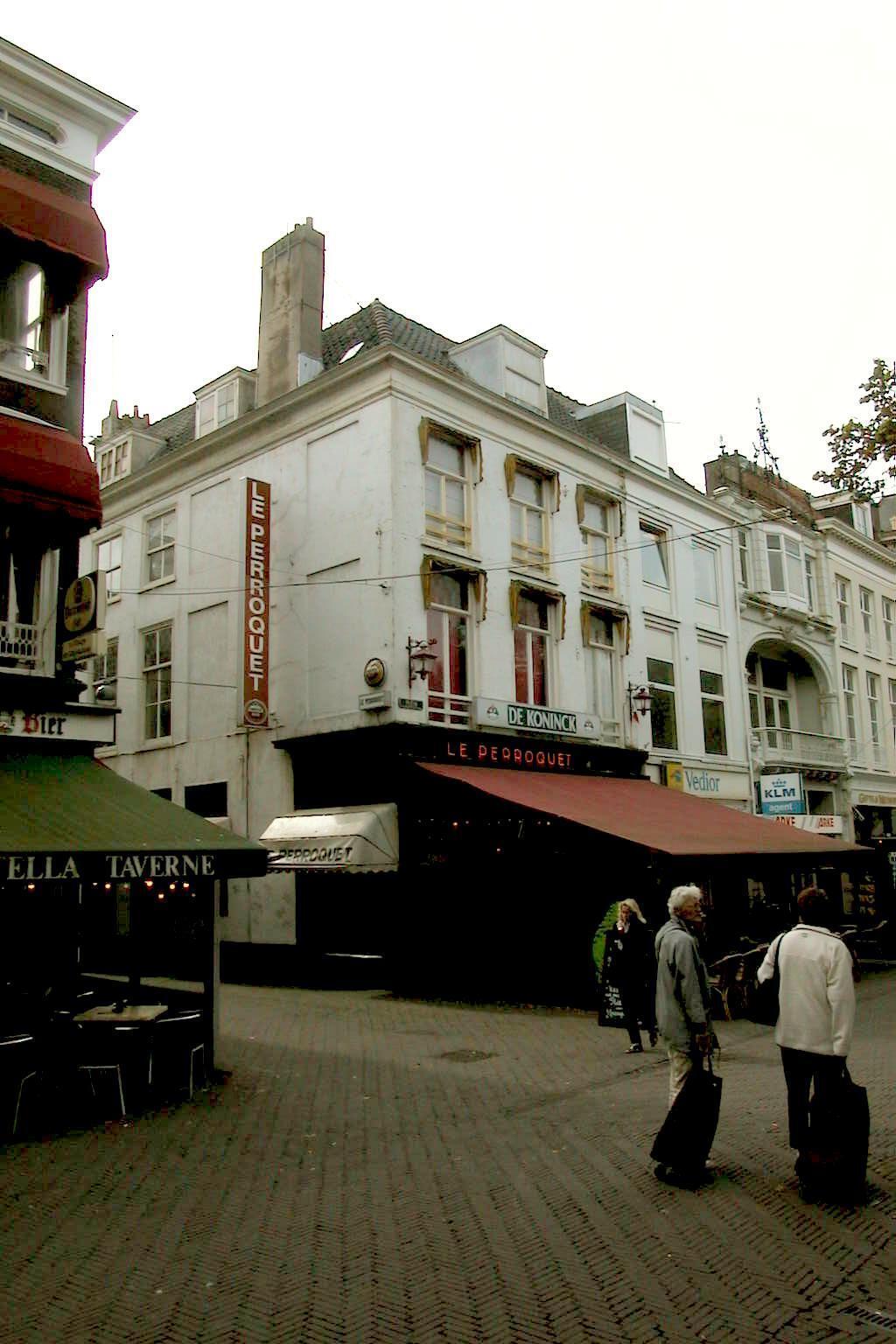 17de-eeuws pand met gepleisterde lijstgevels en een omlopend schilddak. Het uit drie bouwlagen met kap bestaande hoekpand heeft in hoofdzaak een 19de-eeuws uiterlijk. In de zijgevel aan de Korte Houtstraat 17de-eeuwse lelieankers. De vensters in de voorgevel hebben gietijzeren raamhekjes uit het derde kwart van de 19de eeuw. De houten cafépui dateert uit de jaren rond 1920 en heeft in de bovenlichten glas-in-lood in Art Déco stijl.