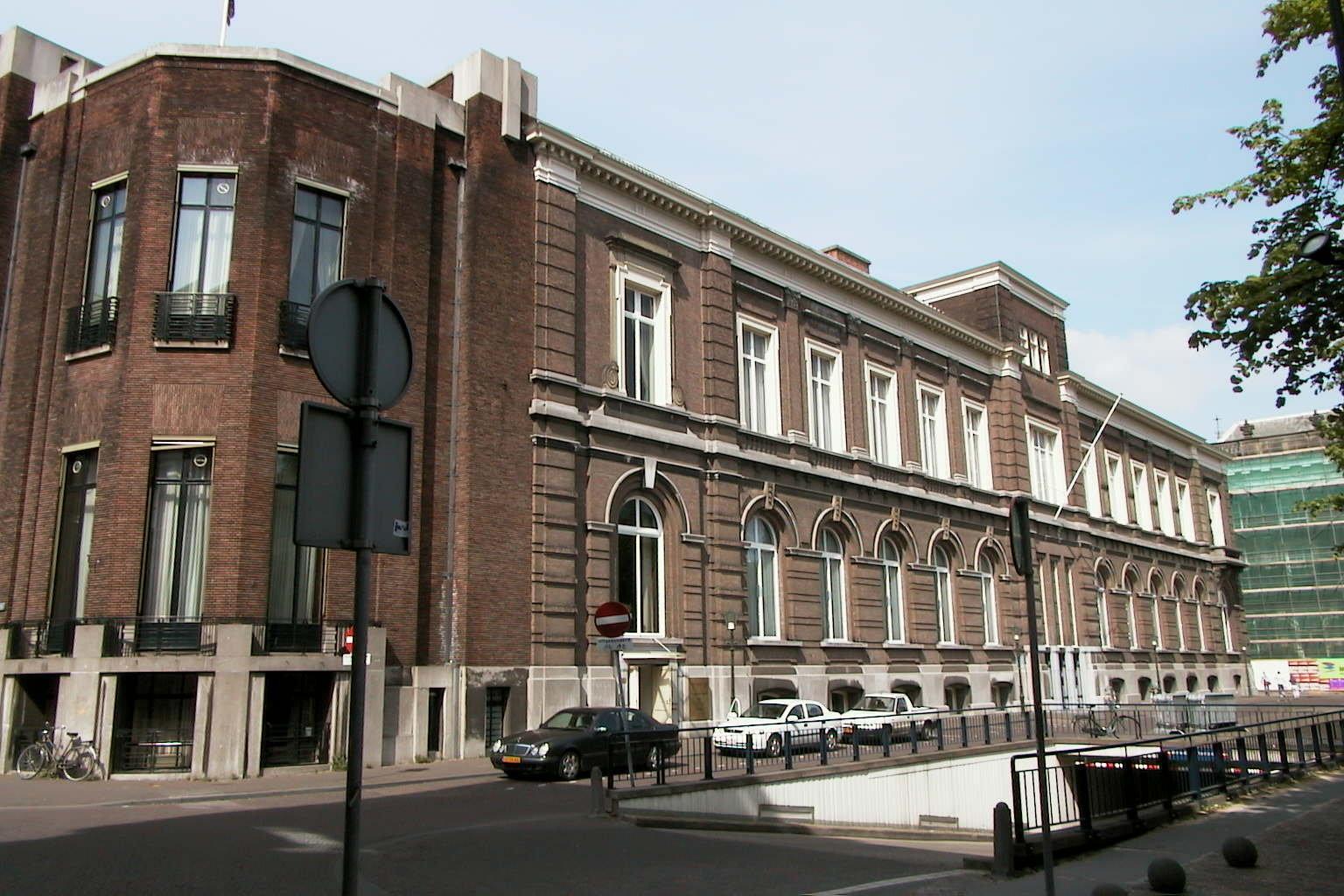Fors, 12 traveeën breed bouwwerk van twee verdiepingen op een laag basement, geblokte pilaster tussen de vensters en om de ingangstravee - in 1856 gebouwd door architect C.Outshoorn, door architect J.Mutters in 1900 uitgebreid.