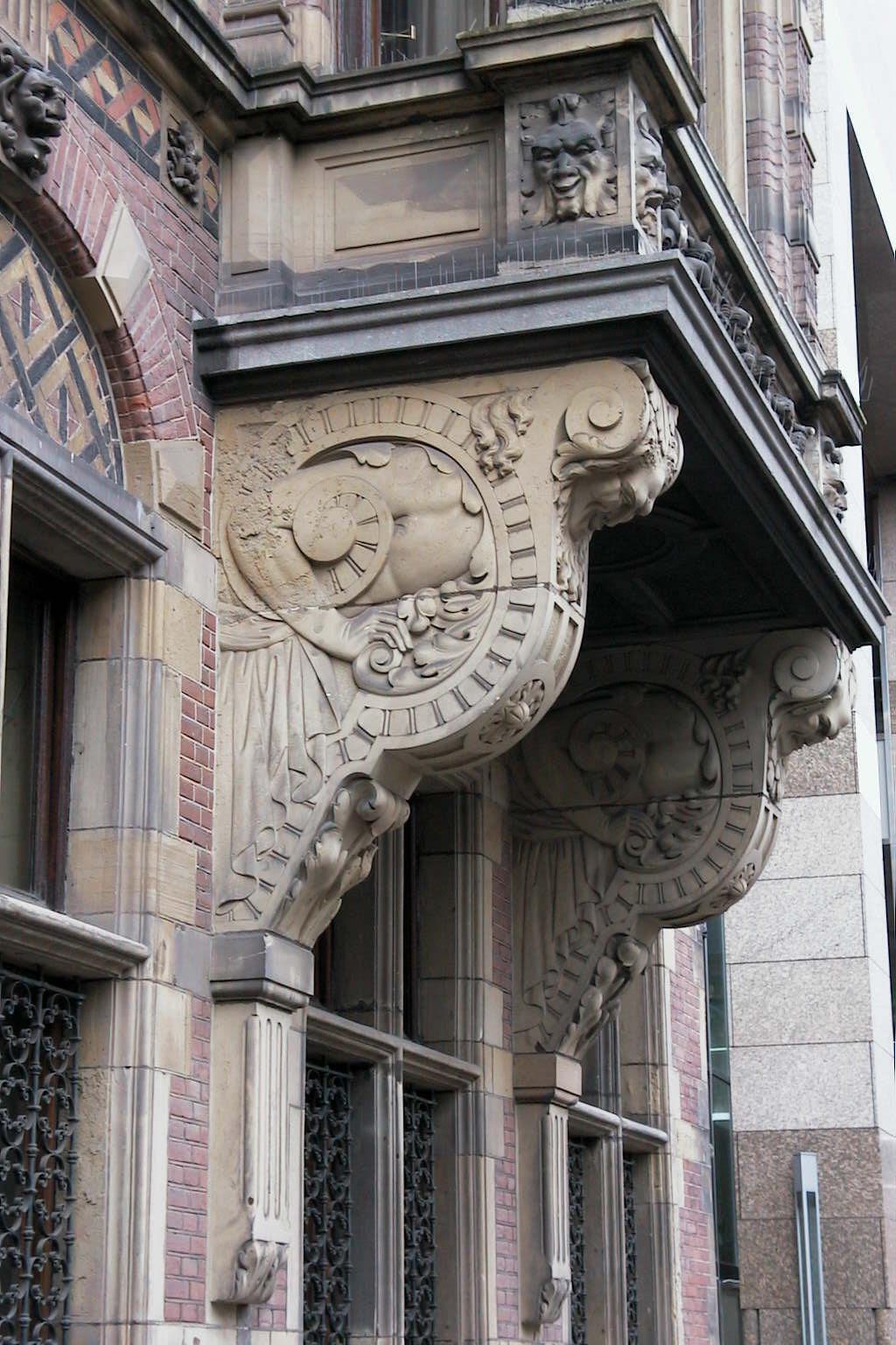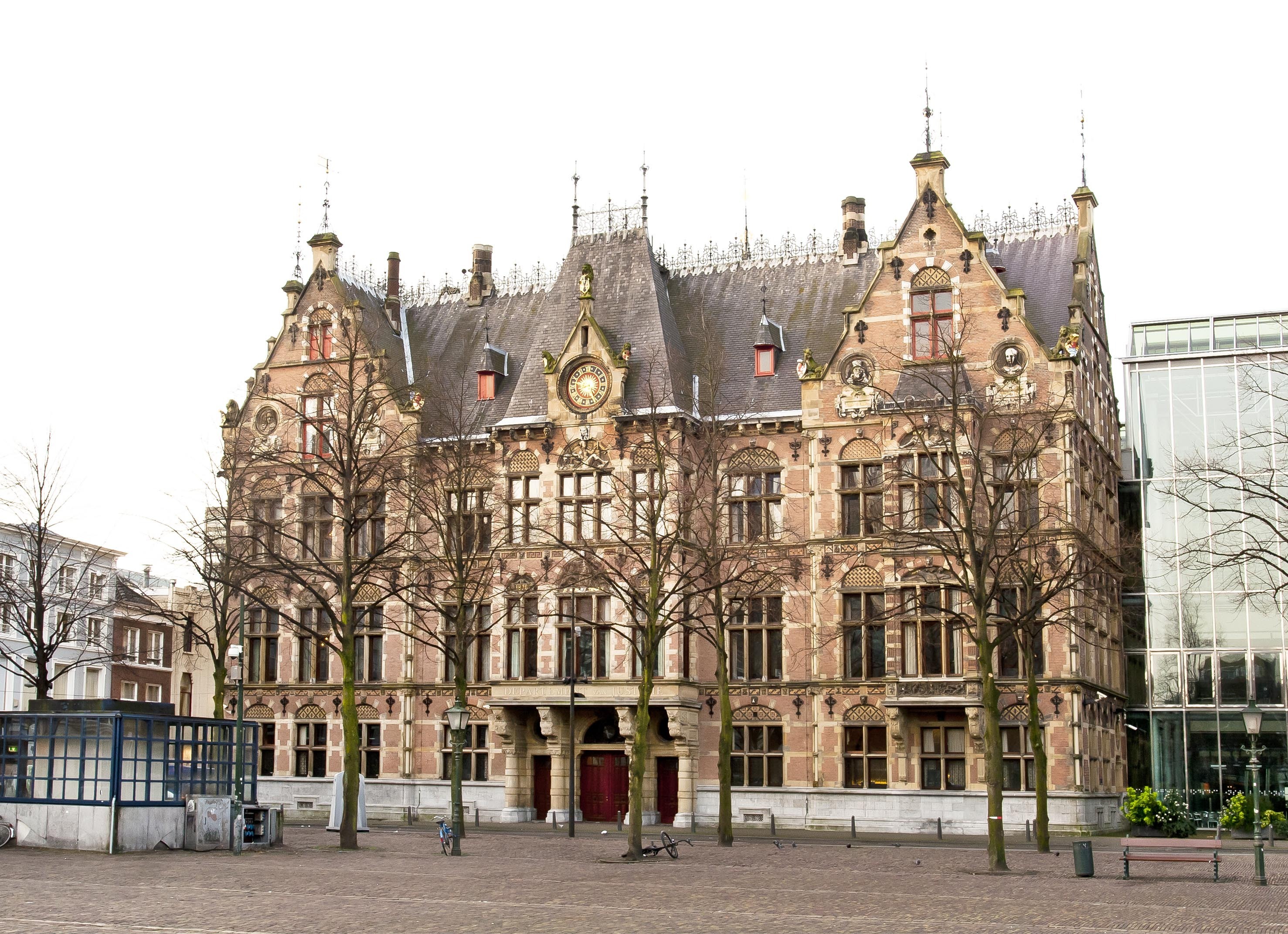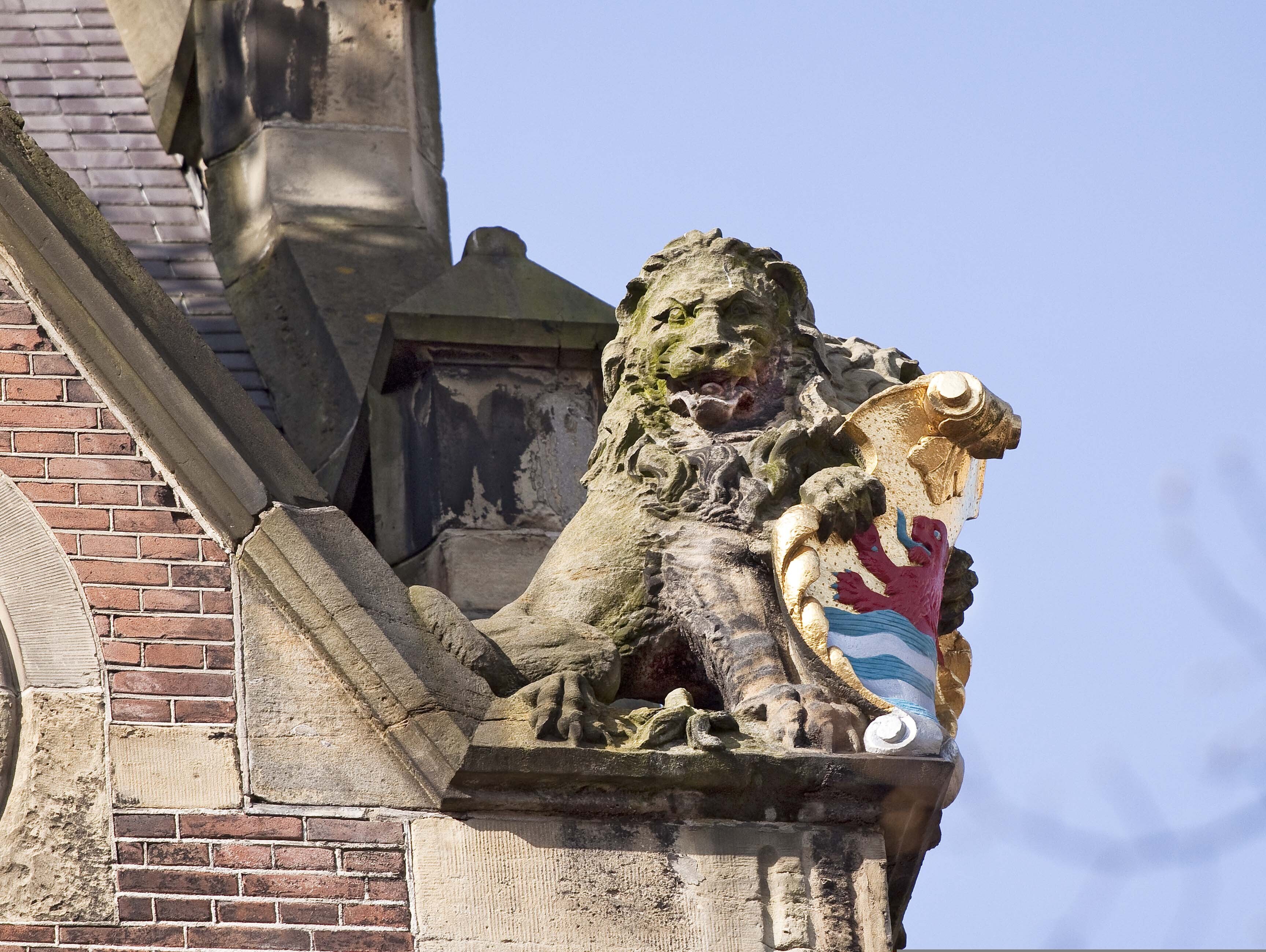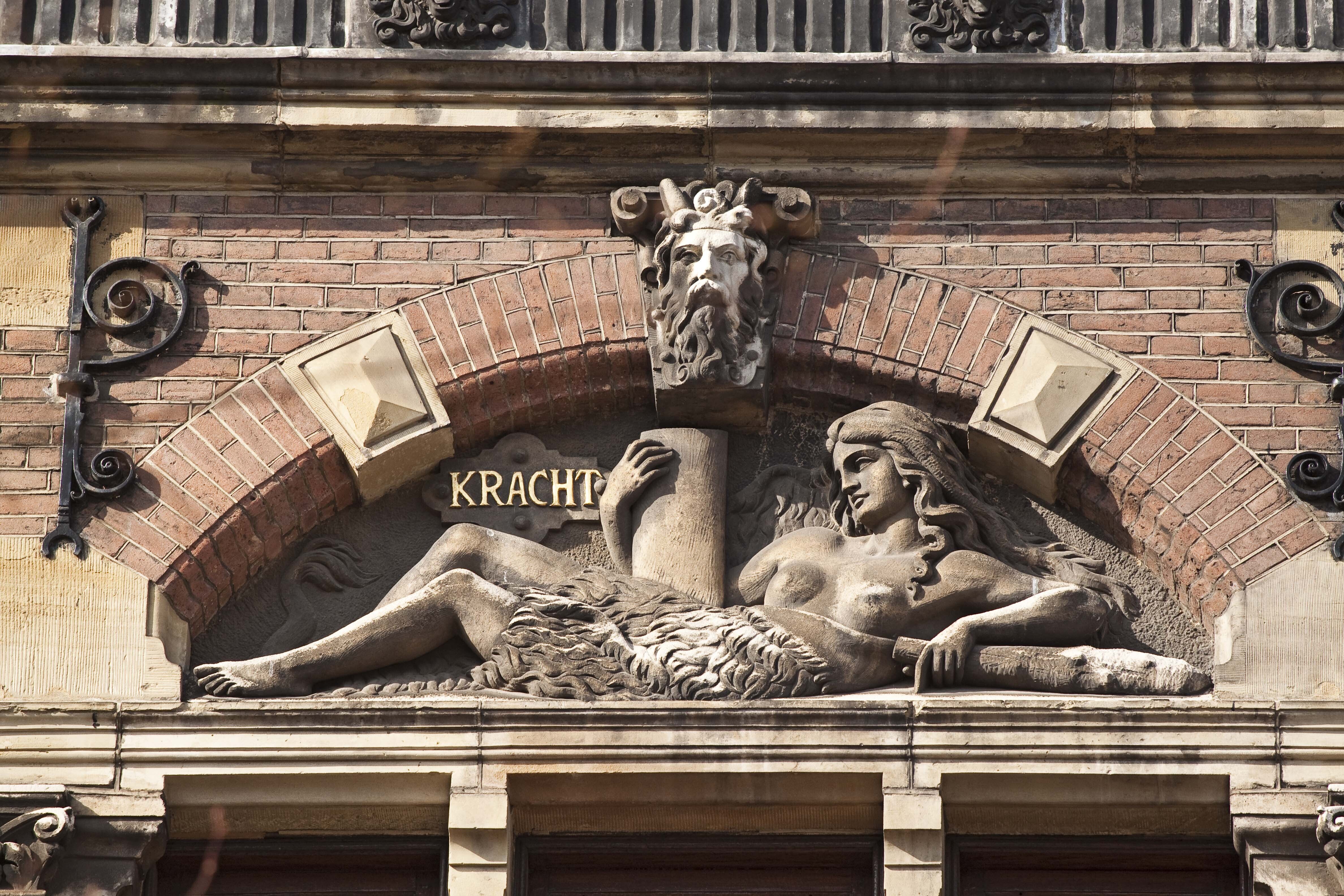 De meest rechtse risaliet heeft een rijk gebeeldhouwde erker op consoles. De zijgevel aan de Lange Poten telt eveneens drie risalieten, waarvan de meest westelijke een erkeruitbouw met rijke sculptuur bezit. Te weerszijden hiervan allegorische vrouwenfiguren: de Waarheid en de Spaarzaamheid, gebeeldhouwd door B.J.W.M. van Hove te Amsterdam. Het metselwerk van de gevels wordt verlevendigd door natuurstenen banden, negblokken en sierankers. De vensters hebben natuurstenen kruiskozijnen en ontlastingsbogen met blokken, sluitstenen met maskerkoppen en vlechtwerkvullingen. In de topgevels van de risalieten cartouches en medaillons, waarin de koppen van zes rechtsgeleerden.