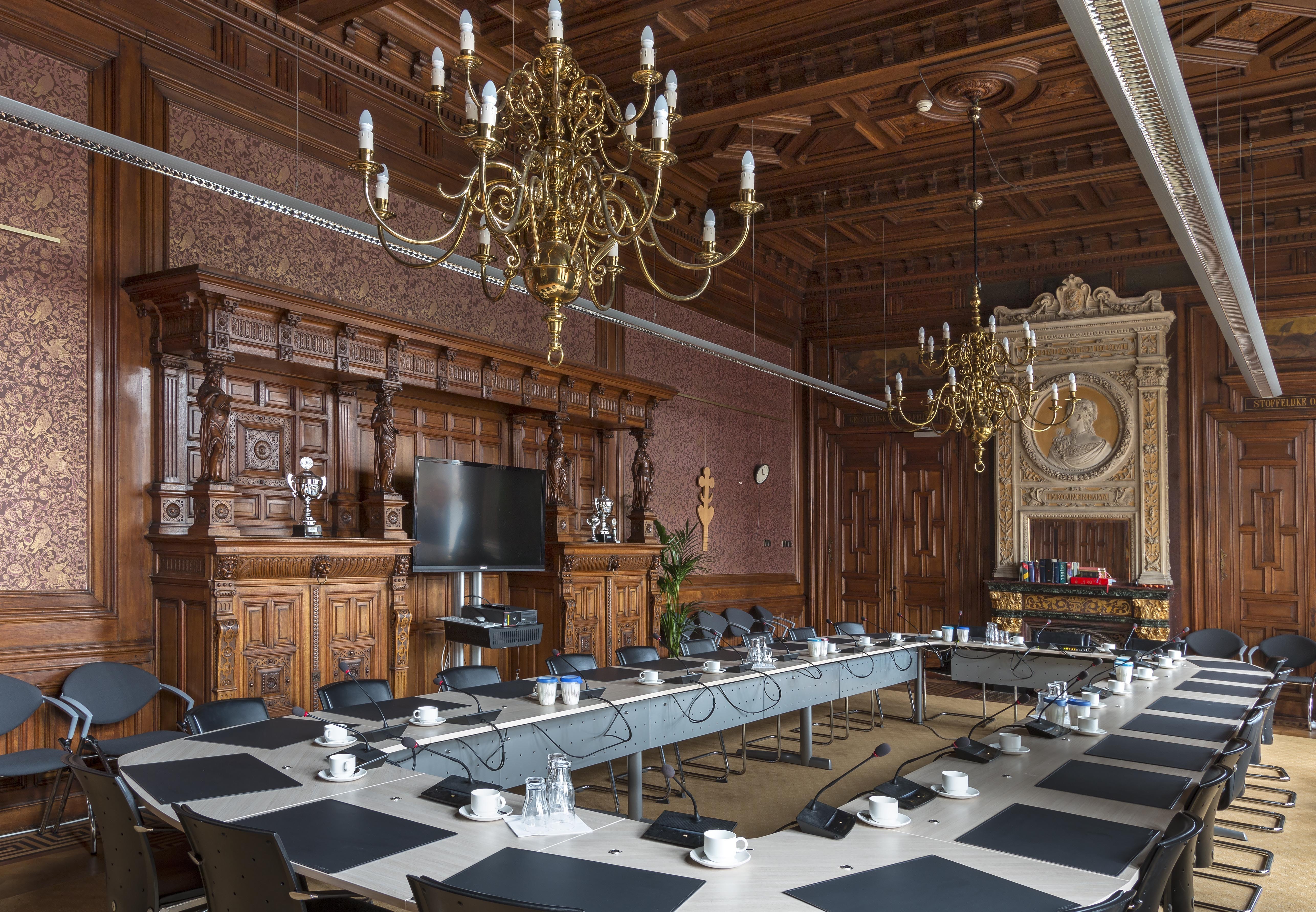 De zaal van de ministerraad, die het gehele middengedeelte van de vleugel aan de Pleinzijde beslaat, heeft een rijk cassettenplafond, betimmeringen, een erkeruitbouw met houten zuilen, waarvan de schatten versierd zijn met cannelures en de kapitelen de Corinthische orde vertonen, twee schoorsteenmantels van zwart en groen marmer met wit marmeren kapitelen en in de boezem in reliëf uitgevoerde borstbeelden. Deze stellen voor koning Willem III en koningin Emma, gebeeldhouwd door B.J.W.M. van Hove. Boven de deuren te weerszijden van de schoorsteenmantels dessus-de-portes en N.van der Waaij, E.S.Witkamp Jr. en H.J.Haverman, voorstellend allegorische onderwerpen. Voorts in deze zaal twee dressois met caryatiden naar ontwerp van C.Peters. Twee koperen lichtkronen, uit deze zaal afkomstig hangen thans in het achterste trappehuis.