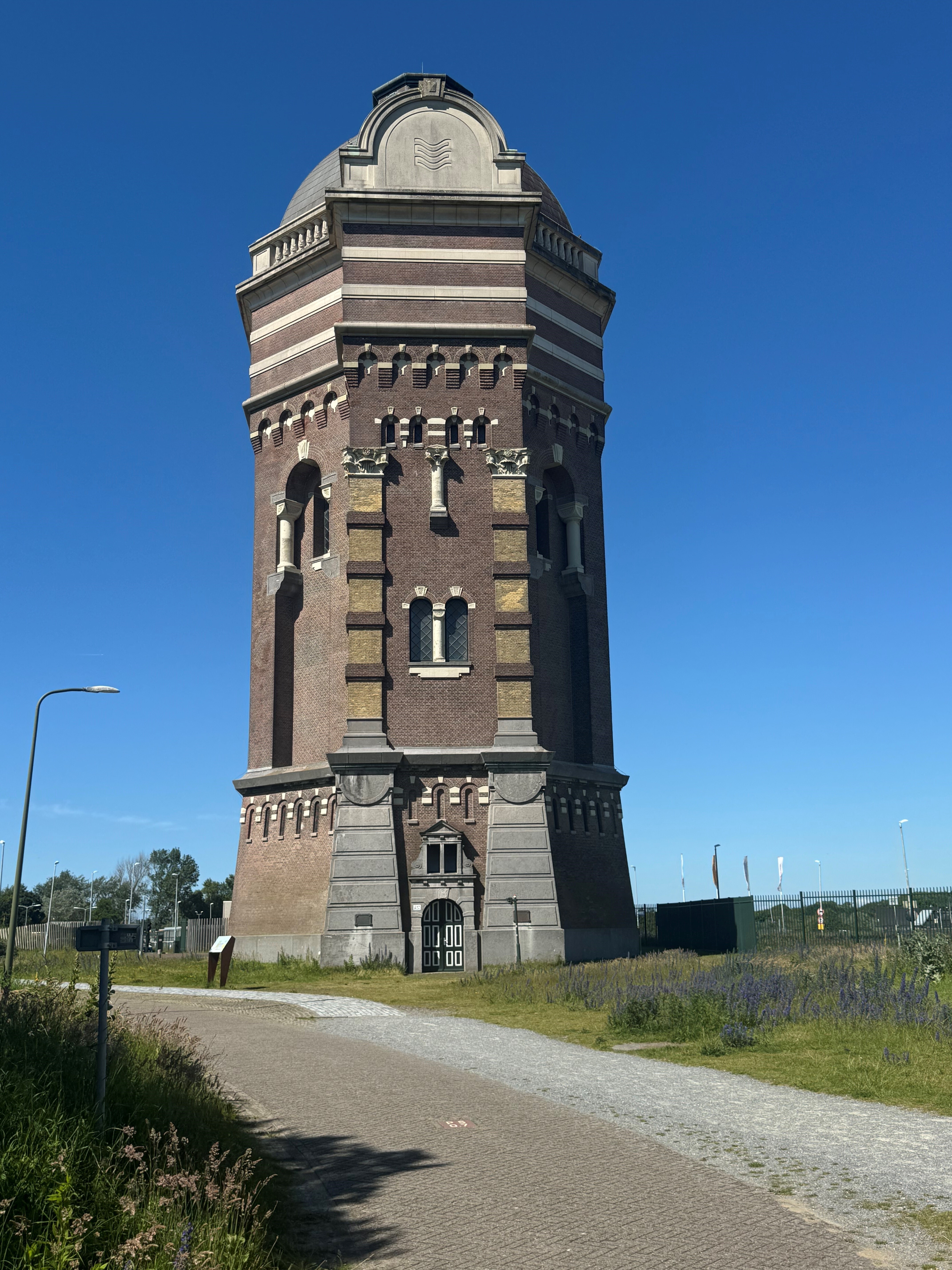 Achthoekige watertoren uit 1874 uitgevoerd in schoon metselwerk. Het is het eerste exemplaar in Nederland waar een bakstenen muur om het reservoir is opgetrokken, hetgeen de zwaar aangelegde onderbouw verklaart. Het uiterlijk van de toren wordt gekenmerkt door een onderbouw in de vorm van een sokkelgeleding, een middendeel met verticale nissen in de gevelvlakken en een bovenbouw met horizontale geleding van sierlijsten, afgesloten door een balustrade. De toren wordt gedekt door een koperen koepeldak.