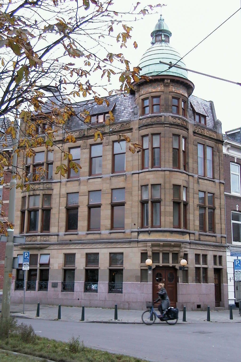 Bankgebouw op onregelmatige plattegrond uit 1909 in de stijl van de "Um Achtzehnhundert Bewegung' naar ontwerp van architect J.C. Dorsser op de hoek van Prins Hendrikplein en Prins Hendrikstraat.