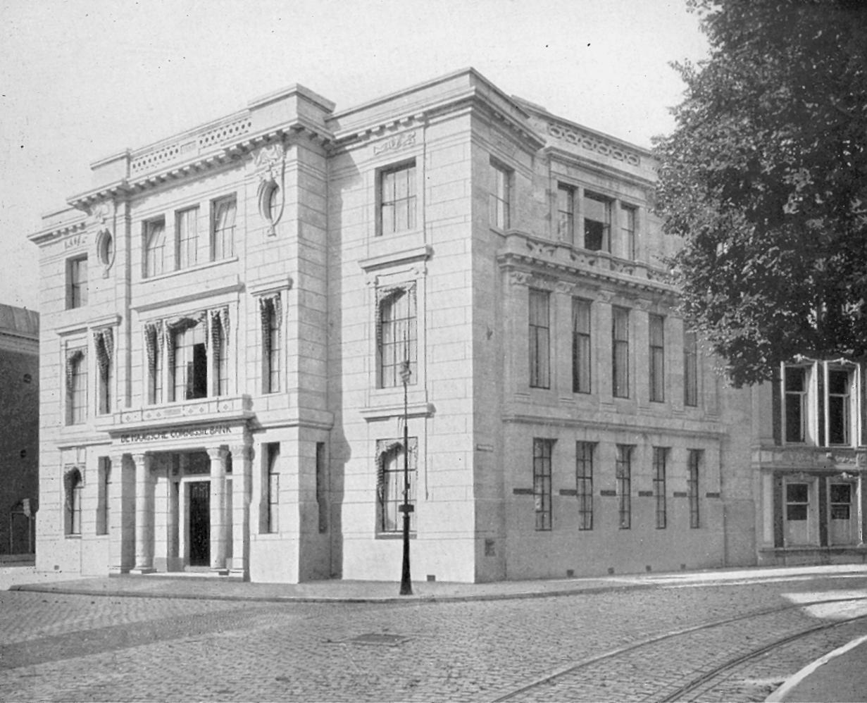 Inleiding: Kantoorpand uit 1914 naar ontwerp van F.A. Bodde, in oorsprong gebouwd ten behoeve van de Haagsche Commissiebank. Het aan drie zijden vrijgelegen pand op samengestelde plattegrond is opgetrokken in de trant van de "Um Achtzehnhundert Bewegung".