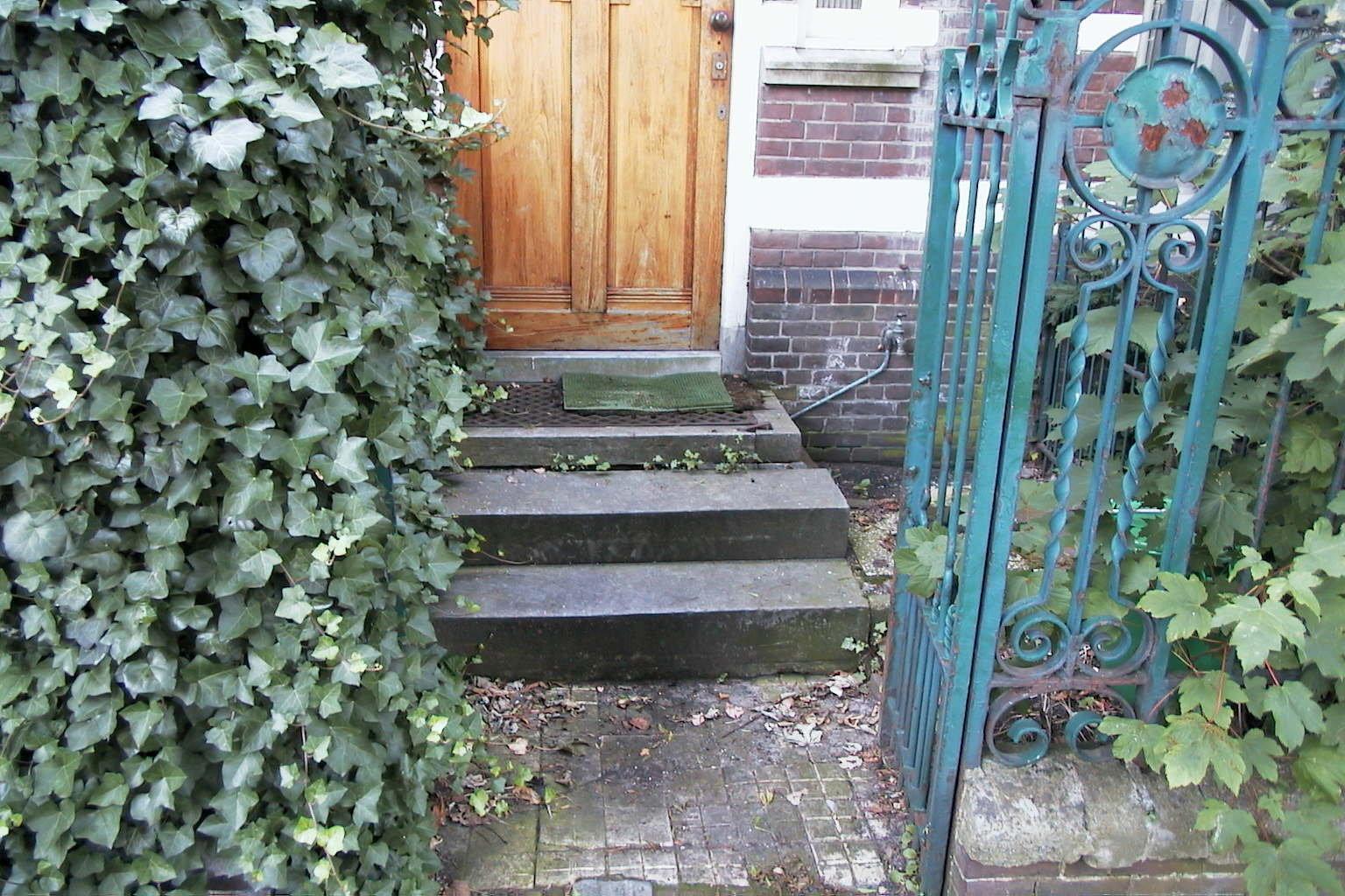 De tuin wordt van de straat gescheiden door een smeedijzeren tuinhek.