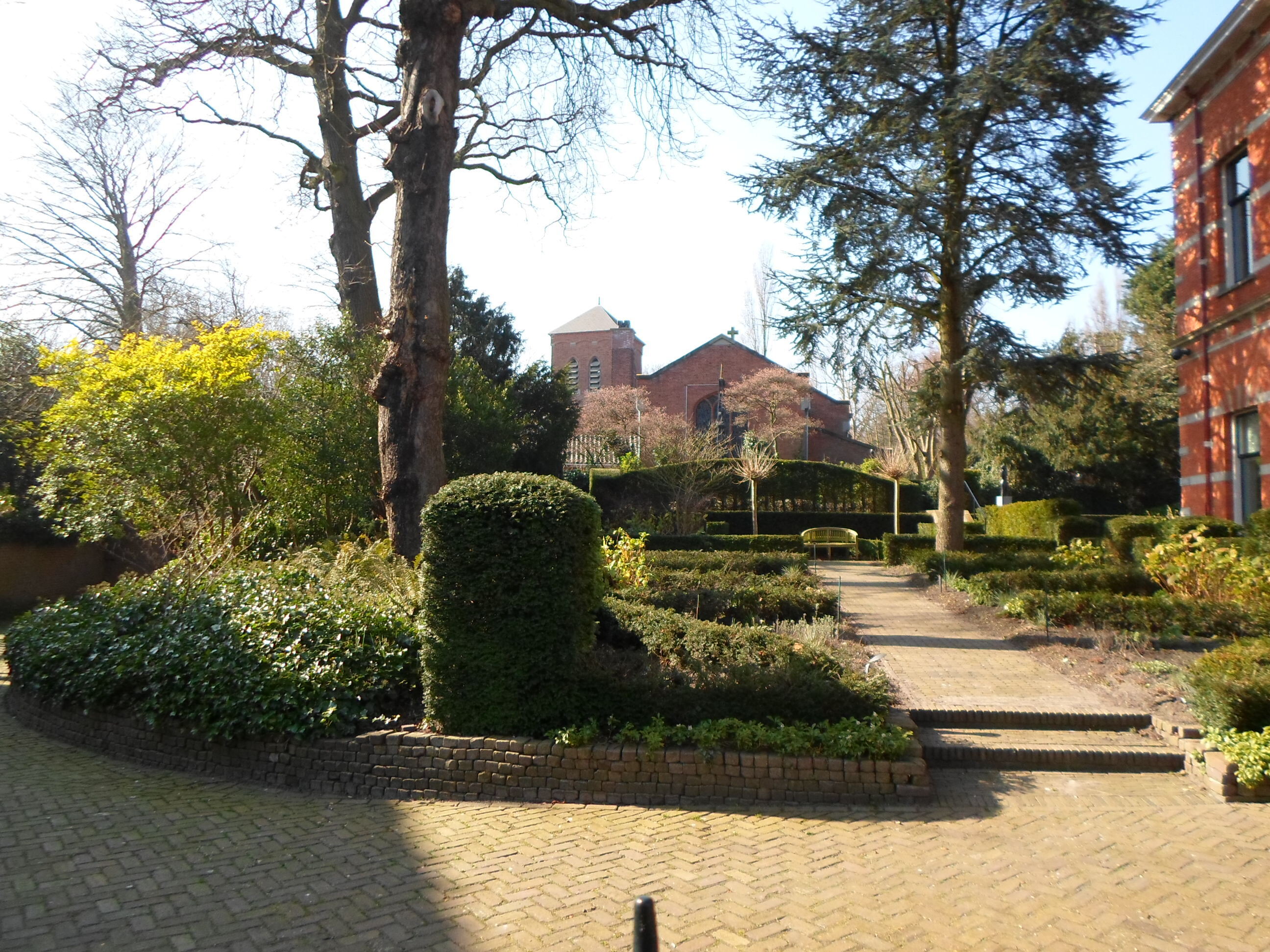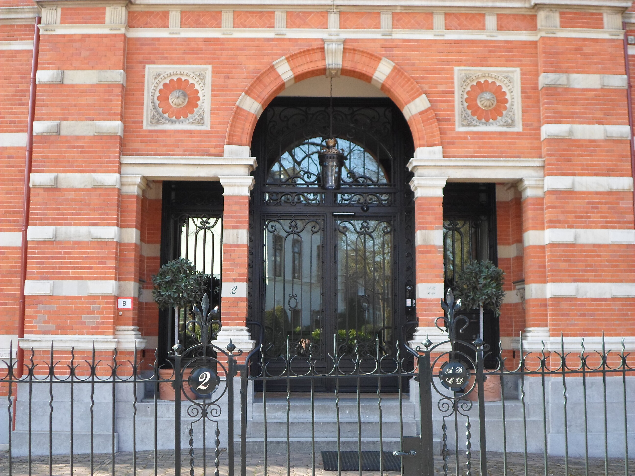 De tuin wordt van de straat gescheiden door een smeedijzeren hek op bakstenen voet met natuurstenen dekplaat.