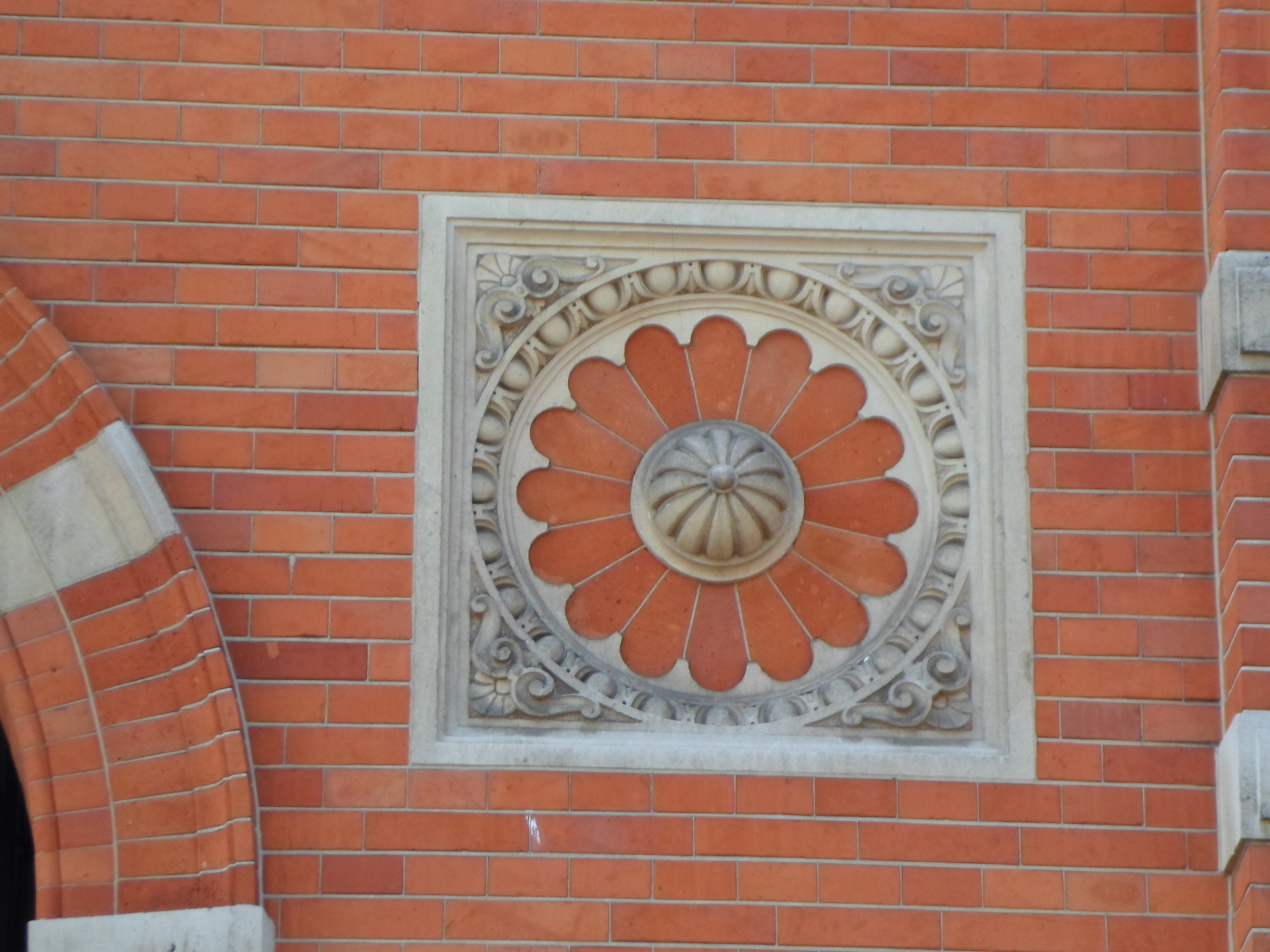 De ingangspartij in het risaliet bestaat uit een boogstelling op geblokte bakstenen pijlers. Aan weerszijden van de boog bevinden zich gebeeldhouwde rozetversieringen in het metselwerk. De toegang van de portiek naar de hal is vervangen door een moderne glaspui. De schuifvensters bezitten hardstenen onderdorpels en kroonlijsten, op de eerste bouwlaag met consoles, en daarboven een geblokte hanekam met gebeeldhouwde sluitsteen. Het risaliet bevat een driedelig venster met een rijk bewerkte natuurstenen omlijsting o.m. bestaande uit twee gebeeldhouwde zuiltjes op voluutconsoles en een hoofdgestel met fries en kroonlijst op consoles. De middendorpel van het venster is uitgevoerd als een gedraaide lijst. Aan weerszijden van het venster zijn ruitvormige raampjes geplaatst.