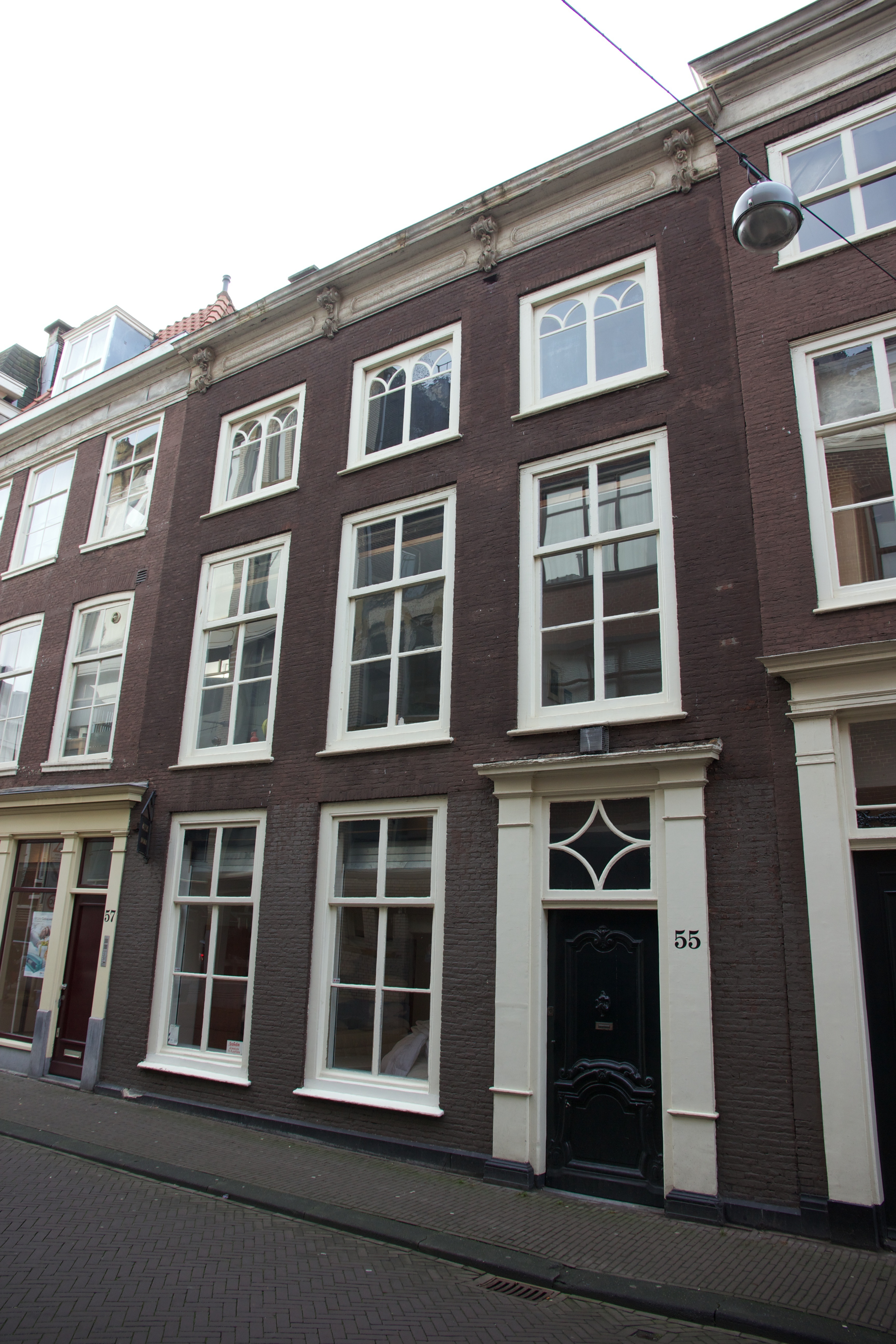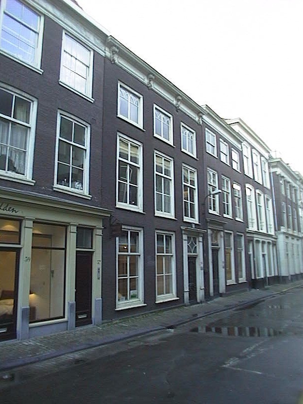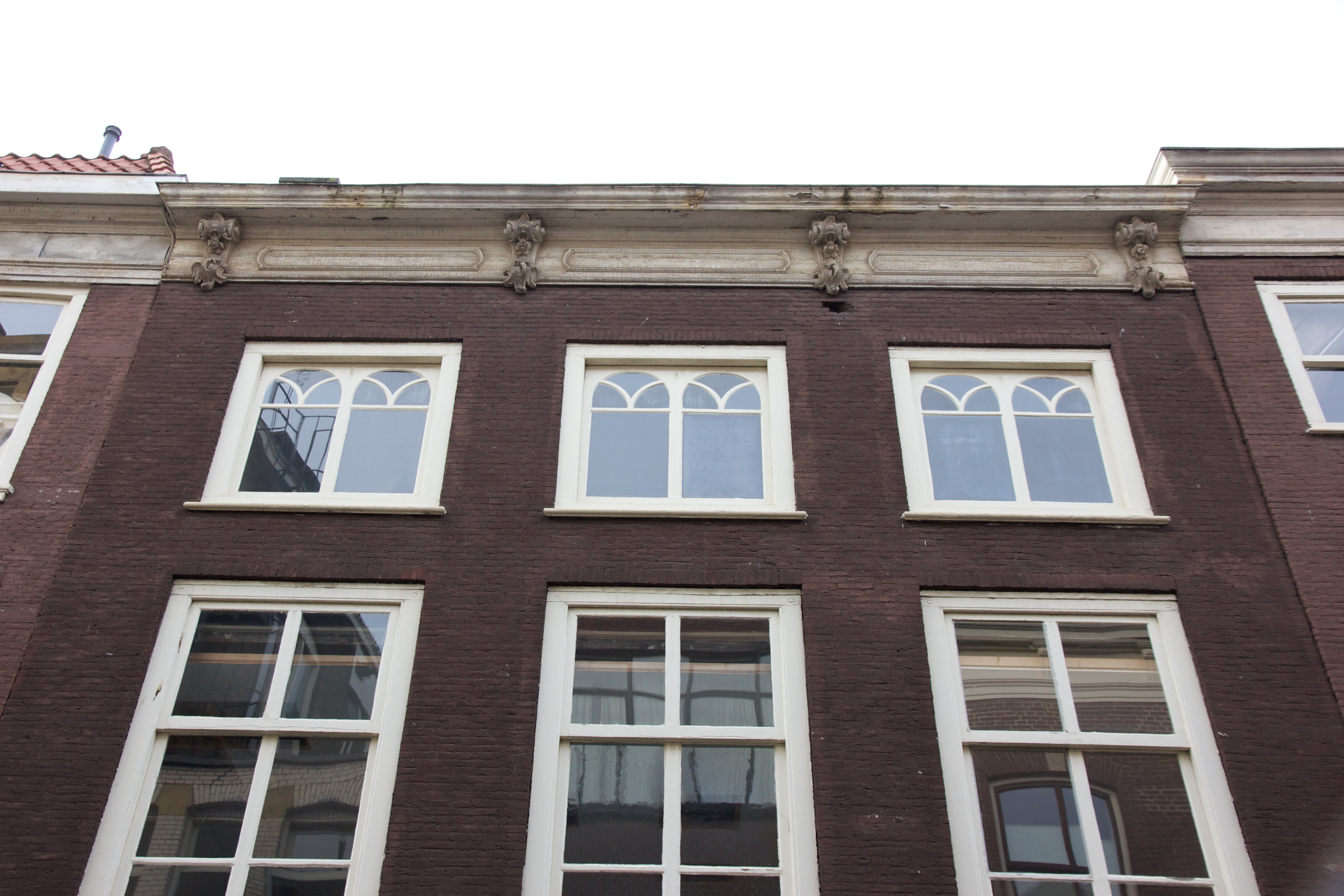Pand met 18e eeuwse gevel met kroonlijst op gesneden consoles, deuromlijsting met pilasterstelling.