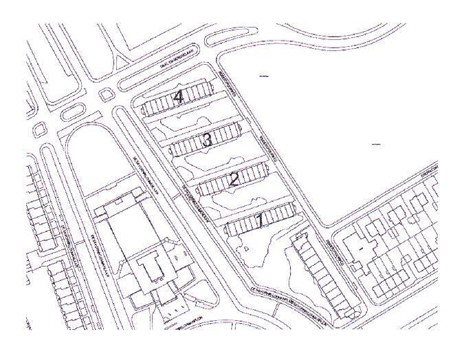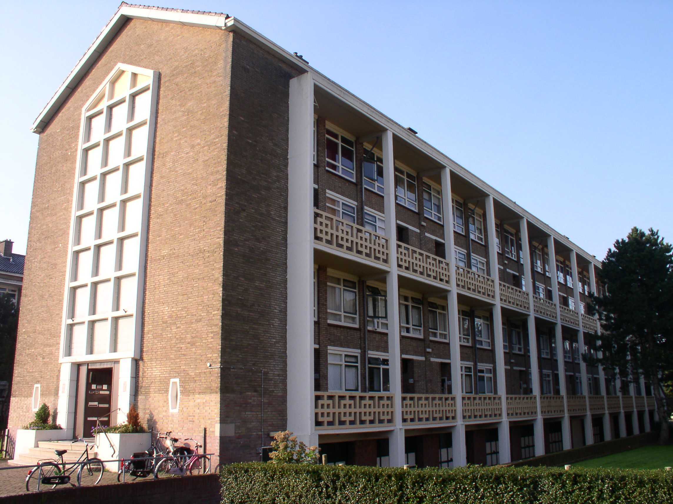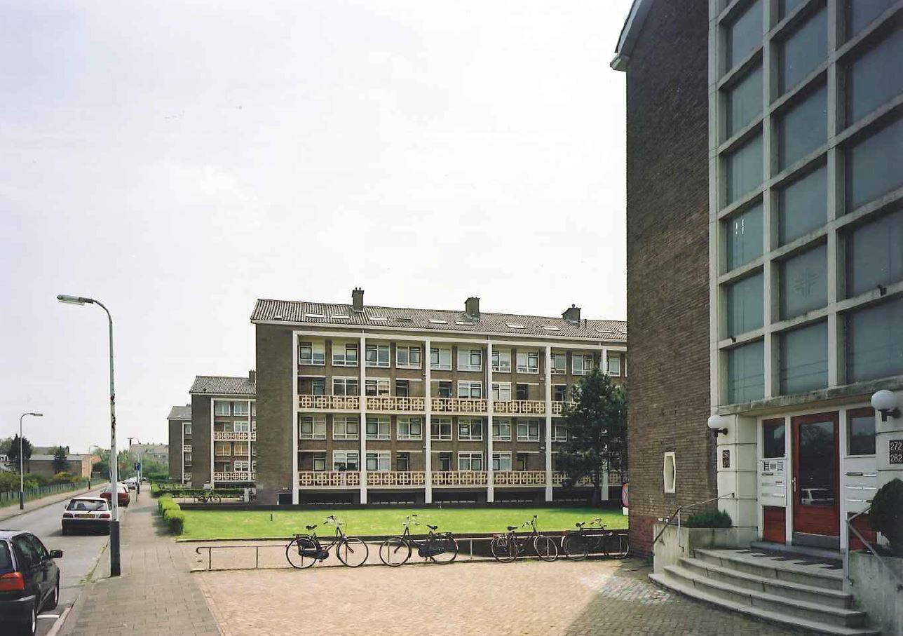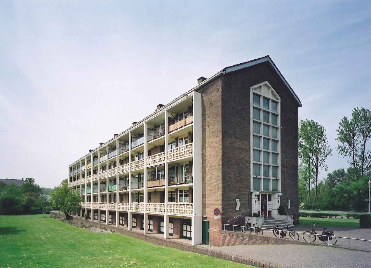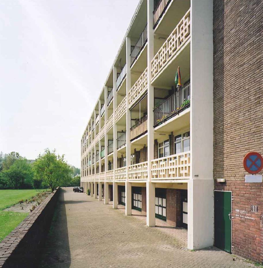Complex bestaande uit vier, tussen binnentuinen gesitueerde langwerpige woonflats in traditionele vormgeving uit 1954 naar ontwerp van de architecten Joh. A. Schothorst en H. Musegaas.