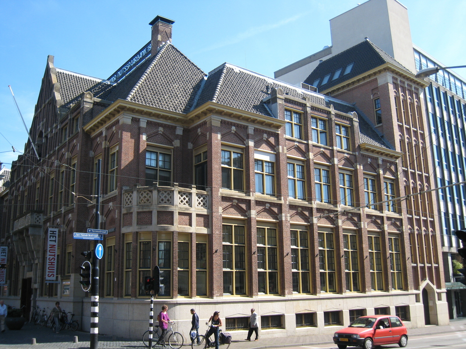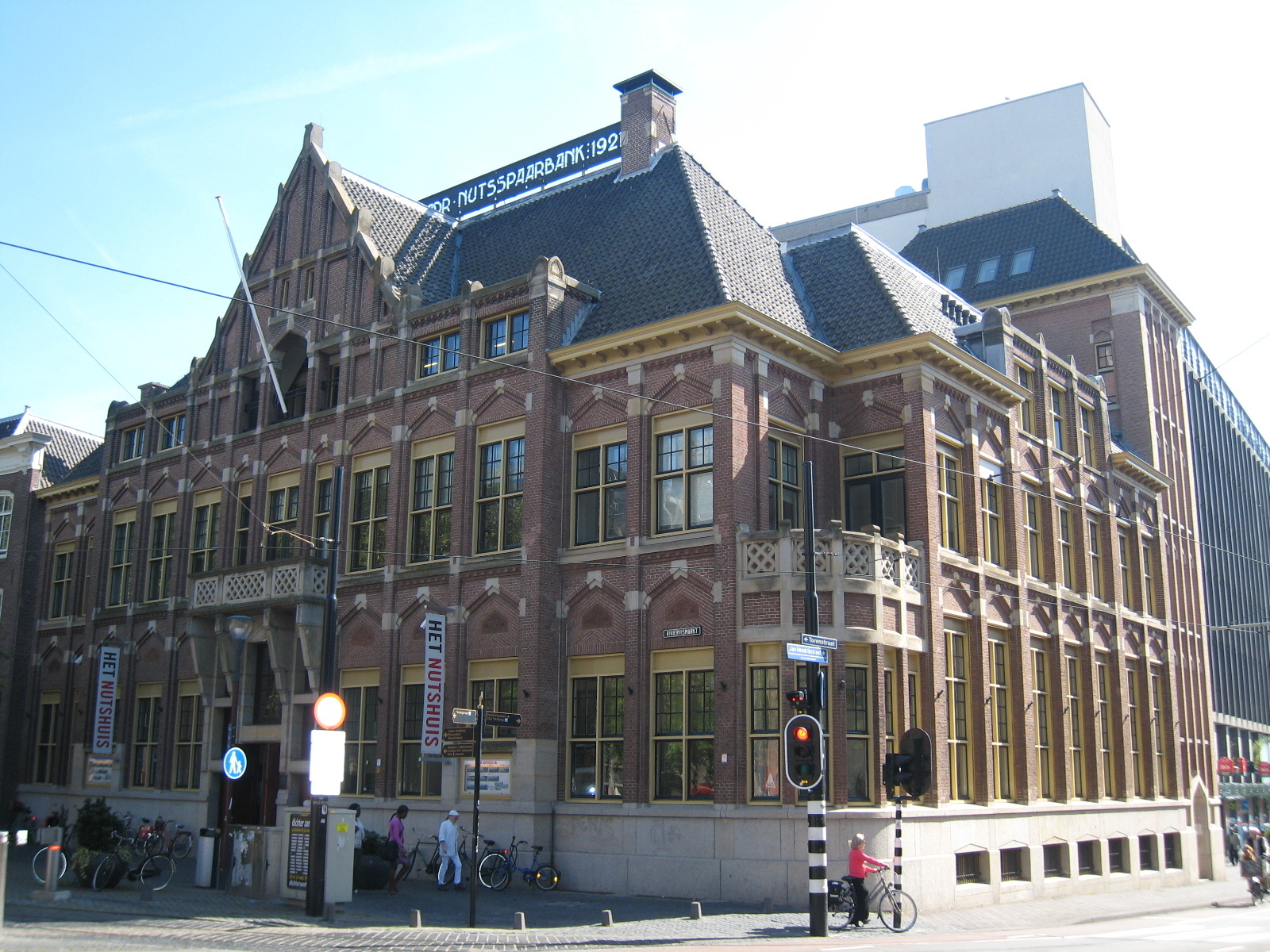 Bankgebouw van de Nutsspaarbank op de hoek Riviervismarkt-Jan Hendrikstraat uit 1919-1921, gebouwd naar ontwerp van S. de Clerq en E.F. Ehnle in een historiserende, op de Hollandse Renaissance en "Um 1800-beweging" geinspireerde architectuur. Omschrijving.