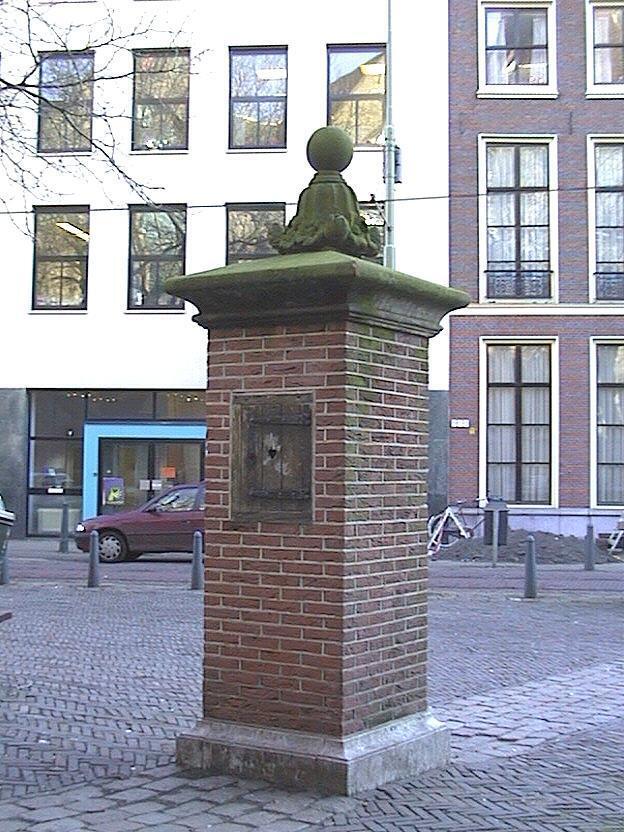 Stadspomp op vierkante plattegrond, opgemetseld uit baksteen met natuurstenen elementen.