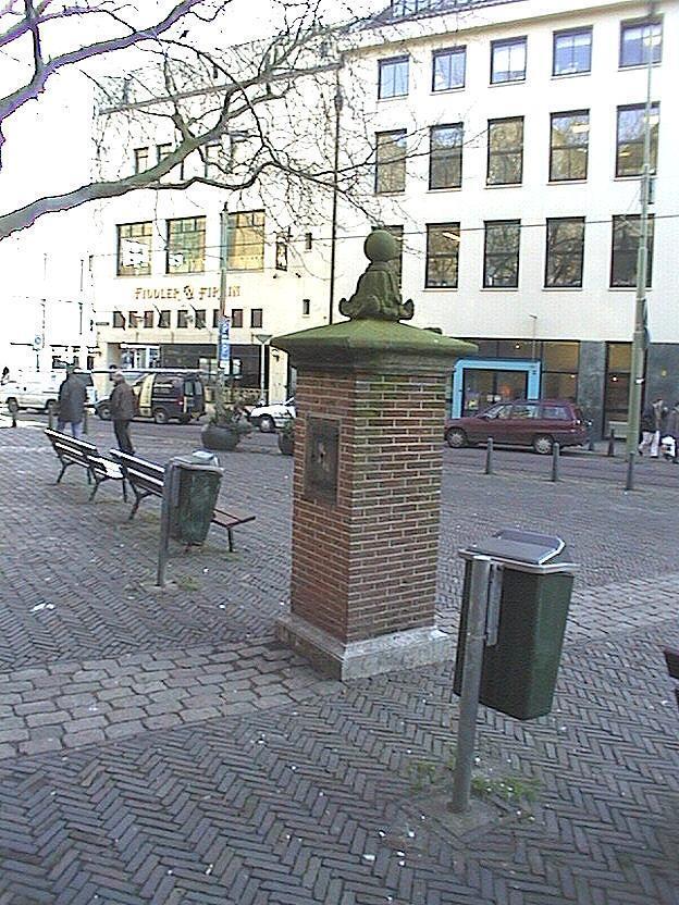 De van elders uit de stad afkomstige bakstenen stadspomp op Rond de Grote Kerk staat op een natuurstenen voetstuk. De pomp wordt be#indigd met een fors geprofileerde natuurstenen afdekplaat. Aan een van de randen van de afdekplaat is het gemeentewapen van Den Haag bevestigd, gevat in een sierlijke cartouche. De pomp wordt bekroond met een decoratie, bestaande uit een bol met weelderige bloemen, acanthusbladeren en dennenappels.