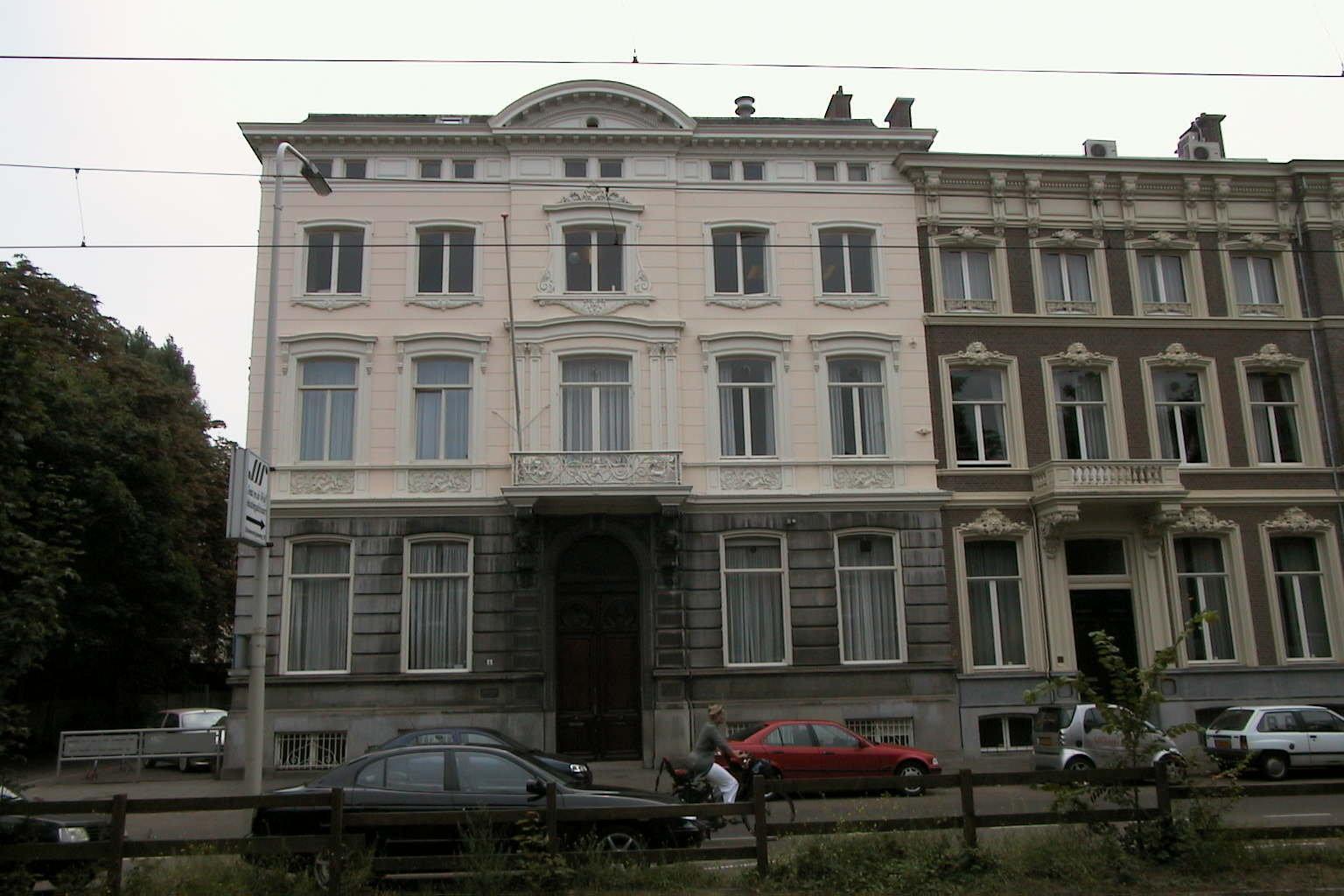 Herenhuis op nagenoeg vierkante plattegrond, bestaande uit souterrain, drie bouwlagen en een mezzanino onder een met shingles gedekt afgeknot schilddak, vijf vensterassen breed.