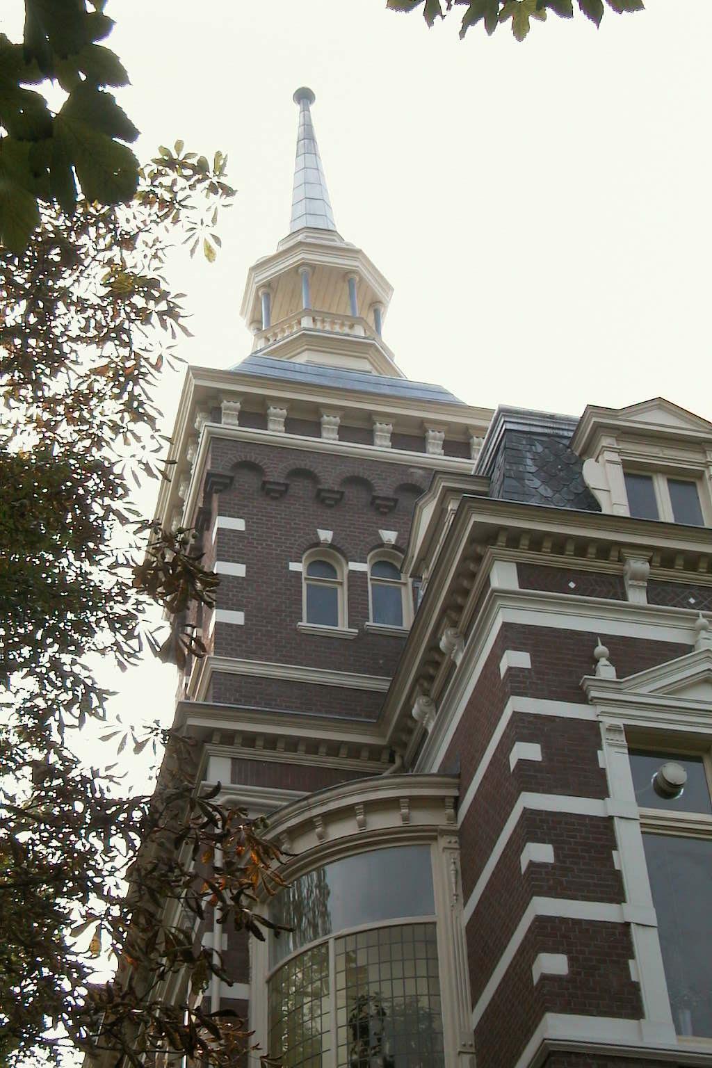 De gevels zijn ter plaatse van de verdiepingen in schoon metselwerk uitgevoerd, afgewisseld met de voor de neo-renaissance kenmerkende horizontale witte speklagen en hoekblokken. Aan de rechterkant van de beletage is een veelhoekige erker uitgebouwd met rondboogvormige glas-in-lood bovenlichten tussen geprofileerde pilasters. Boven de erker bevindt zich een klein balkon met balusters. Links van de erker boven het souterrain is een bordes met een smeedijzeren hek. De ingang met smeedijzeren panelen is aan de linkerkant in een portiek met kleine rondboogvormige bovenlichten van glas-in-lood. Hierboven in de hoek een kwartrond uitgebouwde erker.