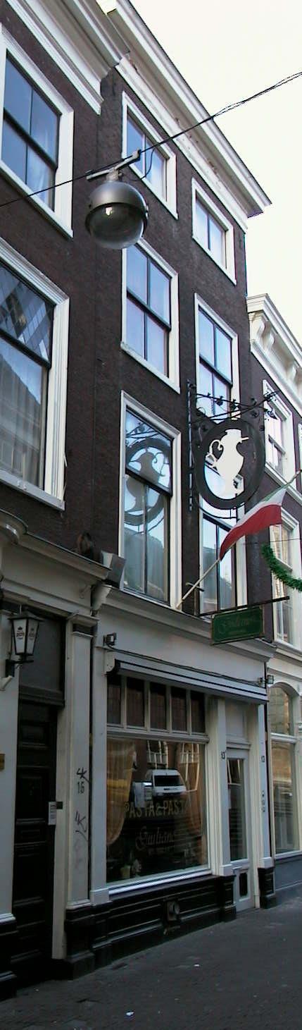 Pand met hoge lijstgevel, vermoedelijk uit ca. 1800 en ter breedte van twee vensterassen. Het pand bestaat uit een parterre en twee verdiepingen plus zolderverdieping. Winkelpui met kroonlijst uit midden 19de eeuw. Vensters onder rollagen en met l9de eeuwse geprofileerde houten omlijstingen. Op de verdiepingen T-, vierruits- en tweeruitsschuiframen. Uithangbord in siersmeedwerk c. 1900.