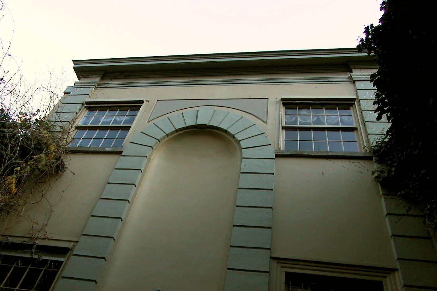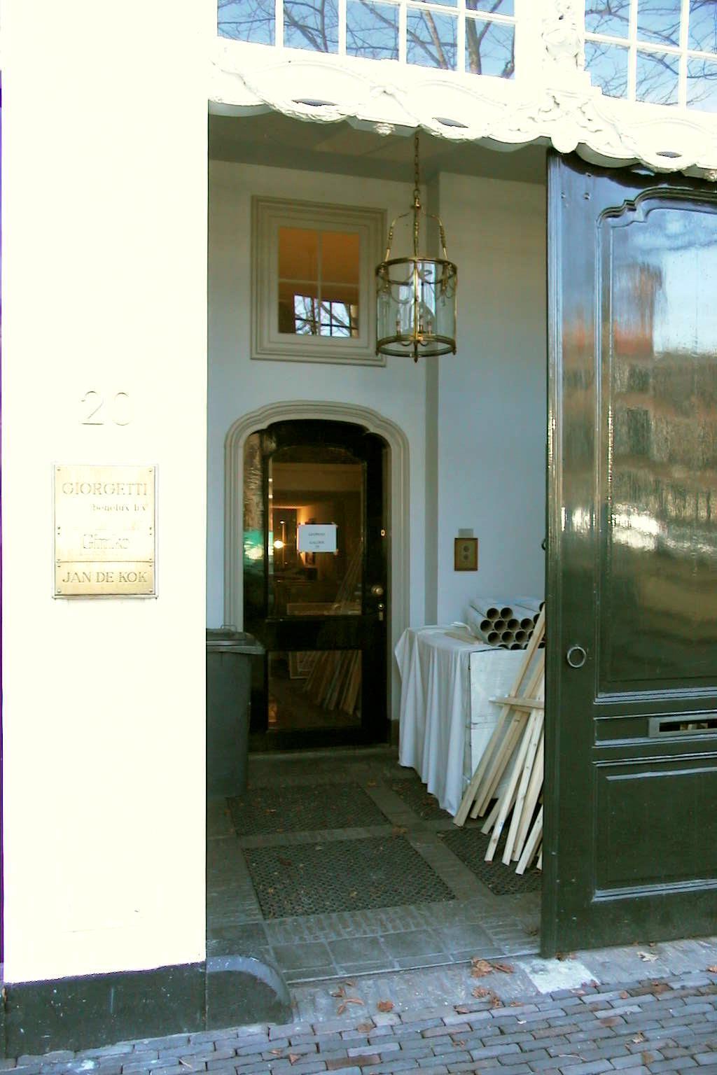 Koetshuis met pilasterstelling om de deuromlijsting gesneden kalf.