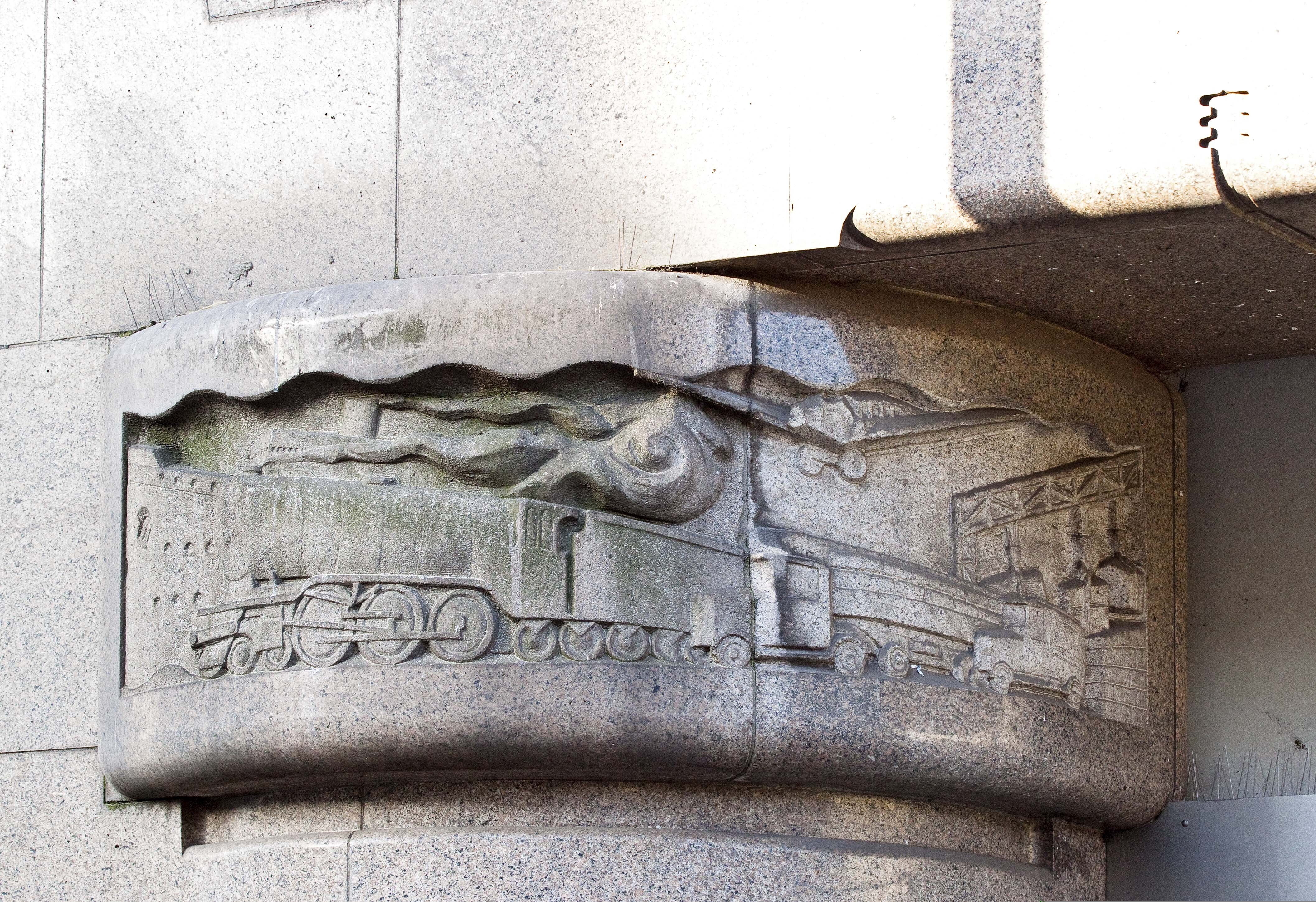 Voorzijde van een warenhuisgebouw; de grotendeels bakstenen gevel is bij de parterre bekleed met een naar voren springend gevelvlak dat boven de parterre door muurdammen in zeven traveeen is verdeeld, waarin smalle, hoge vensters (in oorsprong met stalen kozijnen). Boven deze raampartij is een zware, natuurstenen latei, gedragen door gebeeldhouwde consoles. Hierboven een verdieping met zes vensters waarin driedelige (in oorsprong stalen) kozijnen. Het terugliggende rechter gedeelte van de gevel, gemarkeerd door afgeronde hoeken in het metselwerk, bezit in de parterre een paraboolvormige toegangspoort in natuurstenen omlijsting en daarboven een verticale reeks liggende vensters van het trappenhuis. Aan de bovenzijde wordt dit bouwdeel bekroond door zwaar, natuurstenen lijstwerk. Met de terugliggende dakverdieping en het vooruitspringende, lagere geveldeel vormt deze rechter hoekpartij een plastisch geheel. De parterre bevat voorts teruggerooide brede etalageruiten met ingang in het midden en links een verdiepte, rechthoekige inrijpoort.