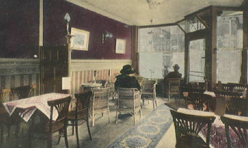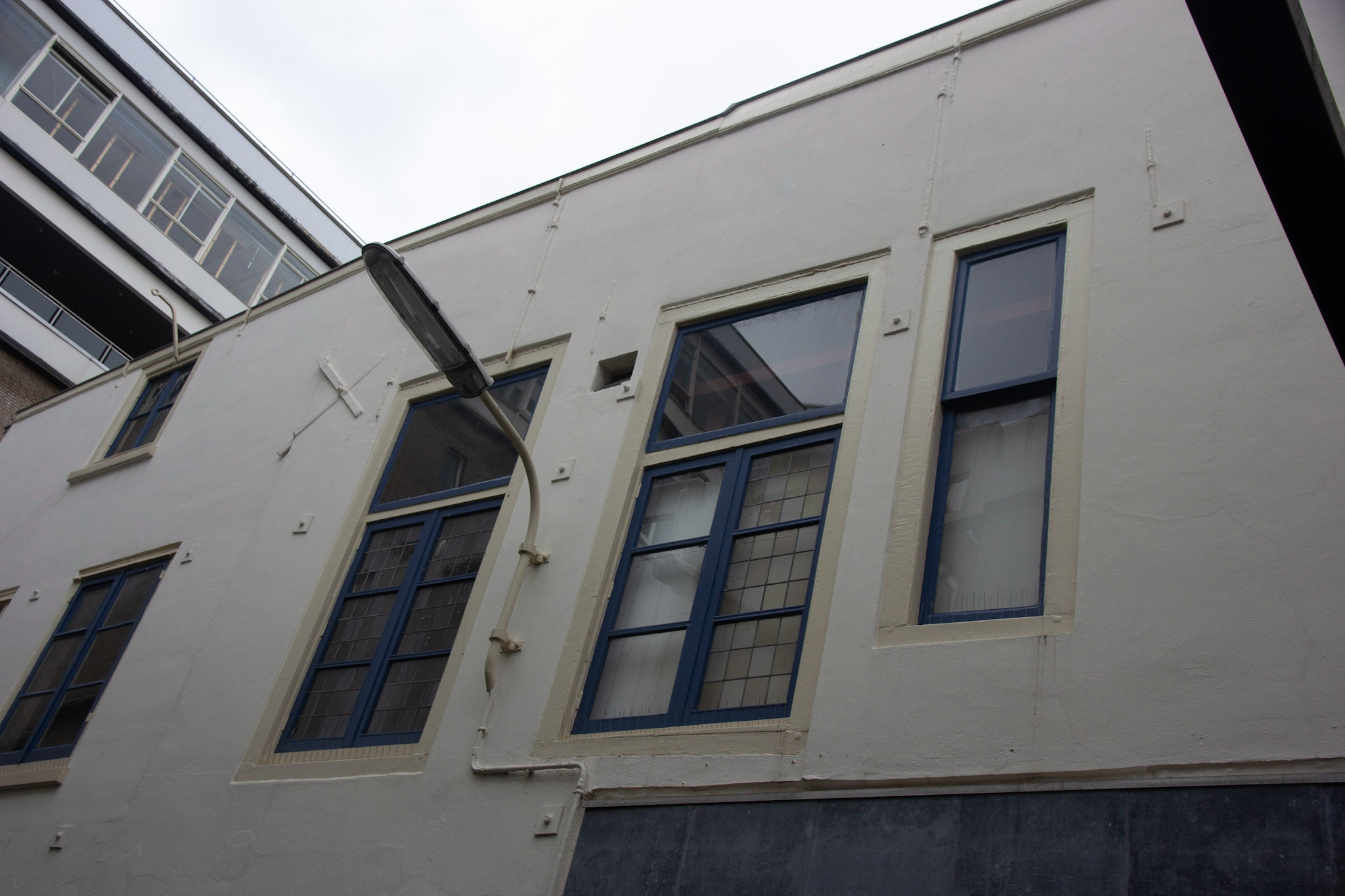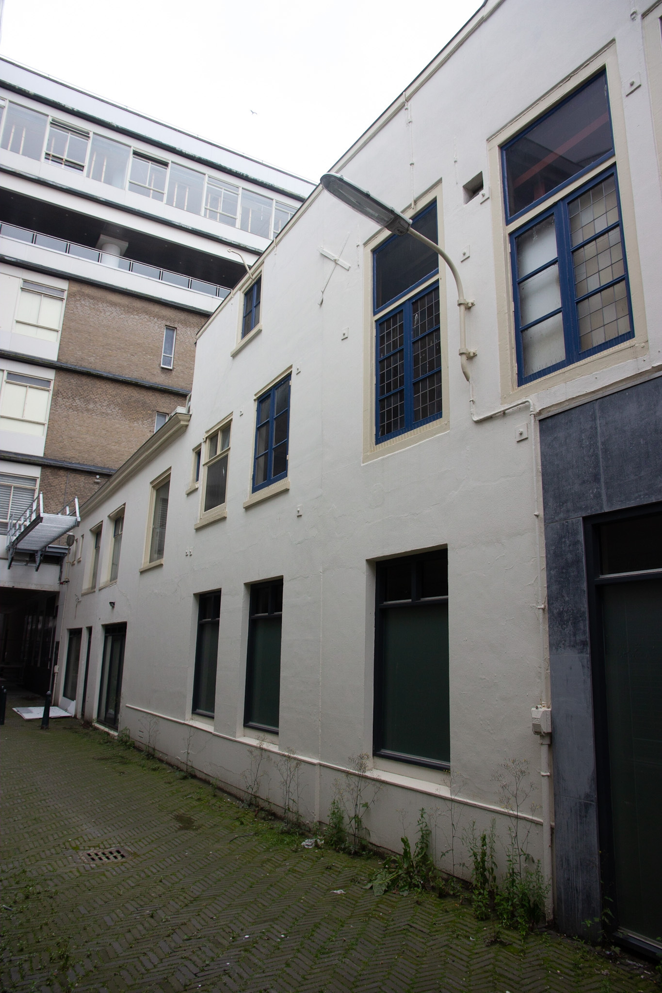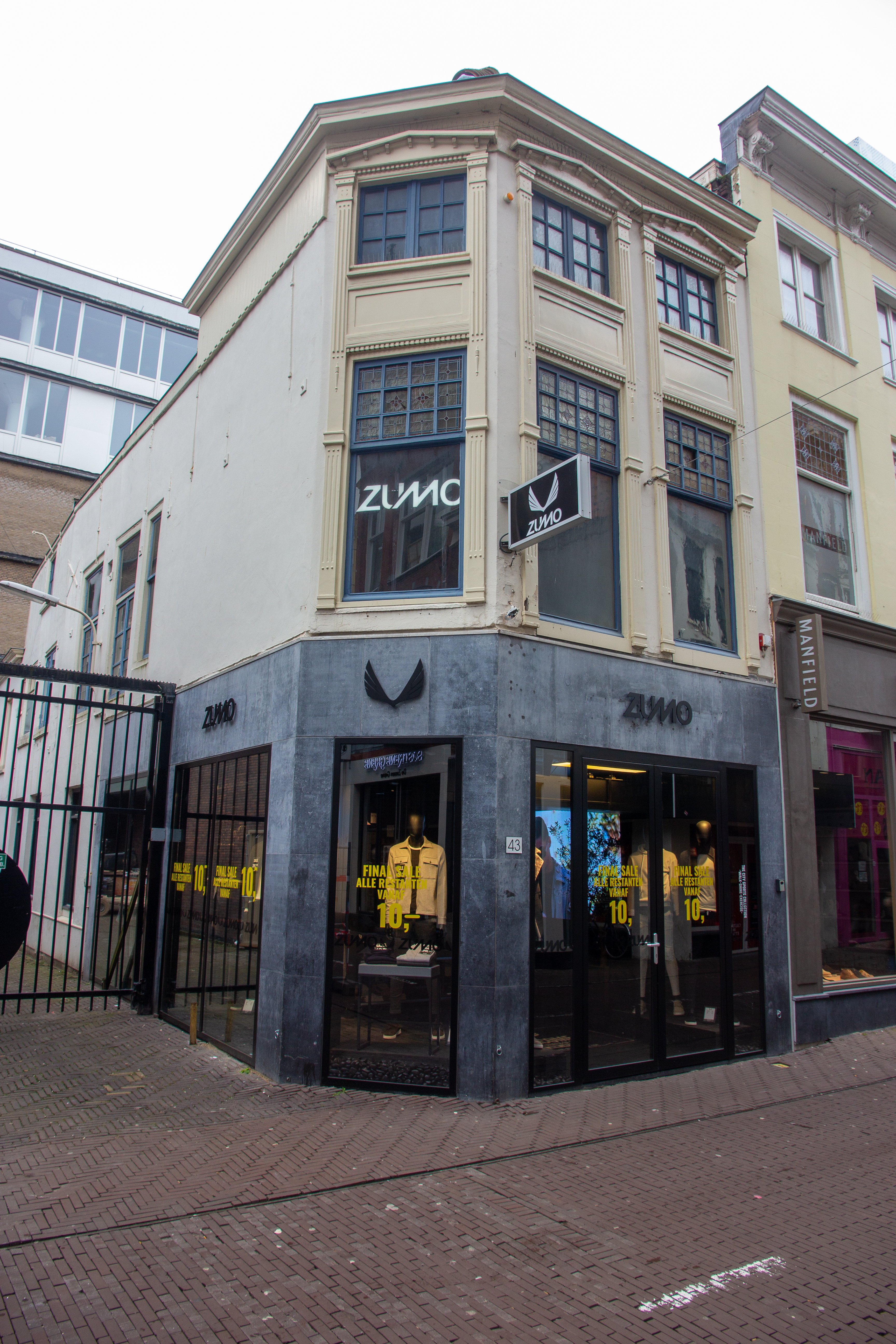 De gevel aan de Spuistraat is rond 1905 opgetrokken en bestaat uit drie traveeën, waarvan de hoek met de Voldersgracht is afgeschuind. De Spuistraat is al sinds de late middeleeuwen een straat waar bedrijvigheid en handel waren geconcentreerd. Rond 1850 doet het winkelconcept zoals wij dat nu kennen haar intrede en worden veel woonhuis- en bedrijfspuien in de bestaande bebouwing vervangen door winkelpuien. Zo ook bij Spuistraat 43. De voortschrijdende cityvorming van de binnenstad en daarmee het alsmaar belangrijker worden van de winkelfunctie voor de Spuistraat zorgt ervoor dat vanaf 1875 het merendeel van de oude panden wordt gesloopt. De nieuwe winkel-woonpanden laten de rijke schakering zien van de snel opvolgende architectuurstijlen vanaf 1875 tot aan het Interbellum.