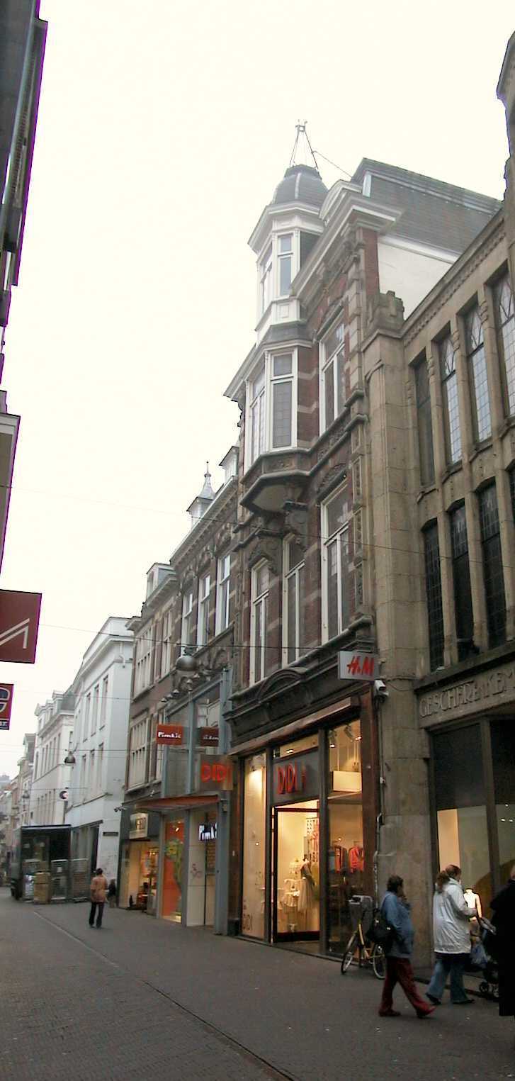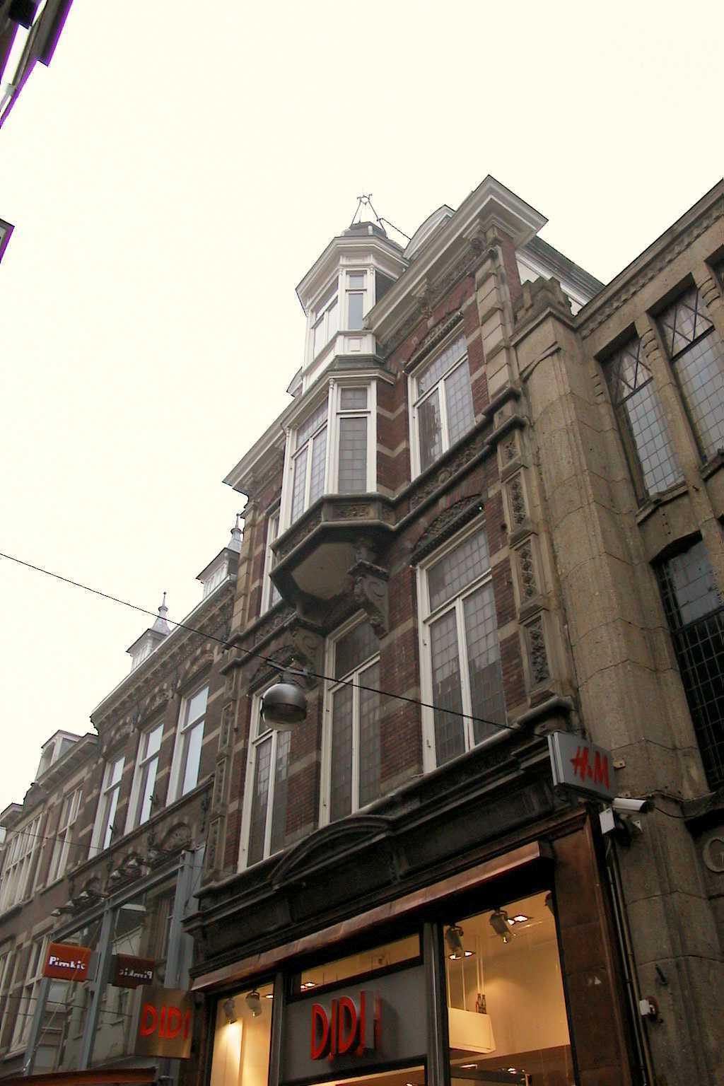 De drie assen brede voorgevel, opgetrokken uit baksteen met natuurstenen sierelementen is uitgevoerd in een voor Den Haag bijzonder rijke neo-renaissance. Kenmerkend zijn de natuurstenen hoeklisenen, speklagen en gedecoreerde strekken boven de vensters. De erker op de tweede verdieping en de hierboven gesitueerde torenvormige opbouw geven het geheel een opvallend monumentaal karakter. De winkelpui en achtergelegen indeling op de begane grond is meerdere malen gewijzigd (onder meer in 1905 en 1934).