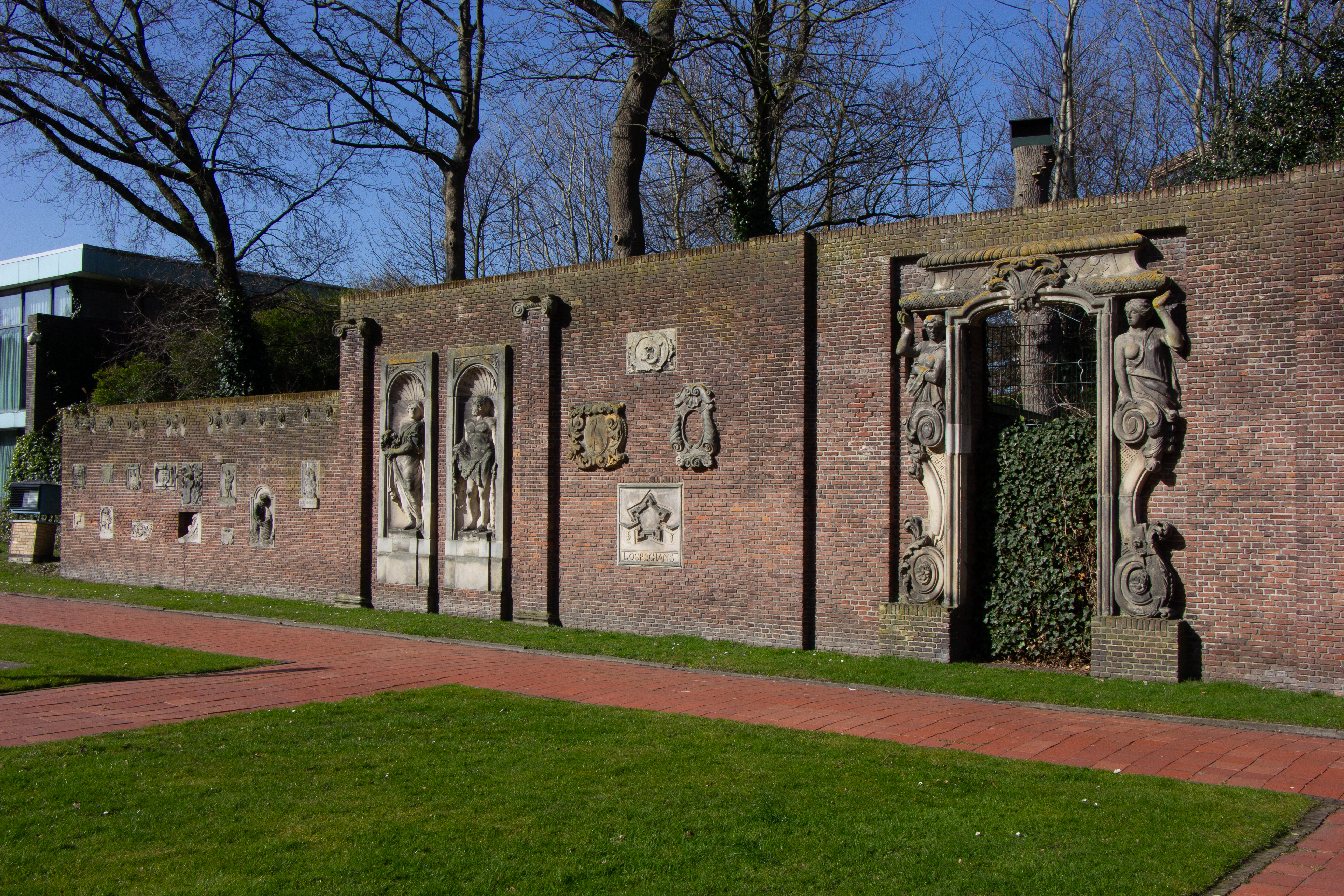 Vijvers, trans, pergola, tuin en hekwerk, behorende bij het Haags Gemeentemuseum. Het museumgebouw wordt door twee rechthoekige vijvers van verschillende grote van de Stadhouderslaan gescheiden. Bewust is in het ontwerp gekozen voor een forse afstand van het museum tot de Stadhouderslaan teneinde de rust te waarborgen. Tussen de vijvers bevindt zich de trans, waarvan de entree aan de Stadhouderslaan geflankeerd wordt door twee bakstenen pylonen. Via de trans bereikt men de grote hal van het museumgebouw. Boven de ingang een door J. Altorf vervaardigd fayence beeldje met het wapen van Den Haag. De verbindingsgang is evenals het museum opgebouwd uit een betonnen skeletconstructie, bekleed met gele baksteen. De lange zijden zijn met glas dichtgezet. Tussen het auditorium aan de achterzijde van het museumgebouw en het paviljoen bevindt zich de houten pergola. Het complex wordt van de straat gescheiden door bakstenen muurtjes, waarop een laag ijzeren hekwerk. De binnentuin en de tuinaanleg om het gebouw heen met de vijvers zijn doelbewust aangelegd ter verhoging van het beoogde effect van een museumbezoek. De oorspronkelijke opzet met rode betegelde paden en groene gazons is symbolisch voor de opvatting van de tuin als overgang van "cultuur" naar "natuur". Waardering.