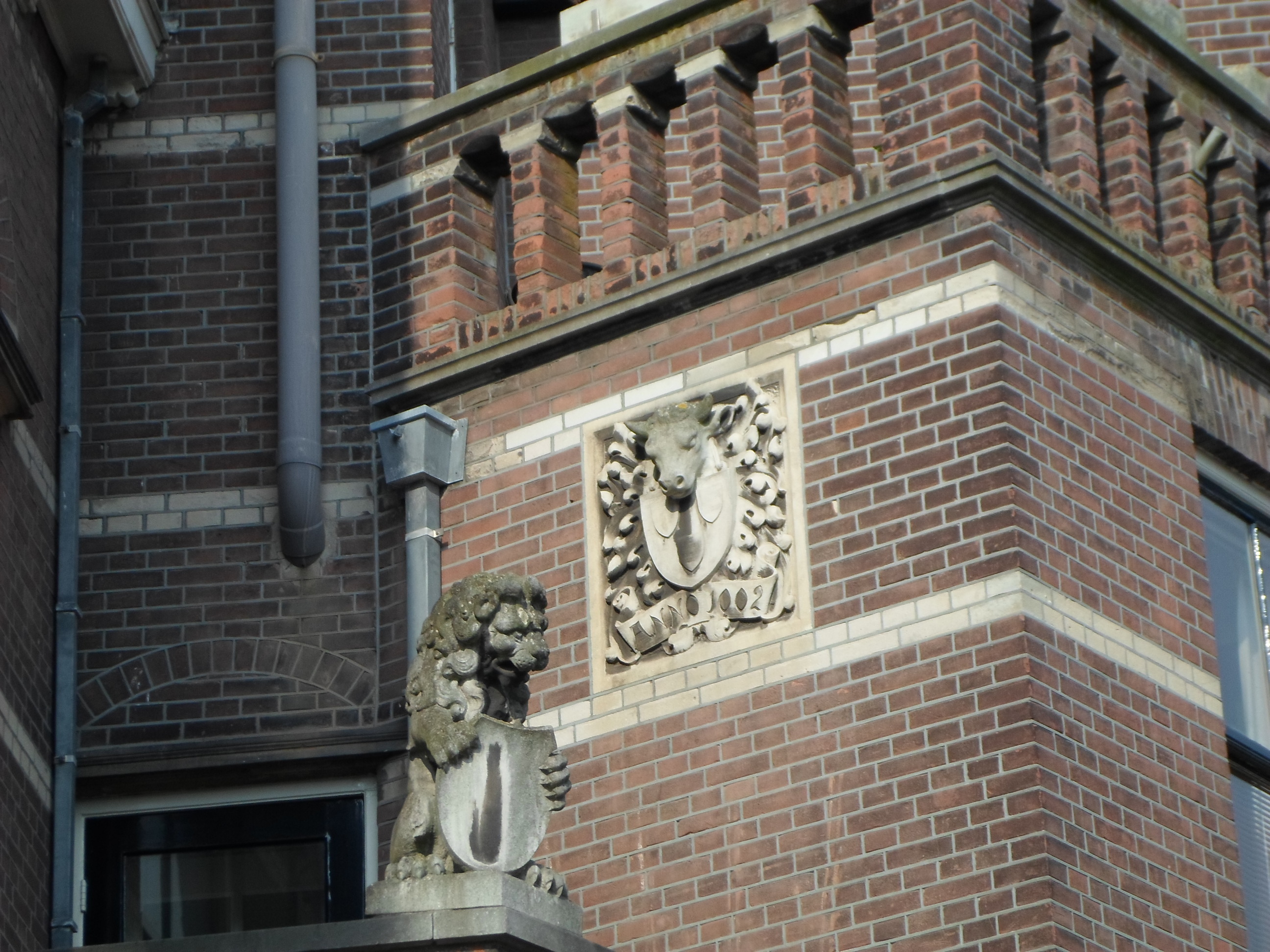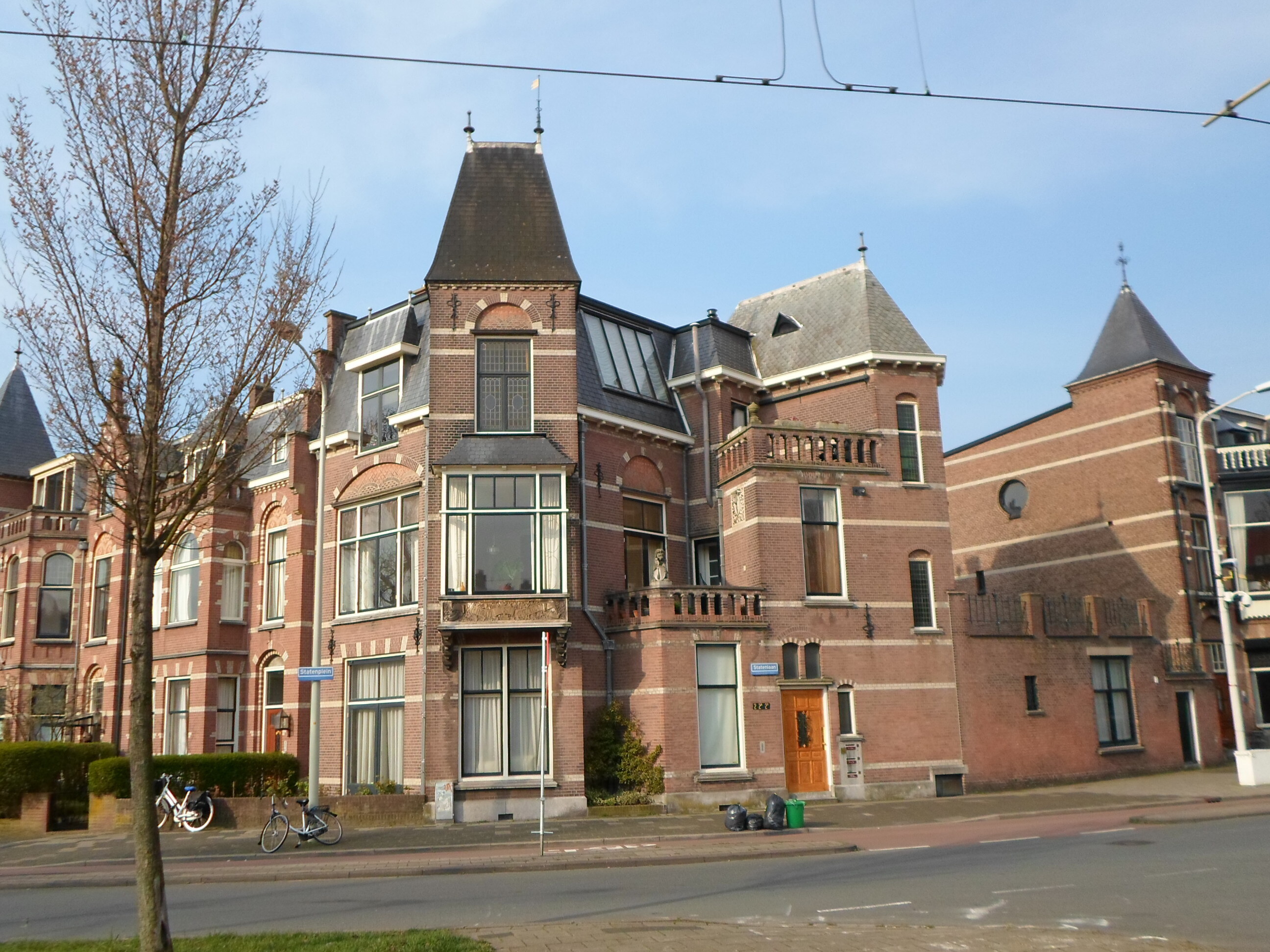 De architectuur wordt gekenmerkt door een sterk verspringende rooilijn, bouwblokken van verschillende hoogten die ten opzichte van elkaar verspringen en een afwisseling van kappen met hoge dakvormen, beëindigd door pirons. In de rode bakstenen gevels is ter accentuering van neggen, strekken, bogen en sierbanden witte kalksteen toegepast. In de gevel bevinden zich diverse venstervormen, balkons met gemetselde boogvormige balkonhekken en een overhoeks geplaatste erker op de verdieping. De erker heeft een gebeeldhouwd hardstenen basement met de tekst "Arbeid is genot". De hoge dakkapel links doorsnijdt aan de onderzijde de gootlijst. Net onder het balkon op de eerste verdieping is een ingemetselde gevelsteen met runderkop, wapen en jaartal 1902 te zien. Op de hoek is een hardstenen leeuw met wapenschild geplaatst. De lage bakstenen muur die de scheiding vormt tussen straat en tuin is in later tijd vernieuwd.