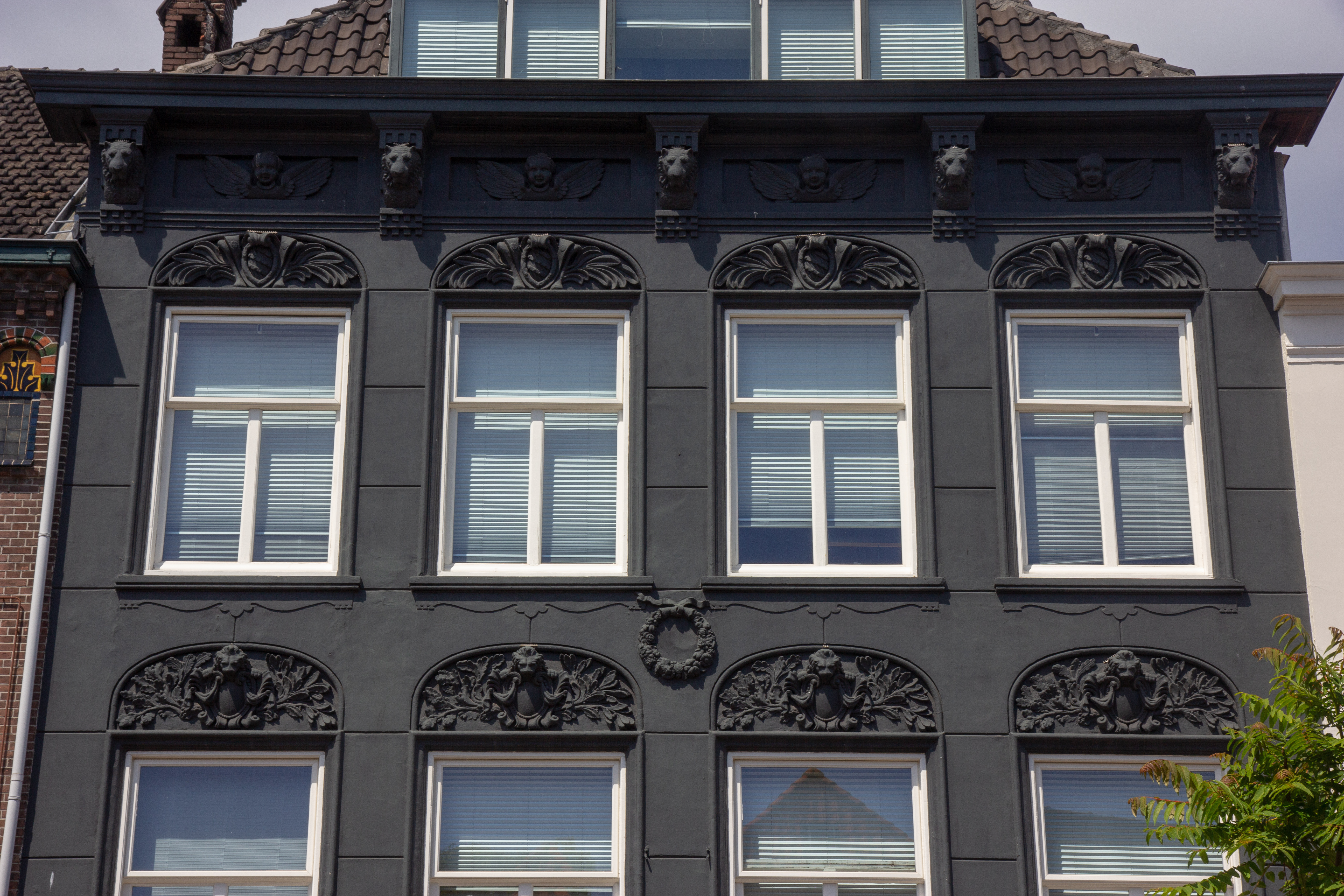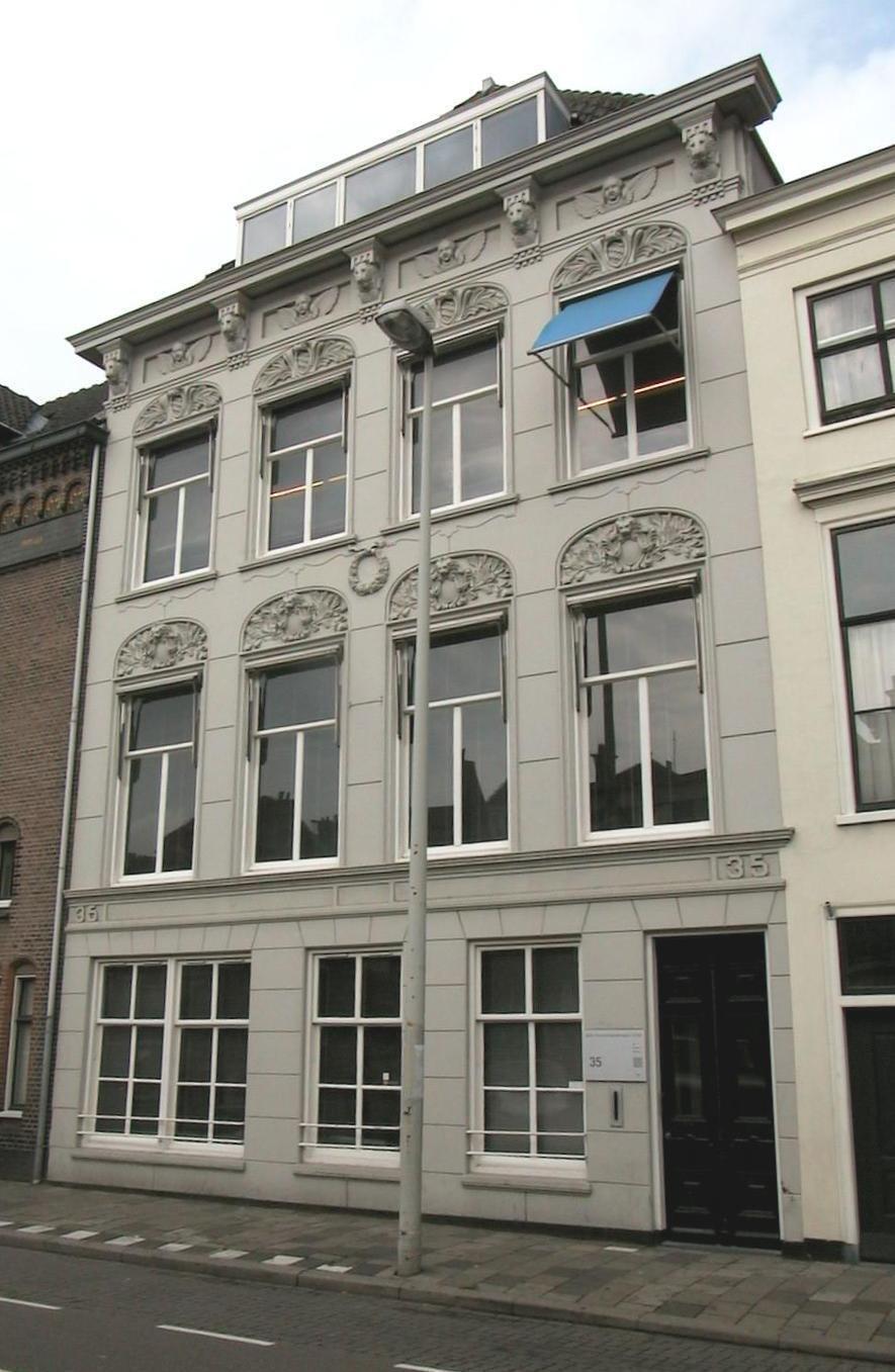 Pand ter breedte van vier vensterassen en bestaande uit parterre met twee verdiepingen. Lijstgevel uit het derde kwart 19de eeuw in eclectische trant. Ontlastingsbogen met stucwerkversiering in de boogtrommels. Hoofdgestel met kroonlijst op consoles met leeuwenmaskers en fries met puttokopjes.
