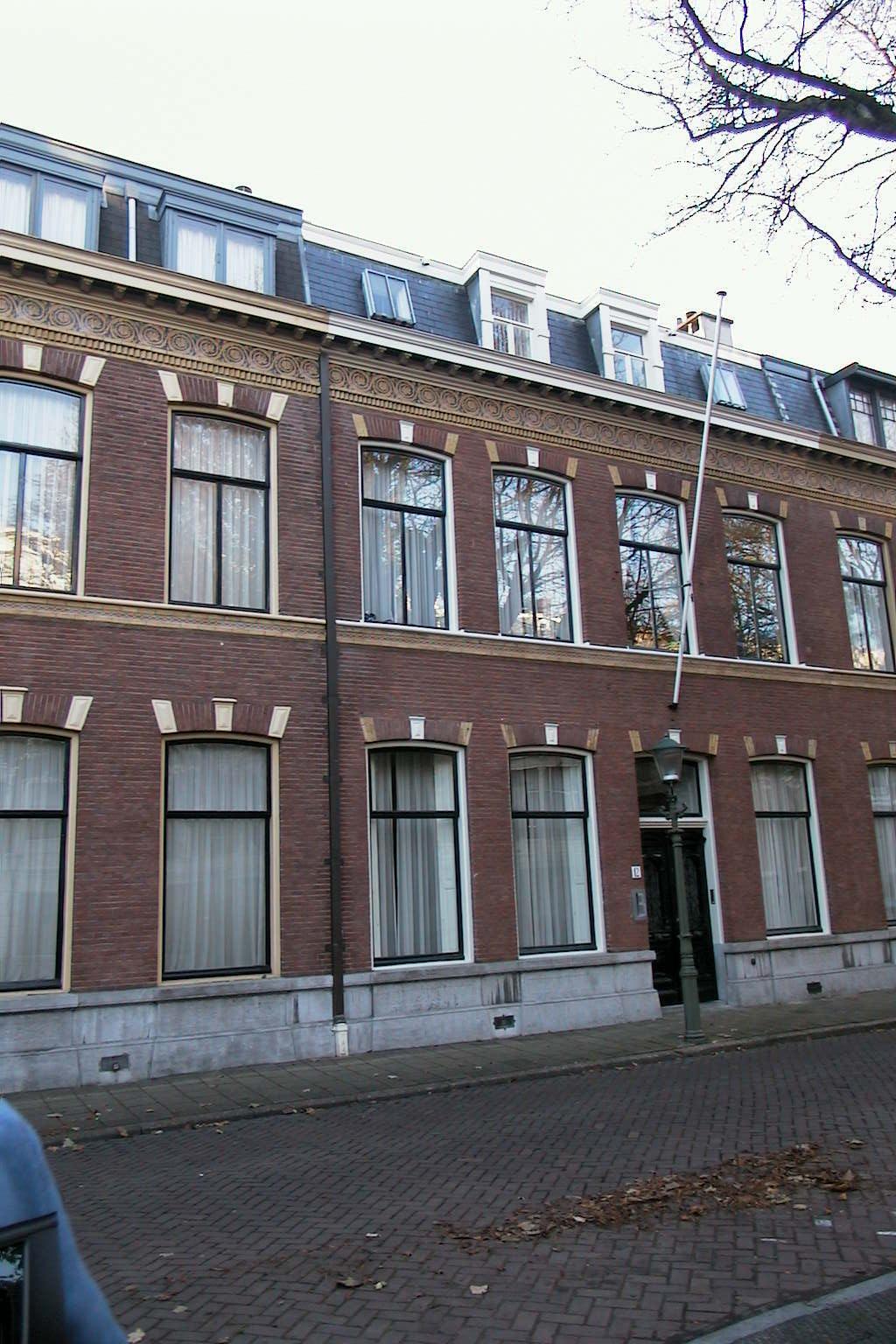 Pand ter breedte van vier vensterassen, bestaande uit parterre en verdieping, gebouwd 1881-1883, vermoedelijk door C.J. van Roode Jr. Lijstgevel van rode baksteen met hardstenen plint, waterlijst en houten kroonlijst op consoles. Onder de waterlijst en de kroonlijst tegeifriezen, waarvan de bovenste acanthusranken vertoont. Voordeur uit de bouwtijd, ca. 1885.
