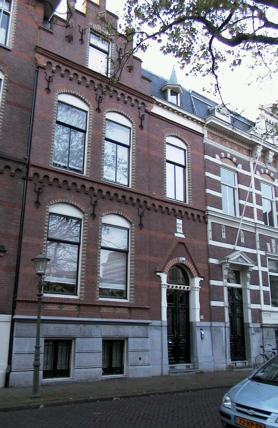 Pand, bestaande uit souterrain, belétage en één verdieping. Gevel in neo- romaanse trant, 1889. Souterrain in hardsteen gebosseerd met vensters waarvoor gietijzeren raamhekken. Deur uit de bouwtijd in zandstenen omlijsting met door kapitelen gedragen toog waarin masker, omvat door een wimberg met gebeeldhouwde bekroning. De vensters van de belétage en de verdieping hebben ontlastingsbogen in gekleurde steen. Onder de verdieping een boogfries. Sierankers. De linker vensterassen zijn opgevat als risaliet en worden bekroond door een afgeknotte trapgevel met overhoeks geplaatste pinakels, gedragen door maskerkraagstenen. Architect: C.J. van Roode.
