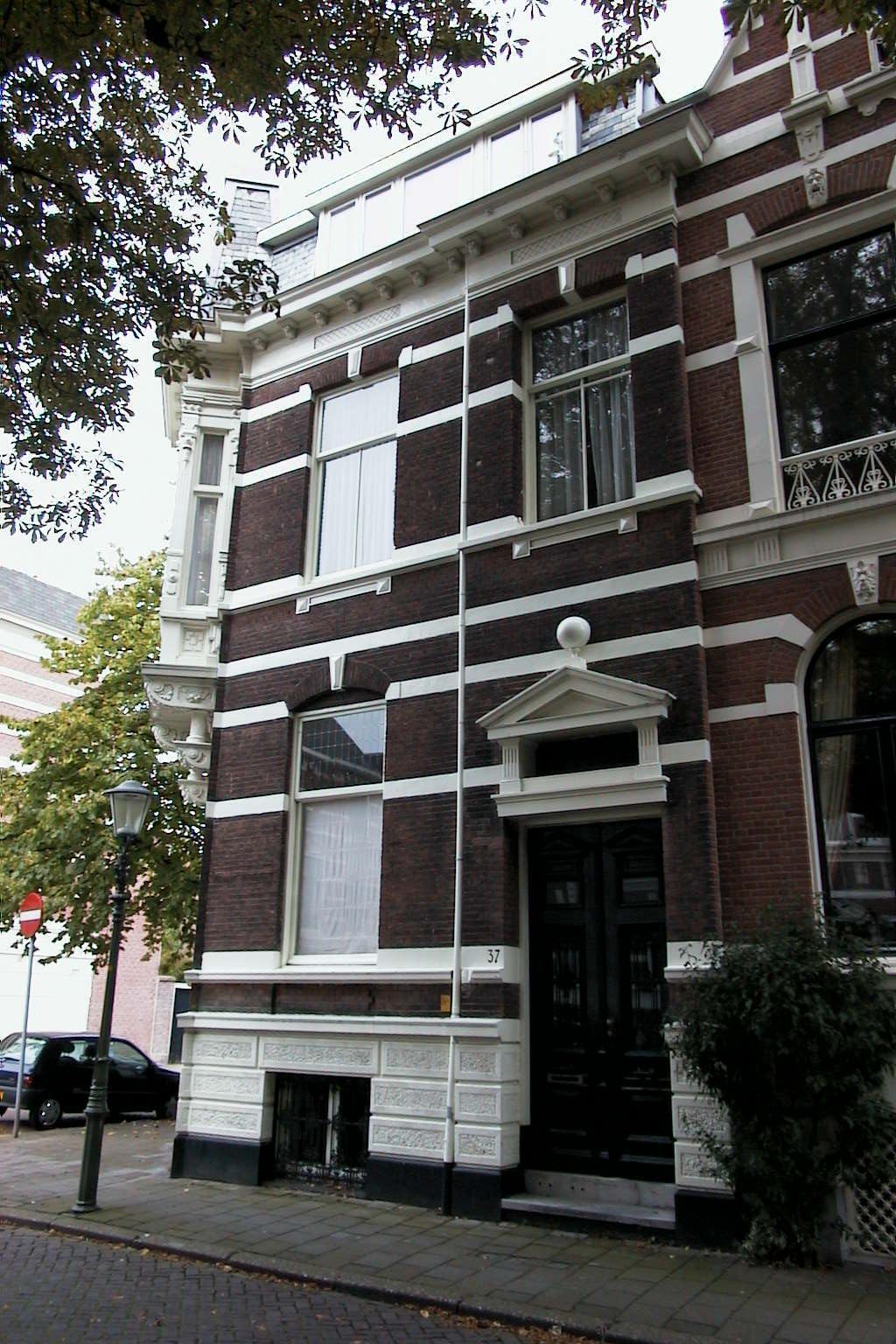 Hoekpand uit 1889-1890, bestaande uit souterrain, belétage en verdieping. De neorenaissancegevel heeft een met bossagepleister versierd souterrain en wordt verlevendigd door gepleisterde banden en sluitstenen boven de vensters. Kroonlijst met consoles, deur uit de bouwtijd met bovenlicht waarop een frontonbekroning. Op de hoek een erker met rolwerkversiering gedragen door een uit consoles en geschroefde zuiltjes samengestelde ondersteuning. De zijgevel heeft een versiering met gepleisterde banden. Architect: waarschijnlijk Th.J. Besseling.