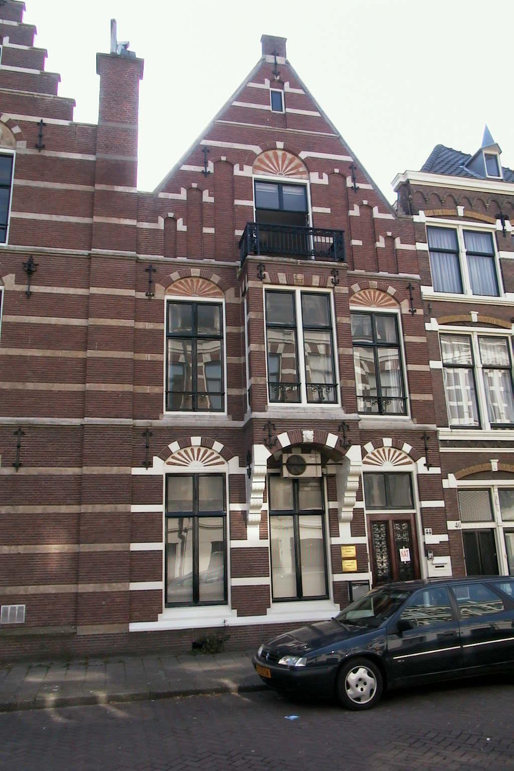 Pand, bestaande uit parterre, verdieping en zolderverdieping, gebouwd naar ontwerp van rijksbouwmeester C.H. Peters in 1880-1881. Puntgevel in neorenaissance-stijl met natuurstenen banden, nissenversiering, ontlastingsbogen met waaierornament, sierankers en erkeruitbouw op consoles. Gietijzeren sierhek als bekroning op de erker; gietijzeren raamhekjes voor de verdiepingsvensters. Deur uit de bouwtijd. In dit pand een vloer- mozaiek in de gang, gedateerd 1883, alsmede tegeltableaux van polychrome tegels, 17de eeuw.