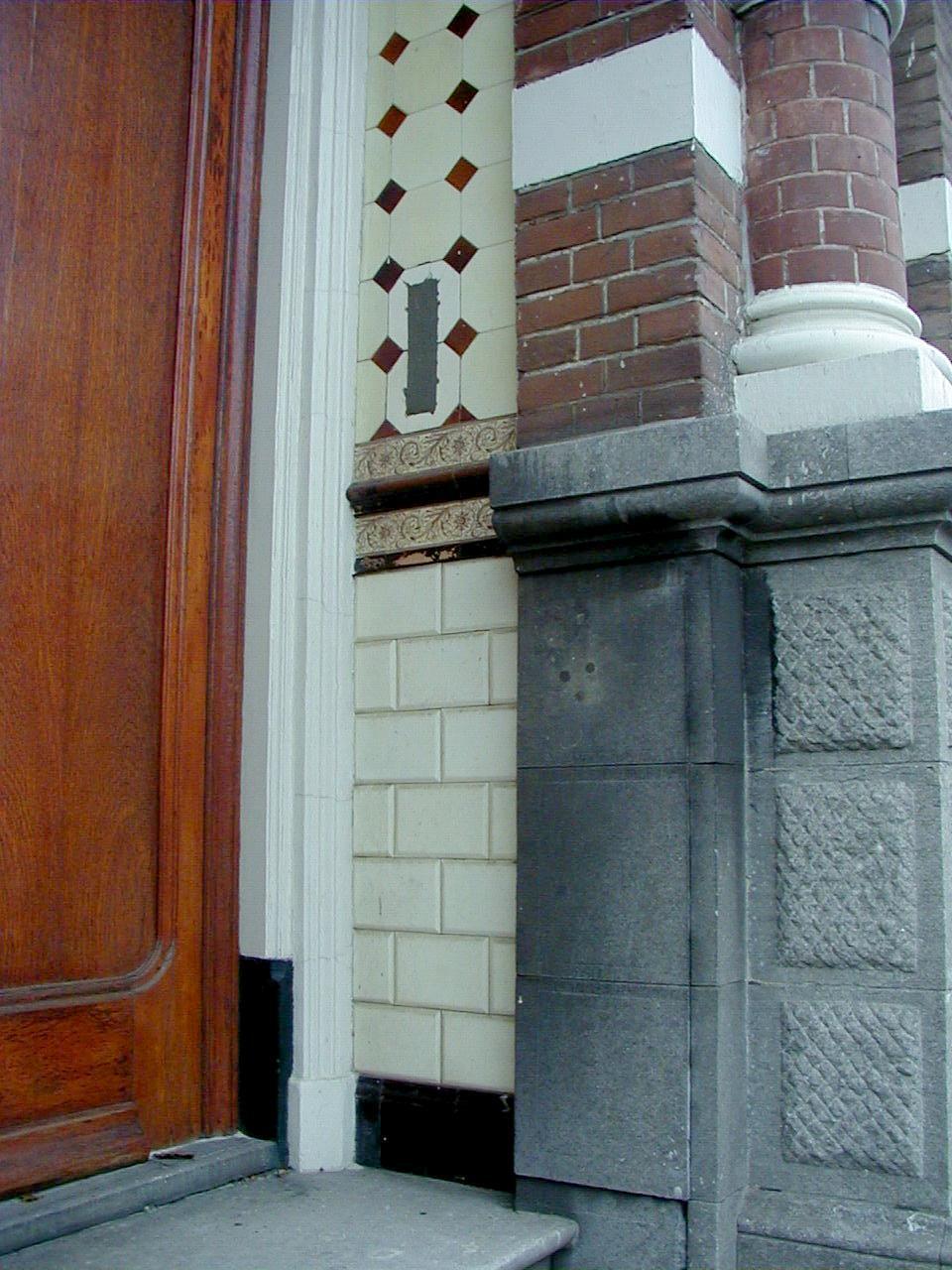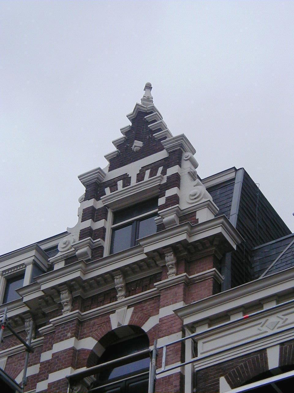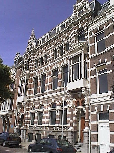 PAND in neo-renaissance trant uit het eind van de 19e eeuw, versierd met banden, geblokte strekken en boven de risaliet een topgevel.
