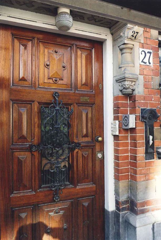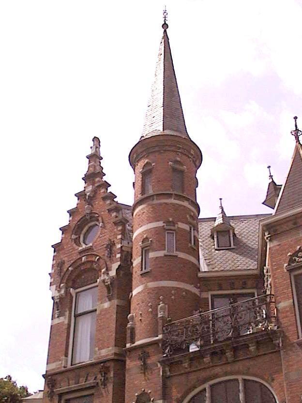 Nr 3 heeft een arkeltorentje rustend op een zandstenen kolonnet, bekroond door een open houten lantaarn met spits. Rechts een erker met snijwerk, gedragen door zandstenen consoles.