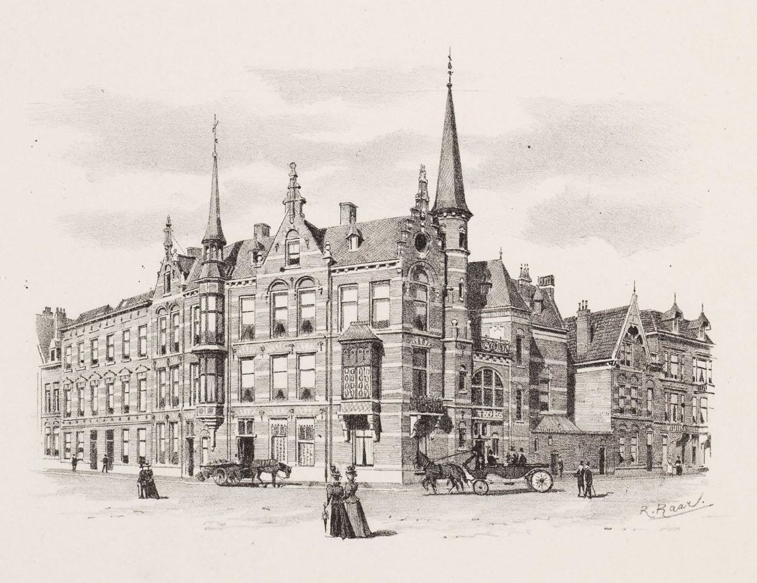 Punt- en trapgevels, ontlastingsbogen op kapitelen, boogtrommel met vlechtwerk, alles in de trant der Hollandse vroege renaissance. Aan de Banstraat een veelhoekige toren met naaldspits.