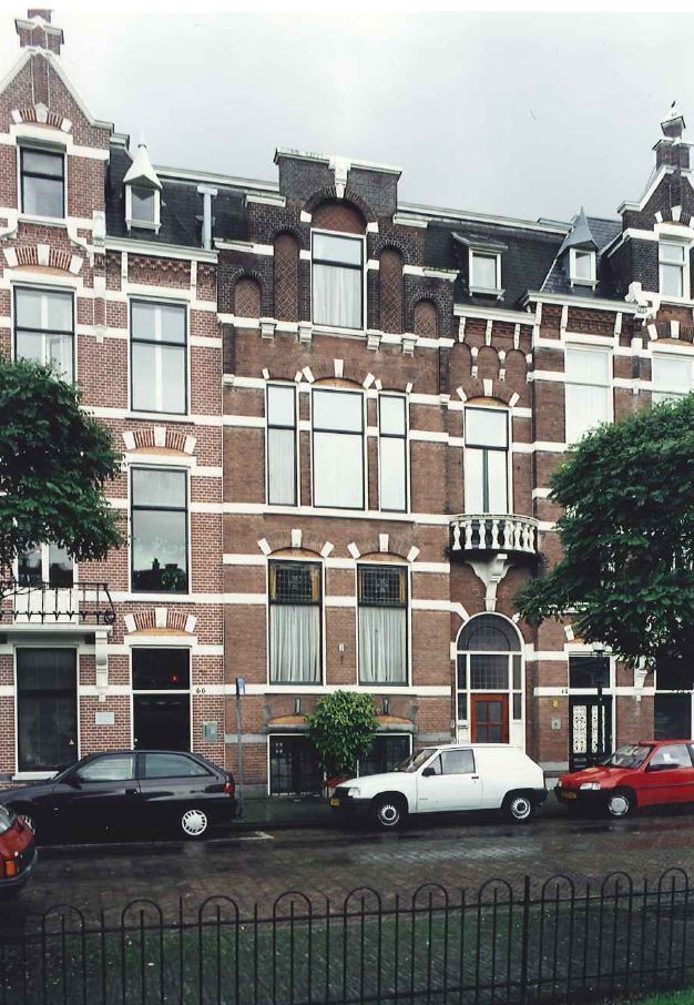 Rechts een terugliggende ingangspartij met boogfries en balcon met balustrade.