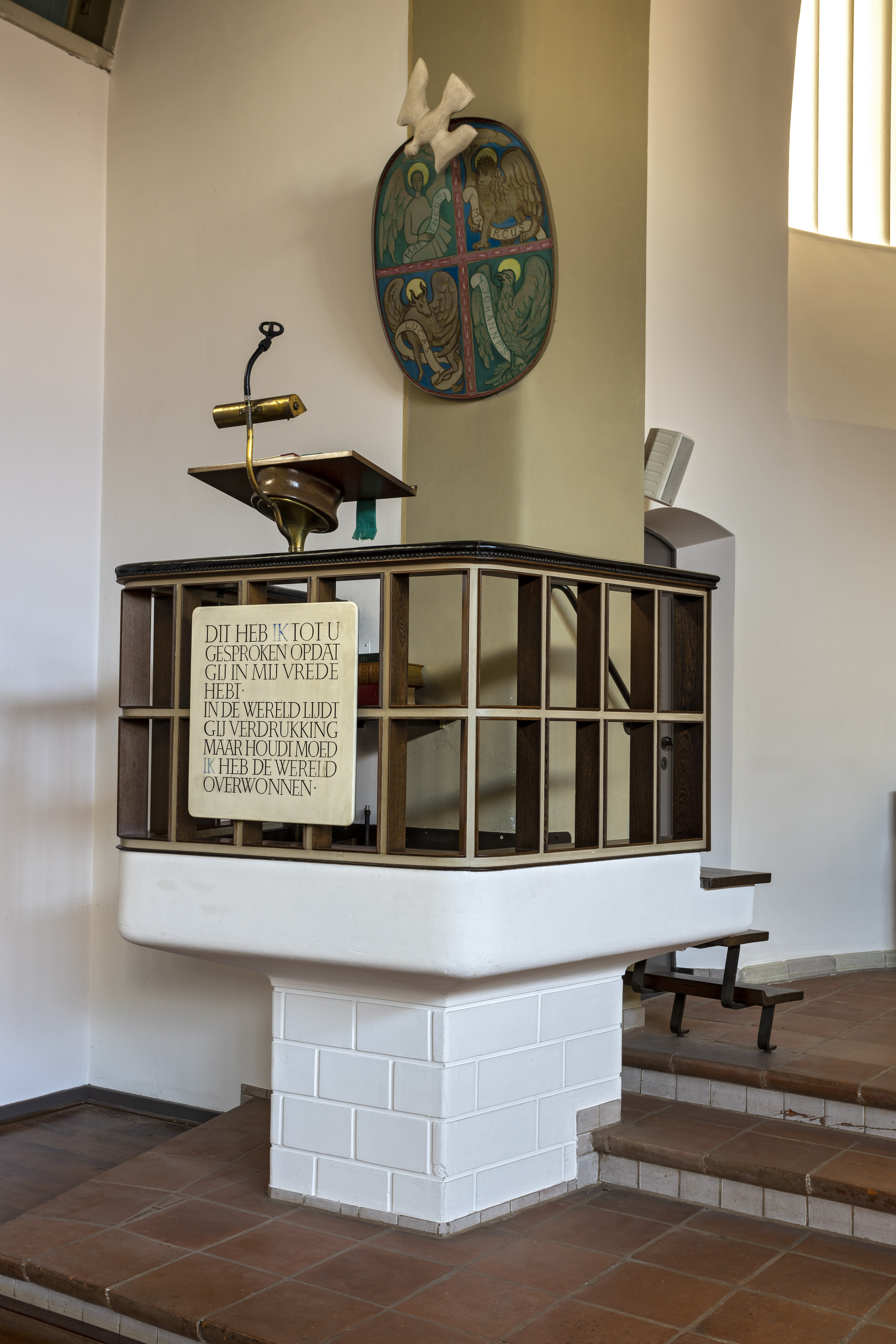 De kerk bevat nog tien ovaalvormige, eenvoudige panelen uit de bouwtijd, bevestigd aan de zuilen die het middenschip van de zijbeuken scheiden. De oorspronkelijke knielbanken zijn verwijderd, maar twee losse exemplaren zijn als aandenken bewaard. Op de triomfboog, kansel en het gezangbord is belettering aangebracht. Het orgel, met 23 registers, is van Mense Ruiter (Groningen) en stamt uit 1952.
