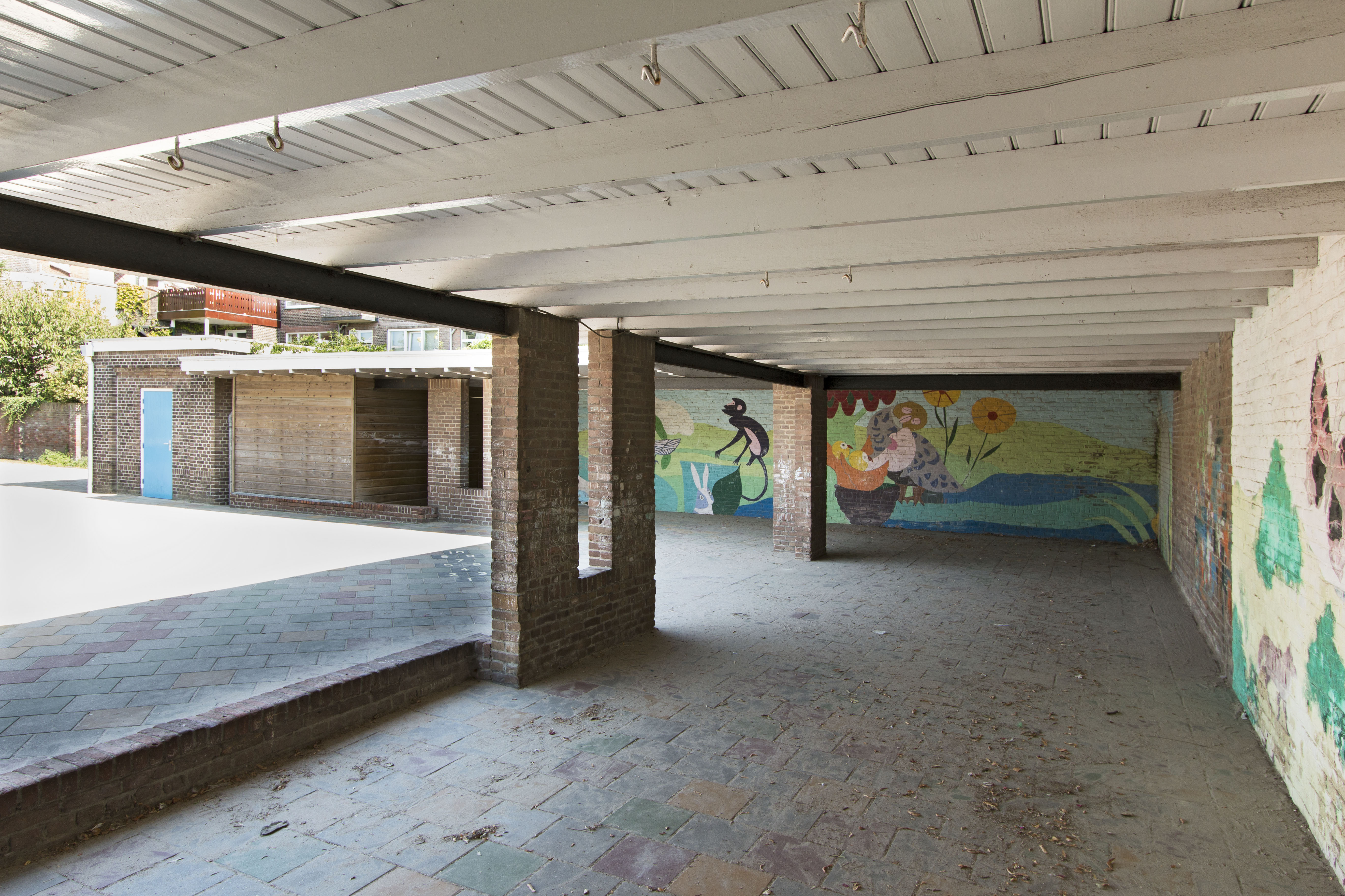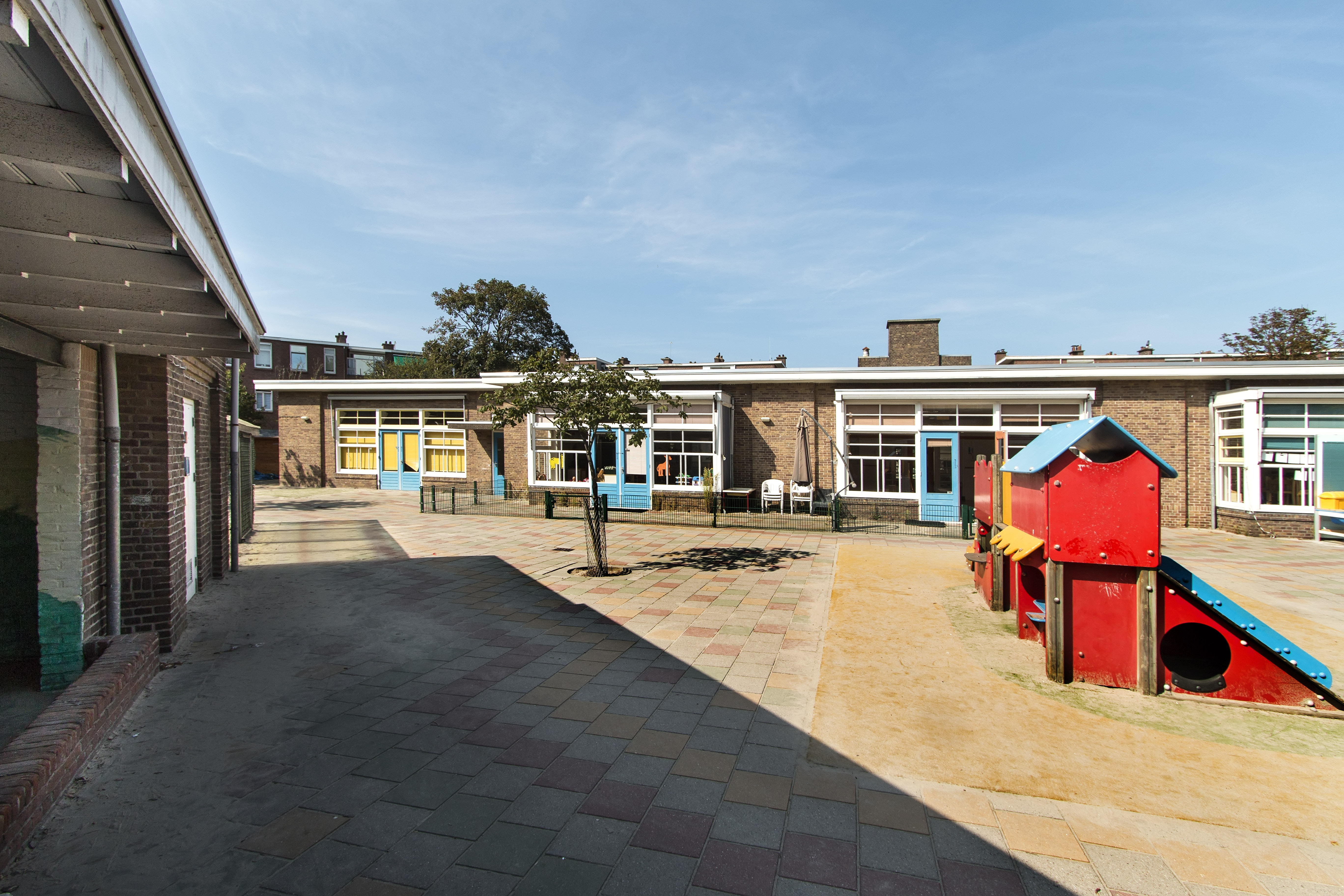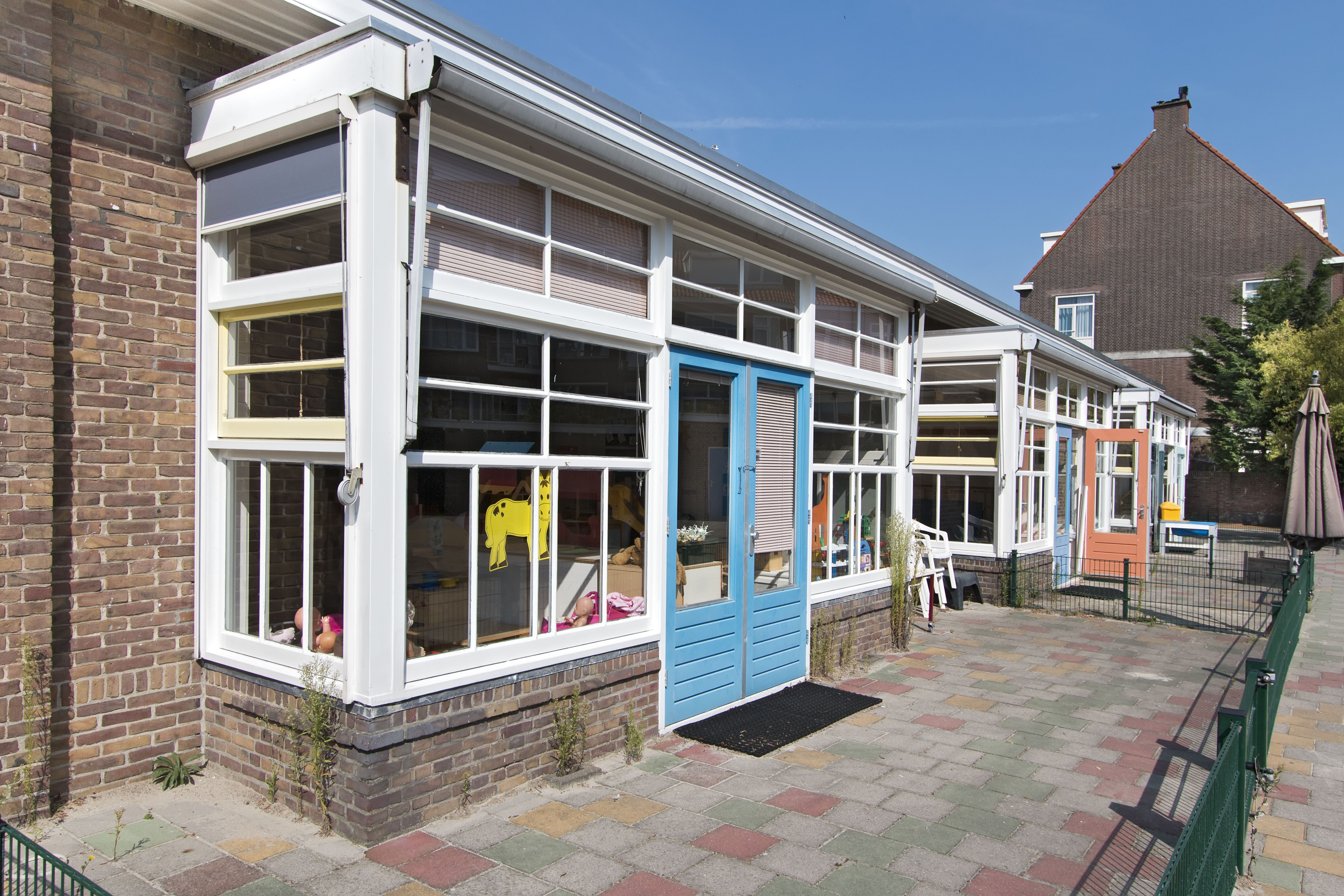 De vestibule komt uit op de gang, ‘huppelgang’ genoemd, waaraan drie leer- en speellokalen grenzen. Deze zijn alle drie voorzien van een lichte rechthoekige erker die uitkijkt op de speelplaats. Aan de uiteinden van de school zijn nog vier leer- en speellokalen, twee aan iedere zijde. De speelplaats loopt uit in een hoek van 90 graden en die hoek is benut voor een overdekte speelplek met twee zandbakken en bergingen. Zowel aan het exterieur als aan het interieur is weinig gewijzigd.