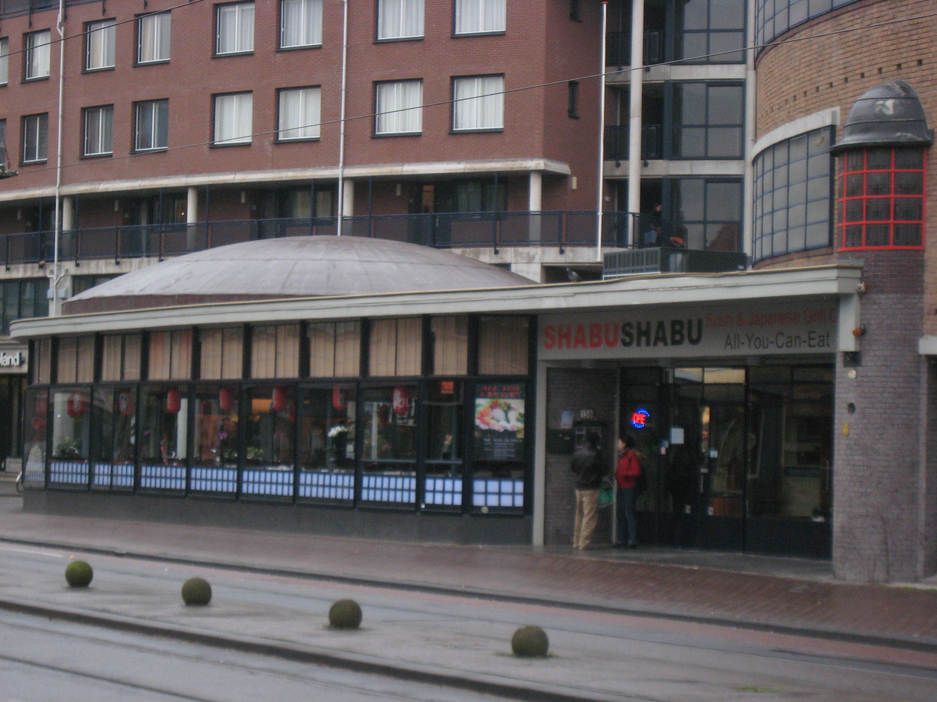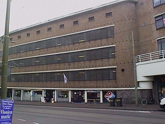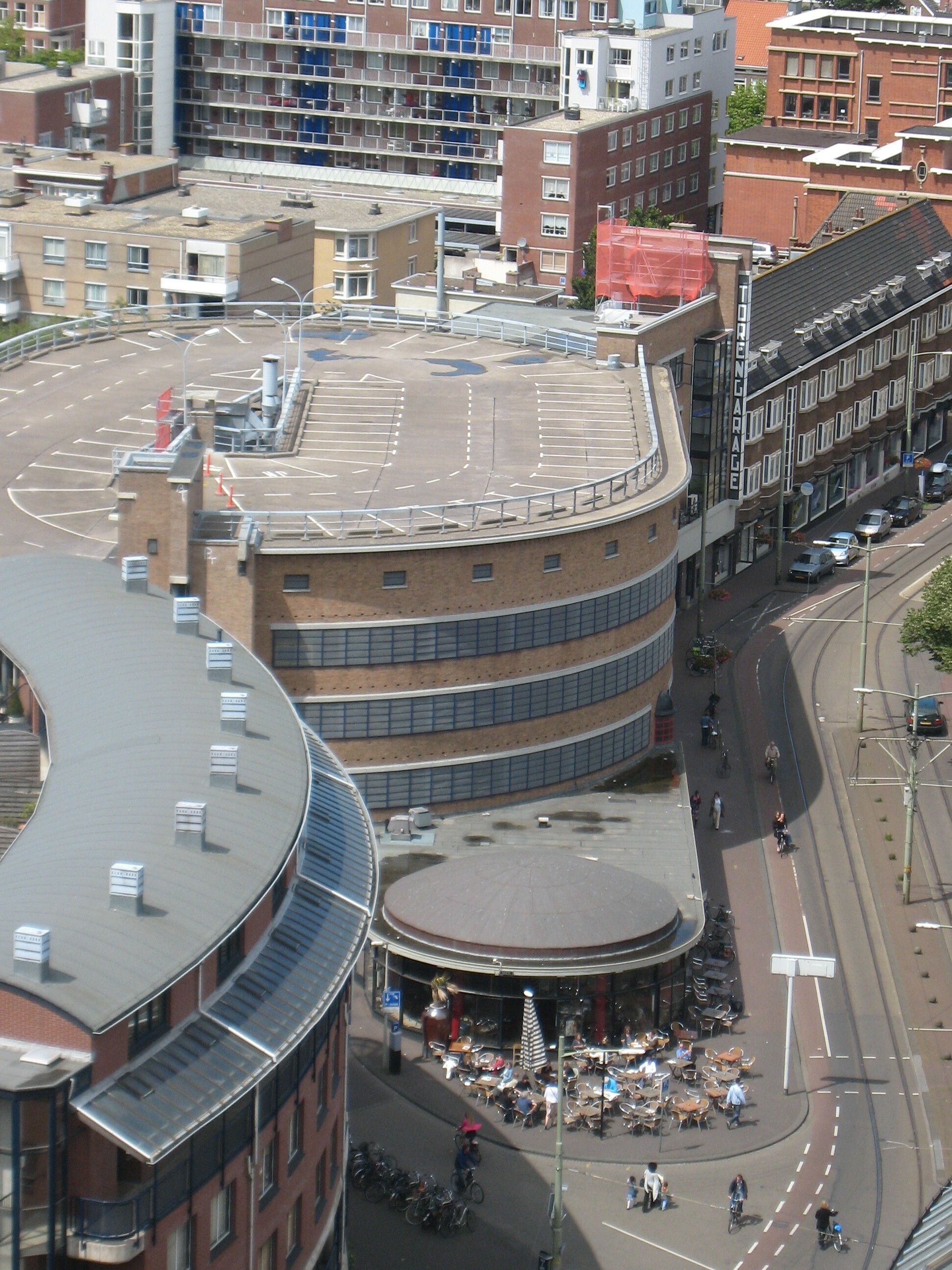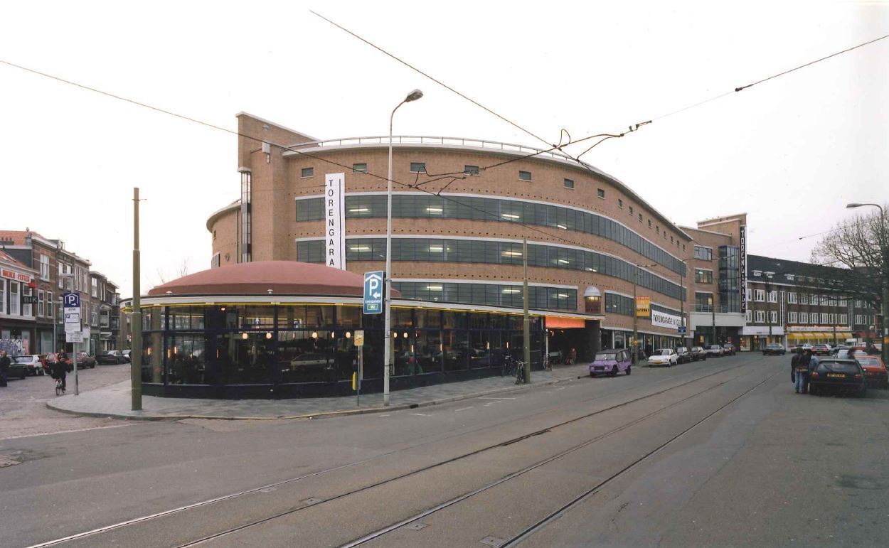 Onderkelderd GARAGEGEBOUW met vijf hellende bouwlagen gegroepeerd rondom een wigvormige lichthof en met uitgebouwde showroom, werkplaatsen en kantoren, opgetrokken met behulp van een betonskelet op een grondslag van een onregelmatige ellips, met bakstenen muren waarbij de inwendige hellingbanen - die per bouwlaag een hoogteverschil van 3 m.overbruggen - worden weerspiegeld in de schuingeplaatste vensterstroken die over vrijwel de volle gevelbreedte op de eerste, tweede en derde verdieping zijn aangebracht - onderbroken bij het trappenhuis dat aan het Z-einde van de circa 60 m. lange lengte-as tegen de meest uitstulpende gevelwand is gesitueerd - uitgevoerd in 1929-'30 naar ontwerp van J.Greve in een expressionistisch getinte, zakelijke stijl.