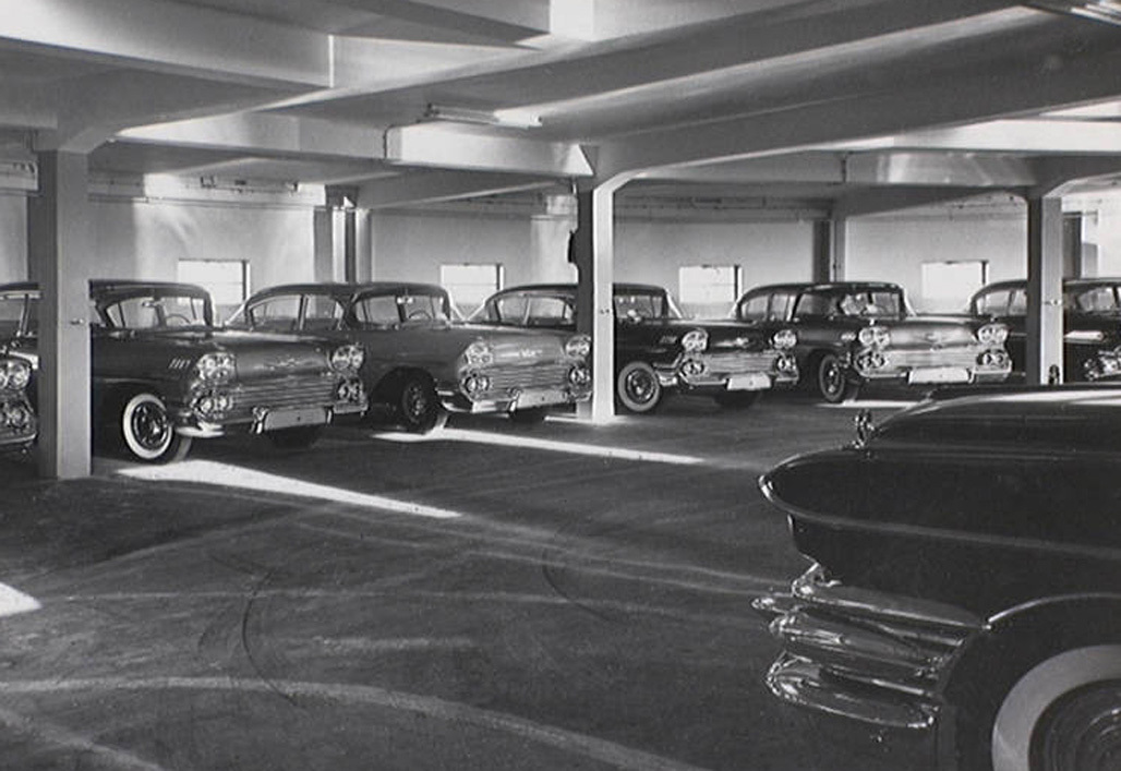 Inwendig wordt de garageruimte door de betonnen kolommen in drie beuken verdeeld, waarbij de rijbaan in het midden is gesitueerd en de parkeerplaatsen te weerszijden; in oorsprong waren op de eerste, tweede en derde verdieping een twaalftal boxen rondom de lichthof ingericht, terwijl de vierde verdieping uitsluitend boxen bevatte, vierenvijftig in totaal.