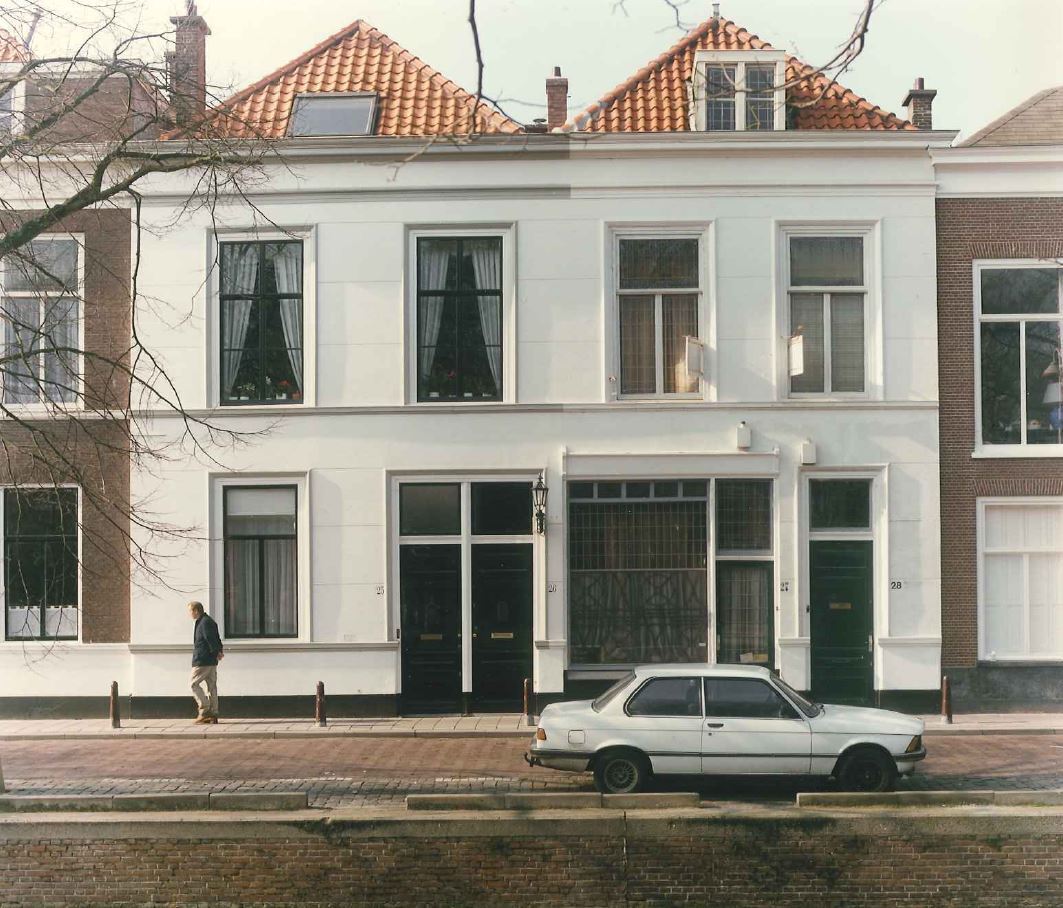 Woon-winkelpand uit 1862, oorspronkelijk twee huizen, bestaande uit parterre en verdieping met twee, door pannen gedekte schilddaken waarvan de nok loodrecht staat op de straat De lijstgevel is voorzien van een geblokte bepleistering. De nummers 25 en 26 zijn toegankelijk door twee gekoppelde deuren met panelen en bovenlichten. De parterre van 27 en 28 bezit een etalageraam en een deur met panelen en bovenlicht. Het venster in de linker travee bevat een T-raam; de verdiepingsvensters bezitten zesruitsschuiframen. Alle vensters en deuren zijn gevat binnen geprofileerde, houten omlijstingen. In de gevel van no. 25 bevindt zich een stichtingssteentje met het opschrift: "JW. HK 24-9-1862".