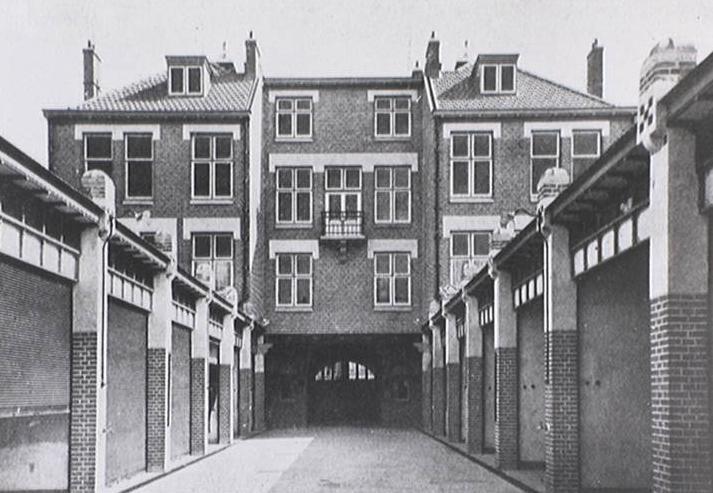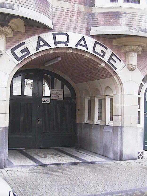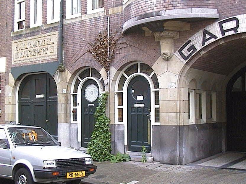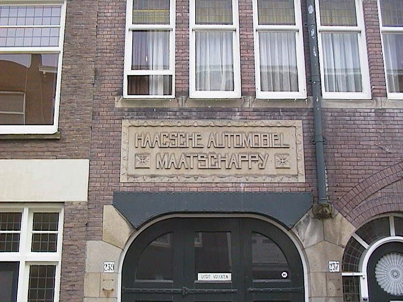 Garage met bovenwoningen uit 1911 van de architect W. Greve jr. bestaande uit twee bouwlagen en een kapverdieping. De symmetrisch opgebouwde gevel is zorgvuldig afgewerkt. In de eindtravee zijn brede inrijpoorten, waarboven aan elke zijde een forse gevelsteen, waarop de tekst " Haagsche Automobiel Maatschappij" is aangebracht. De in het midden gesitueerde brede doorgang (ter rechterzijde gesigneerd door de architect) naar de op het binnenterrein gelegen authentieke garageboxen, wordt aan beide zijden geflankeerd door de gekoppelde rondboogvormige ingangen van de bovenwoningen. De oorspronkelijke deuren zijn nog aanwezig. De begane grond bezit een hoge hardstenen plint. De penanten tussen de verschillende openingen van de begane grond zijn bekleed met hardsteen. In de gevel is op meerdere plaatsen beeldhouwwerk toegepast, ondermeer aan de onderzijde van de twee ronde erkers ter hoogte van de verdieping. In de kap zijn twee driezijdige dakkapellen.
