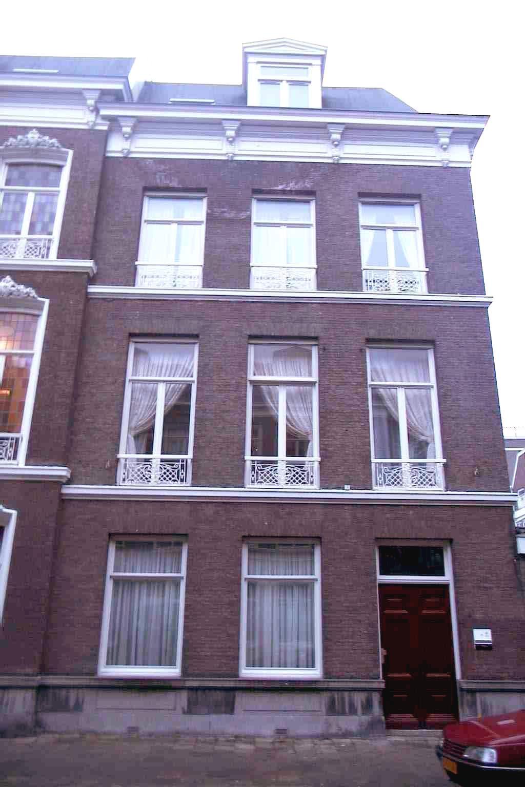 Rechter hoekpand van een symmetrisch ontworpen groep van drie eclectische herenhuizen, waarvan het middelste pand, Van de Spiegelstraat 16, als risaliet is uitgevoerd.