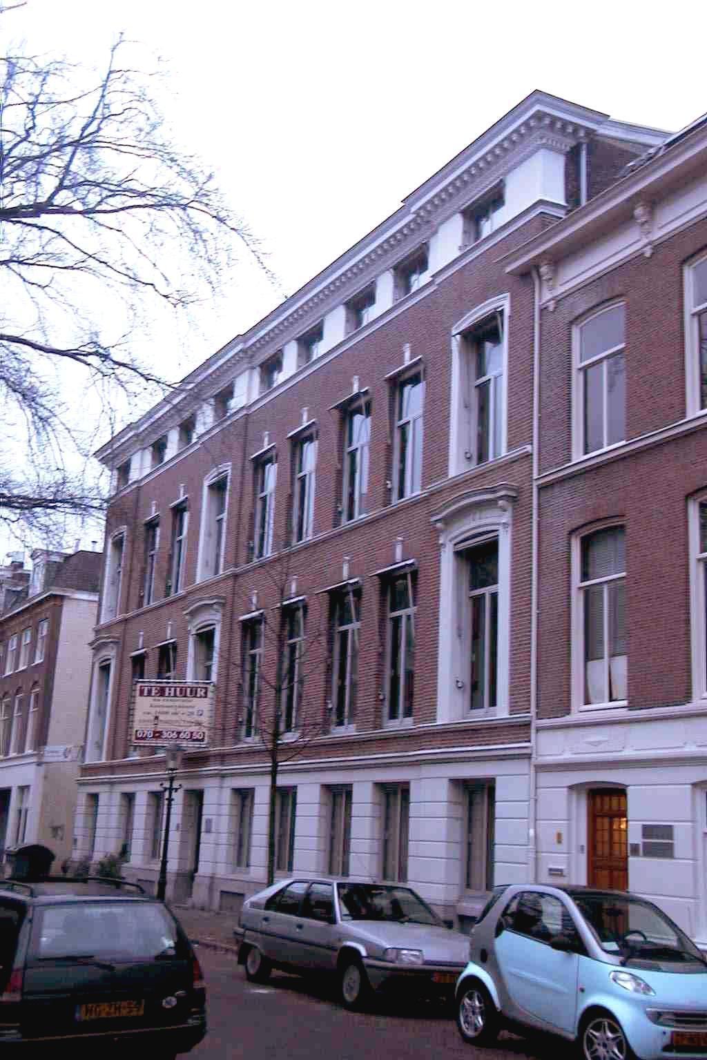 Statig pand uit ca. 1880 met negen assen brede lijstgevel in eclectische trant. Parterre, twee verdiepingen en zolderverdieping. De gevel wordt geleed door drie risalieten. De parterre heeft een zwart geschilderde, met hardsteen beklede ondergevel. Hardstenen plint; deur uit de bouwtijd met smeedijzerwerk van latere tijd (ca. 1900). De vensters in de risalieten bezitten geprofileerde omlijstingen en getoogde hoofdgestellen op maskerconsoles; de andere vensters hebben sluitstenen van stucwerk. In het fries liggende vensters. Houten kroonlijst met klossen en tandingen.