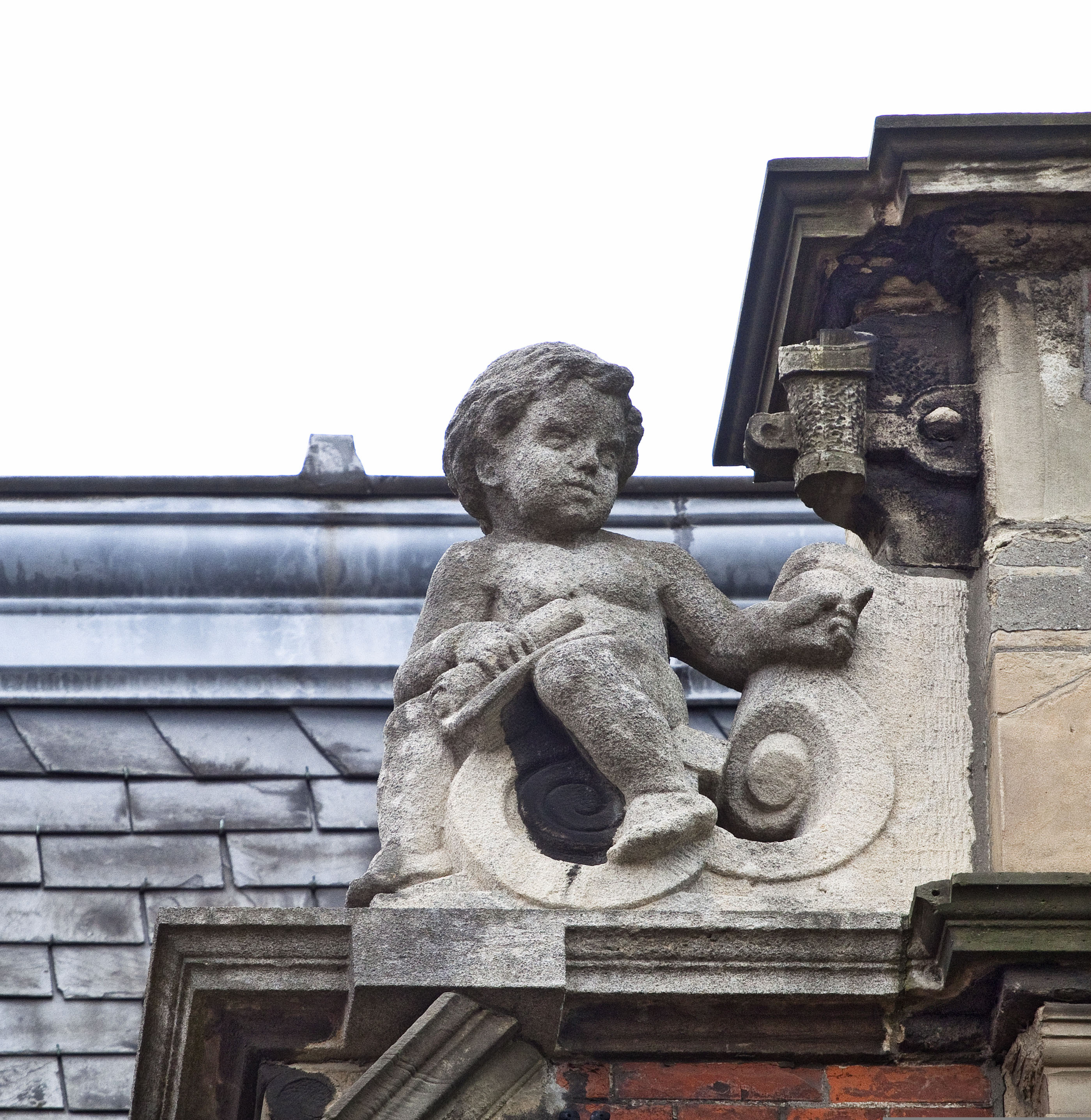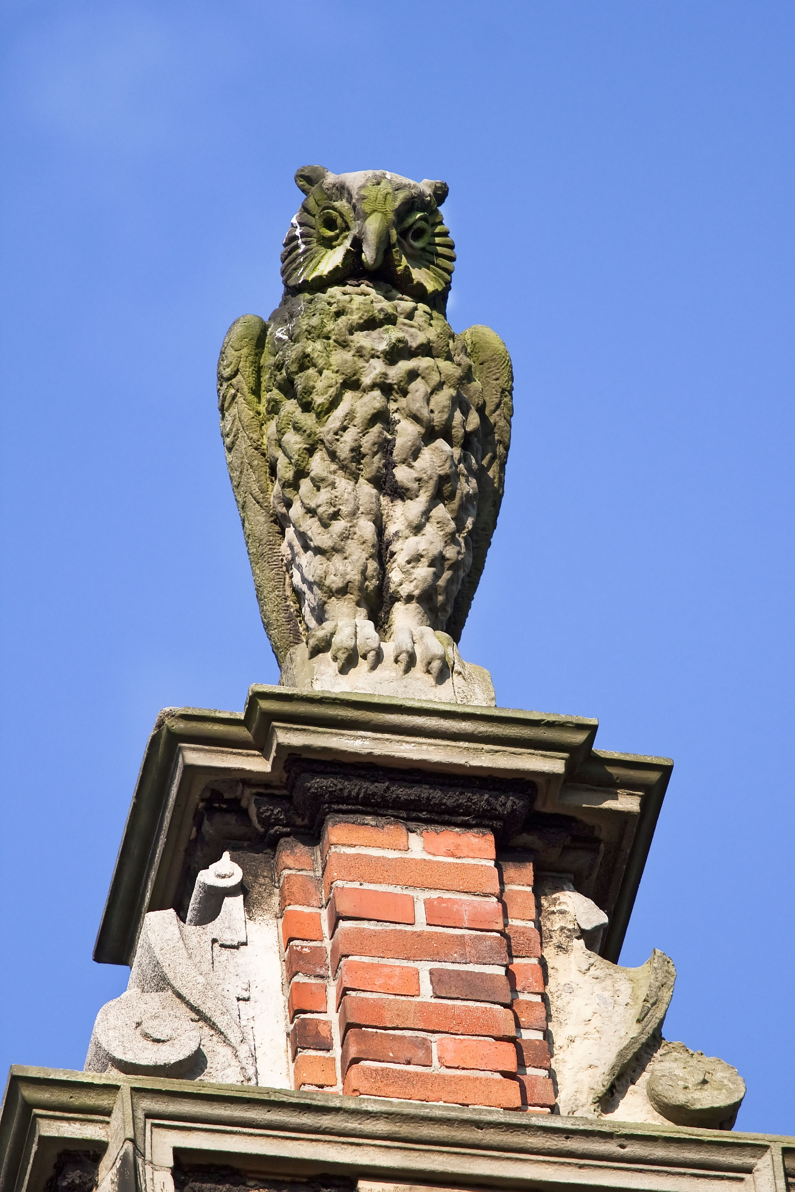Het pand bestaat uit twee bouwlagen plus zolderverdieping onder omgaand geknot leien dak. Gevel van rode verblendsteen met rijke detaillering, veelal in natuursteen; breedte vier brede vensterassen en twee smalle traveeën ter rechterzijde; dubbele deuren (vierde as van links) uit de bouwtijd, met drie rondboogvensters in rijk gebeeldhouwde natuurstenen omlijsting; hierboven en boven de vensters in de rechter twee assen gebeeldhouwde natuurstenen boogvullingen; de twee smalle assen rechts hebben een puntgeveltop die bekroond wordt door een uil; halverwege op de natuurstenen afdeklijsten putti en consoles; links vier tot trapgevels uitgewerkte dakkapellen; geheel rechts een rondboogpoort met toegang tot achtererf; rijke detaillering blijkt verder uit o,a. zaagtandfries onder de gootlijst en fraaie smeedljzeren sierankers.