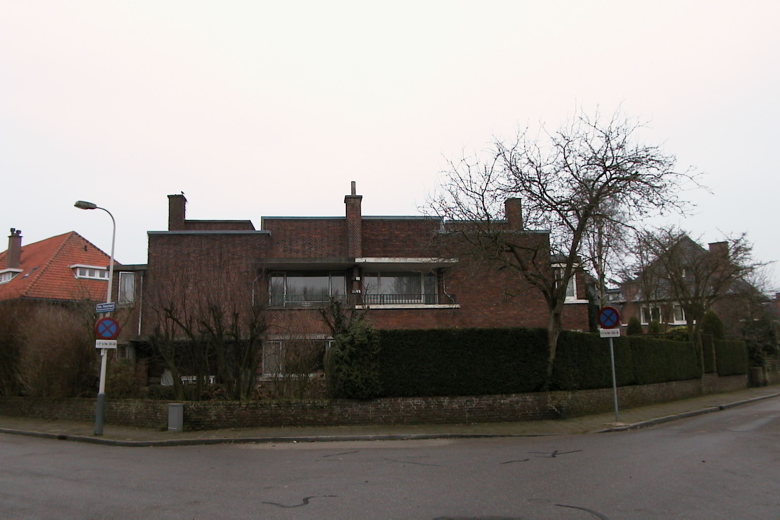 Twee geschakelde herenhuizen die onder een hoek van 45 graden ten opzichte van de rechthoekige kruising liggen, bestaan uit twee bouwlagen onder platte daken. Kenmerkend voor de hier uitgevoerde rode baksteenarchitectuur is onder meer de kubistische opzet van in elkaar grijpende bouwdelen, verspringende gevelvlakken, de ritmische herhaling van de schoorstenen, de toepassing van overdekte balkons, erkers en terassen, pergola's en lage tuinmuren, de overheersende horizontaliteit in de vorm van betonnen lateien, dorpels, afdekplaten en luifels en het aansmeren van horizontale baksteen met zwarte teer. De tuinmuren en de pergola's vormen een wezenlijk onderdeel van de architectuur waarmee de geleidelijke overgang van binnen naar buiten wordt geaccentueerd. De vensters van nr. 15 zijn van staal; die van 20 van aluminium.