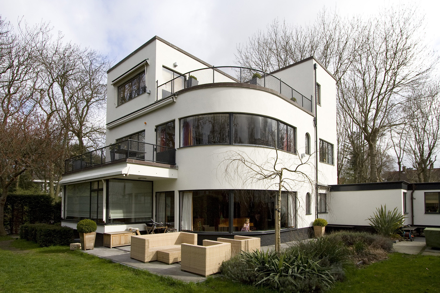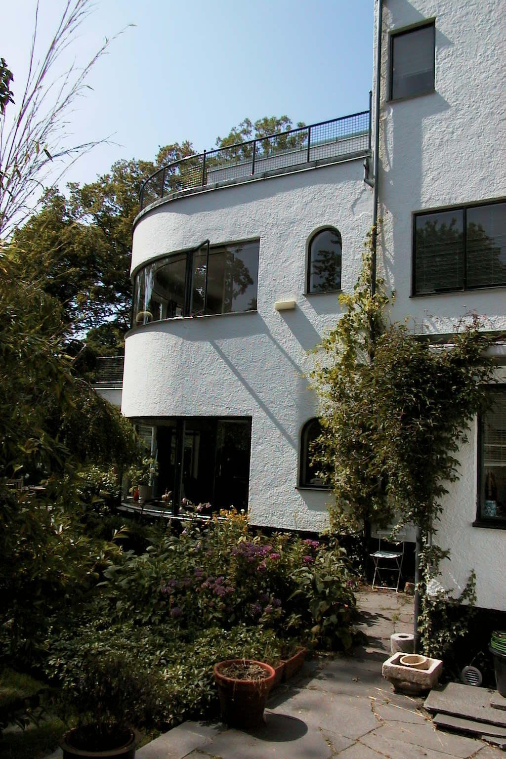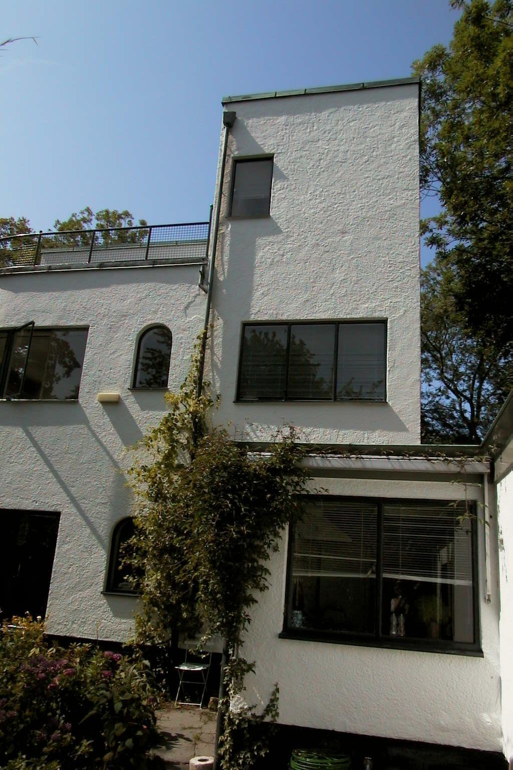 De villa is gebouwd in gewapend beton met witgestucte gevels op een zwarte plint van donker gevoegde, gekamde mangaansteen. De ramen zijn volgens het ontwerp in aluminium uitgevoerd. De ingang in de voorgevel bezit een luifel. In de noordgevel is een rond venster dat het trappehuis verlicht.